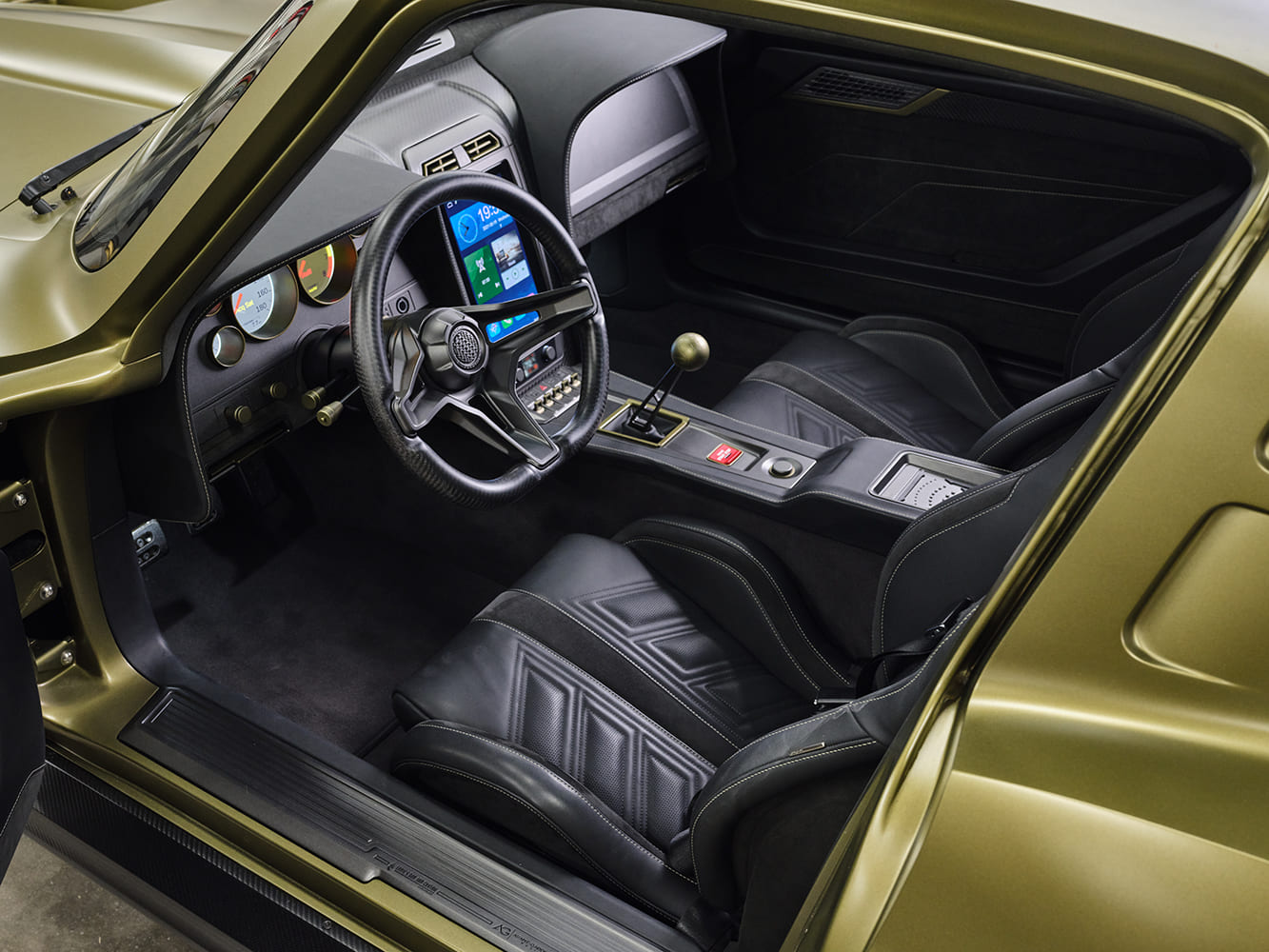 011 1963 Corvette restomod interior digital dash leather buckets carbon accents touchscreen custom steering