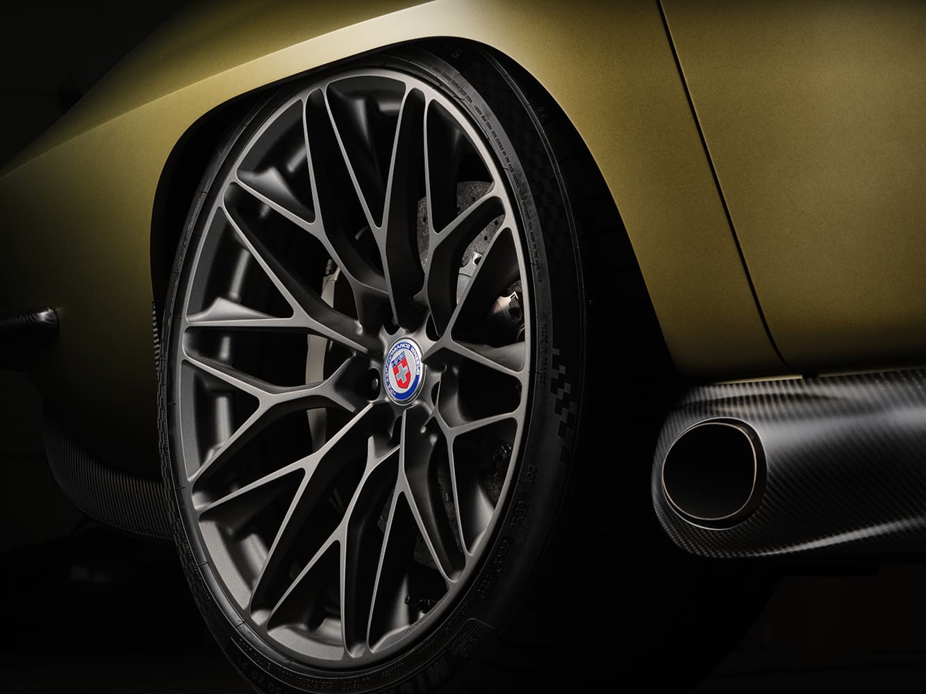 Brembo 16-inch carbon ceramic rotors and six-piston calipers up front combined with 15.5-inch rotors and six-piston calipers out back, respectively, rest behind a set of massive HRE P200 wheels coming in at 20×10.5 up front and 21×12 out back, wrapped in Michelin Pilot Super Sport rubber on all four corners.