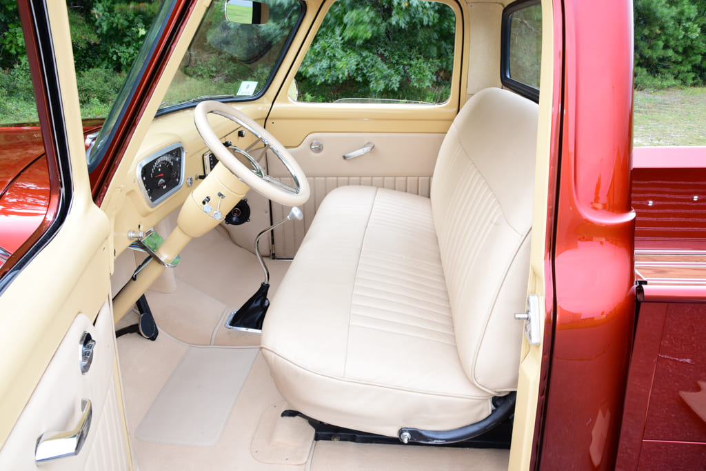 To bring an equal amount of allure to the business office, the restored factory dash was refinished in crème gloss and filled with dials from Classic Instruments to monitor the vitals while a Billet Specialties steering wheel carves a course though an ididit tilt column with gear changes clicking through a Lokar stick. Need to pump up the volume? A Kicker head unit, amp, and speakers fill the cab with ease. For plenty of comfort, Carello Auto Upholstery of Warwick, Rhode Island, recovered the factory bench in soft crème leather with complementing side panels, suede headliner, and carpeting. The completed truck is now seeing plenty of miles cruising through New England with Joe living the dream, and to us that’s as cool as it gets!