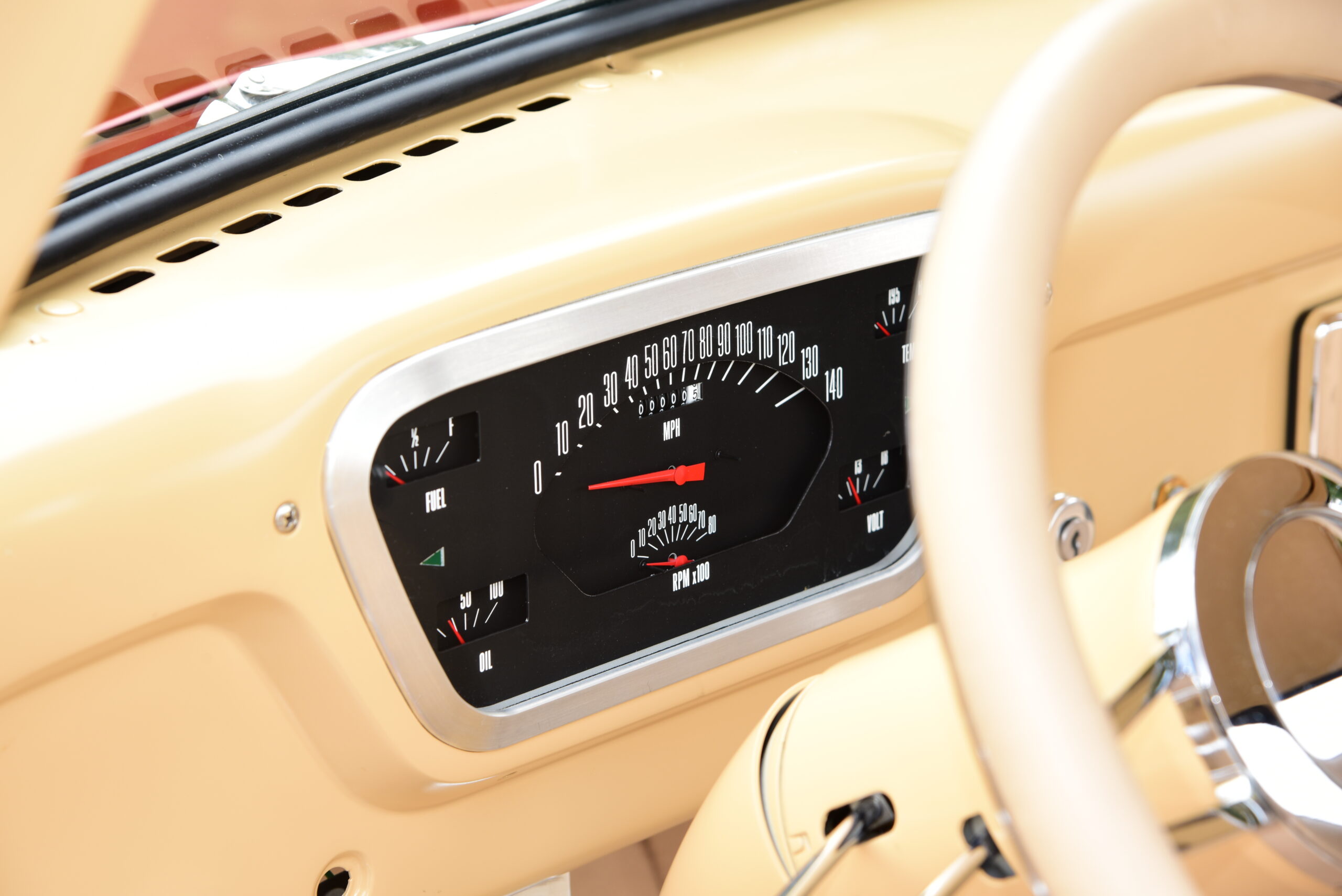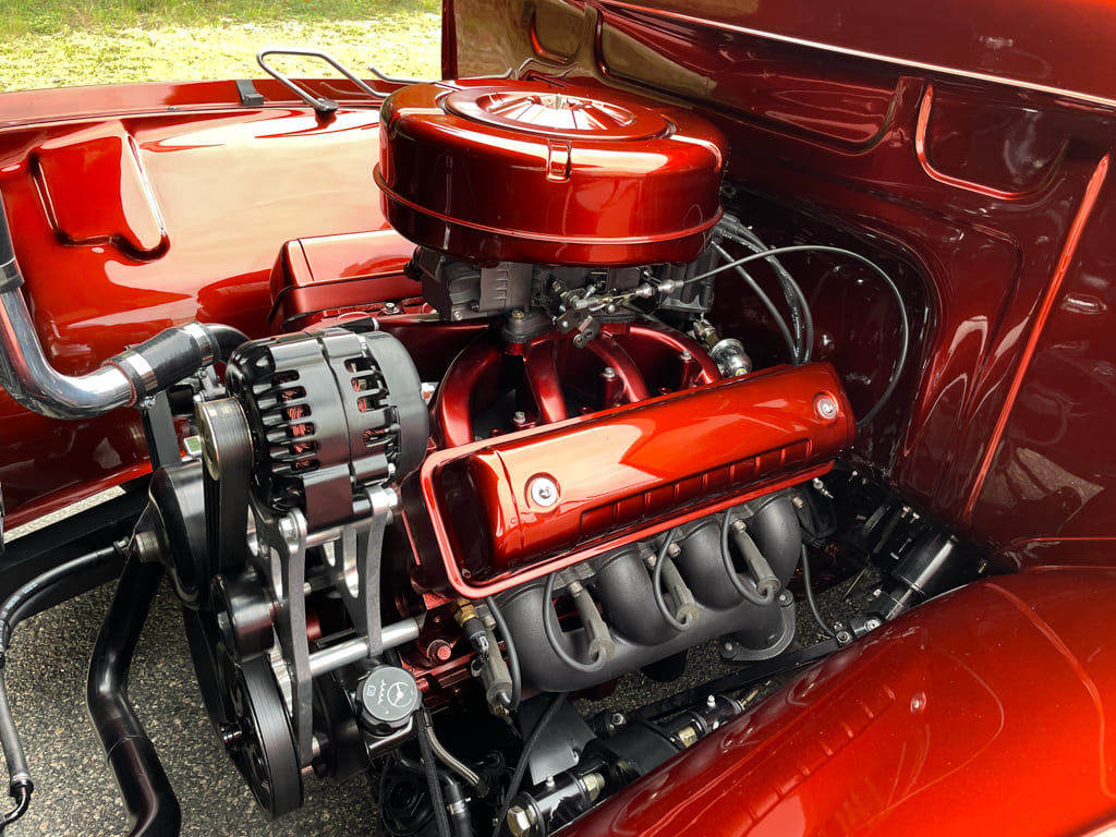 It was obvious the old Flathead needed to go so a call was placed to Don Hardy Race Cars (DHRC) for one of their fire-breathing LS3 V-8s packed with all the right bits to bring the punch to the next level. To get started, a cast-aluminum block with six-bolt, cross-bolted main caps was filled with a nodular iron crank wearing powdered metal rods crowned by hypereutectic aluminum pistons getting bumped by a custom DHRC cam. Up top, a set of aluminum L92 cylinder heads as-cast with 68cc chambers meet a Holley EFI LS single-plane intake crowned with a matching Terminator EFI managed by a Dominator electronics to deliver the power. It all sparks to life through a well-hidden factory ignition deep beneath the faux stock distributor with spent gases roaring through a set of Hooker BlackHeart exhaust manifolds to a custom 2-1/2 stainless exhaust with MagnaFlow mufflers all crafted by CCC. Other cool details include custom-adapted Ford Y-block valve covers and air cleaner by CCC as well as an ICT Billet accessory drive, Powermaster starter and alternator, and Optima battery. To move the goods, a GM 4L80 trans was warmed-over by Accurate Transmissions of New Haven, Connecticut, that links to a custom driveshaft from Precision Shaft Technologies (PST).