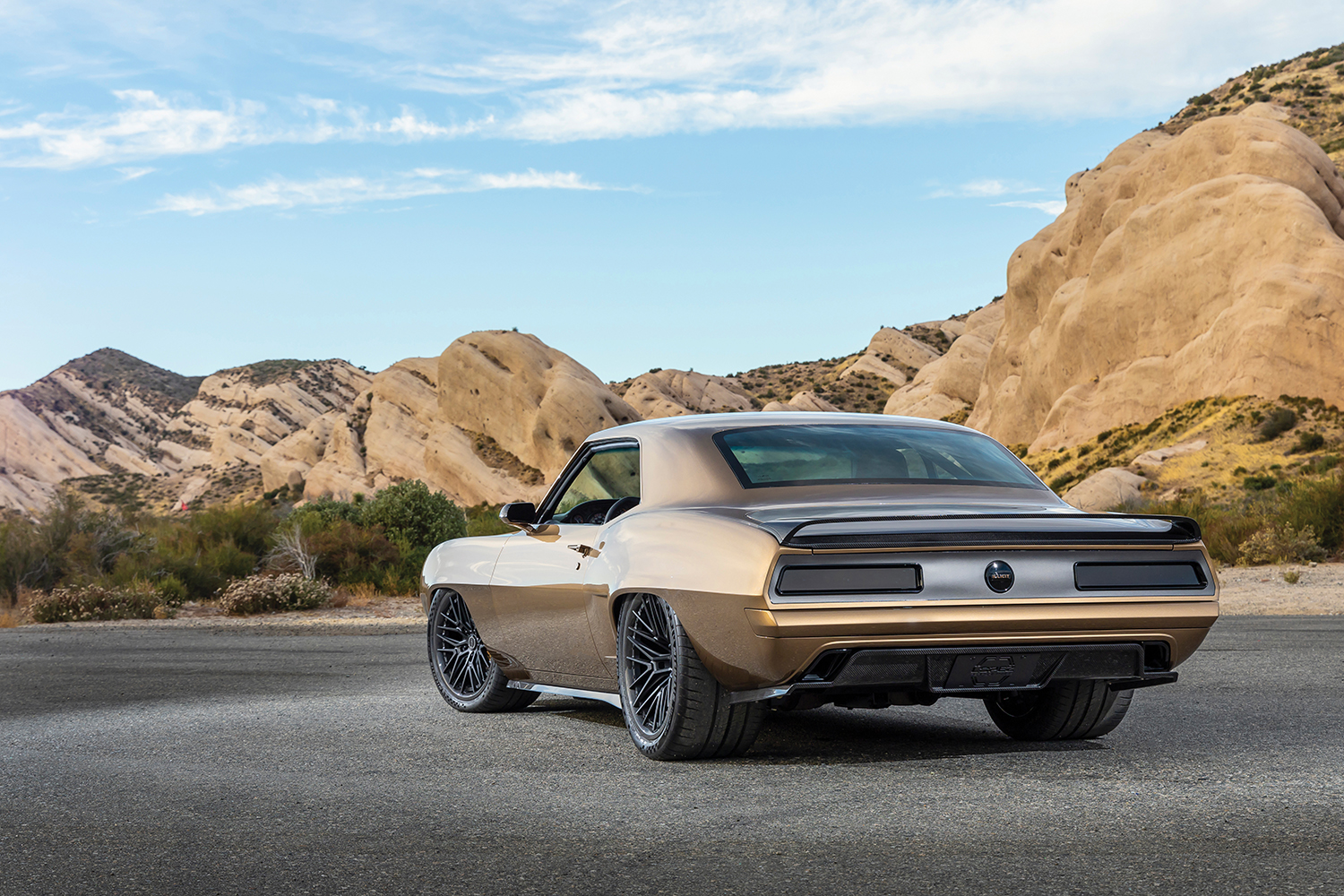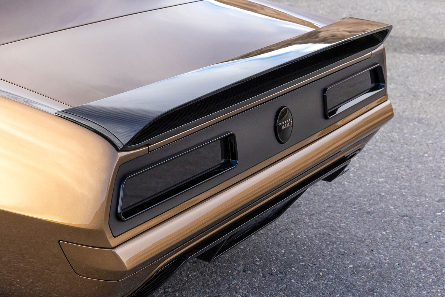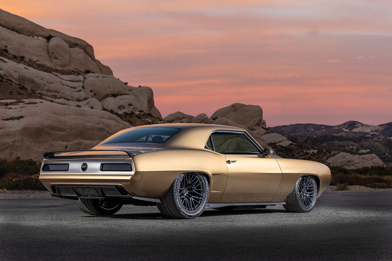“Illicit” is defined as “something forbidden by law, rules, or customs.” It also describes activities or behaviors that are illegal or disapproved on a social level. JR and Celeste Villarreal’s incredible 1969 Camaro carries the moniker Illicit, but it’s a car we approve of on every level.002 Front view of gold 1969 Chevy Camaro showcasing aggressive stance and custom wheelsSo how did this incredible Camaro come to be? Well, it started when JR was on the hunt for a first-gen Camaro. He was torn between buying a fully completed car or starting with a solid base to build from scratch. “I heard about a 1969 Camaro for sale in San Diego [California] that was listed in good condition, so decided to drive down to check out. It appeared to be in decent shape,” JR recalls. “The body was shiny, looked straight, and the 350 engine sounded strong. Unfortunately, it was all an illusion. After purchasing it I discovered it had major rust issues and had filler throughout the body. I was shocked that I just dropped $35K on a pile of rust.”003 Side angle of a sleek 1969 Chevy Camaro in gold with a black hood set against desert rock formationsJR learned about Jesus Lopez at Lopez Performance in San Bernardino, California, and was impressed with the quality of cars that had come out of his shop. He decided to take his ailing Camaro to Lopez and his crew to breathe new life into his vintage Camaro. Lopez Performance specializes in more than just restorations—they’re known for building high-end, award-winning hot rods and muscle cars. JR was all in.004 Rear view of 1969 Chevy Camaro featuring a modern taillight design and wide rear tiresLopez called in Sean Smith to help design a Camaro that would involve unique features to make JR’s Camaro stand out from the plethora of all other 1969 F-bodies on the planet. Not an easy task, but this isn’t Smith’s first rodeo. His designs are known for transforming ordinary muscle cars into one-of-a-kind masterpieces, and in this case, still able to retain the 1969 Camaro’s attractive factory vibe. JR approved of Smith’s artistic approach, allowing Lopez and his crew to completely revamp the car inside and out.019 Carbon fiber hood with heat extraction vents on a 1969 CamaroSmith’s design included accenting the Camaro’s original features by incorporating custom carbon-fiber aerodynamic components, including splitters, rocker panels, a hood, and decklid. Before those elements became part of the build, Daniel Aguilar, lead fabricator at Lopez Performance, cut off the damaged panels and incorporated fresh metal to accommodate the numerous custom nuances. Lopez Performance’s Miguel Barajas and Aaron Martinez took over from there and prepped the body to perfection prior to spraying the shell with a custom mix of Glasurit pigment aptly named Solar Flare Bronze.016 Carbon fiber rear spoiler on a 1969 Camaro blending modern design with classic stylingEnsuring the car carried just the right stance and performance handling, a Speedtech ExtReme subframe rides up front and employes JRi double-adjustable coilover shocks paired with their torque arm rear suspension out back, also dampened by JRi shocks.018 Rear wheel and side vent detail on a 1969 Camaro with Michelin Pilot Sport Cup 2 tiresBaer six-piston calipers and 14-inch rotors are utilized on all four corners while a Wilwood 15/16-inch master cylinder and Wilwood proportioning valve allow for excellent stopping power brought on by the Scott’s Hotrods pedal assembly. Accenting the brilliant paintjob are set of Brixton Forged VL4 Carbon + wheels with black centers and carbon-fiber outers wrapped in street-gripping Michelin Pilot Sport rubber. It all helps elevate the F-body to the highest level of driveability combined with exceptional performance.008 Detailed side view of hood struts and custom components under the hood of a 1969 Chevy CamaroWith all the aero upgrades, high-performance brakes, and suspension in place, JR knew a powerful engine was essential. After a brief discussion with Lopez, they decided on a Dart LSX 427ci engine. Prior to installation, Aguilar fabricated custom one-off panels for the engine bay creating a stunning showcase for the potent powerplant.006 Whipple supercharged engine in the custom 1969 Chevy Camaro's cleanly detailed engine bayThompson Motorsports in Nevada, Texas, handled the machining while Lopez Performance took on the assembly process. They topped it with a Whipple 2.9L supercharger and let the ensemble breathe through a set of Ultimate Headers headers, custom 3-inch exhaust, and JBA mufflers. The system produces an aggressive sound that matches the Camaro’s visual personality.010 Interior view of 1969 Chevy Camaro featuring modern dashboard custom center console and brown leather upholsteryA Bowler Performance–prepped TREMEC T-56 transmission, paired with a Tilton twin-disc clutch offers smooth gear shifts in a bulletproof package. A Currie 9-inch rearend stuffed with Eaton Truetrac posi, 3.73 gears, and 31-spline axles offer exceptional strength excellent power-to-the-ground performance.011 Custom gauge cluster in 1969 Camaro with Illicit branding featuring speedometer boost and tachometerThe interior showcases a stunning blend of luxury and racing performance, designed by Sean Smith and brought to life by Lopez Performance and Gabe’s Custom Interiors. Lopez crafted a custom dash with an aluminum insert, complemented by a set of Classic Instruments gauges. Gabe’s followed through with Truffle Brown and black leather upholstery throughout the custom door panels, dash, center console, and floors. A pair of Recaro Sportster seats also received the custom leather treatment from Gabe’s while a Schroth Racing harness is secured to the Detroit Speed rollcage. That stylish steering wheel is a custom creation by Lopez, mounted on an Ididit steering column.013 Close up of modern toggle switches and infotainment system in a 1969 Camaro interiorClima