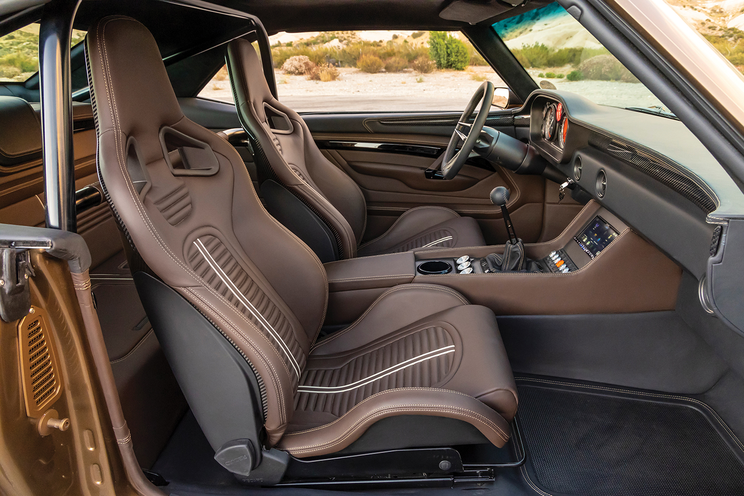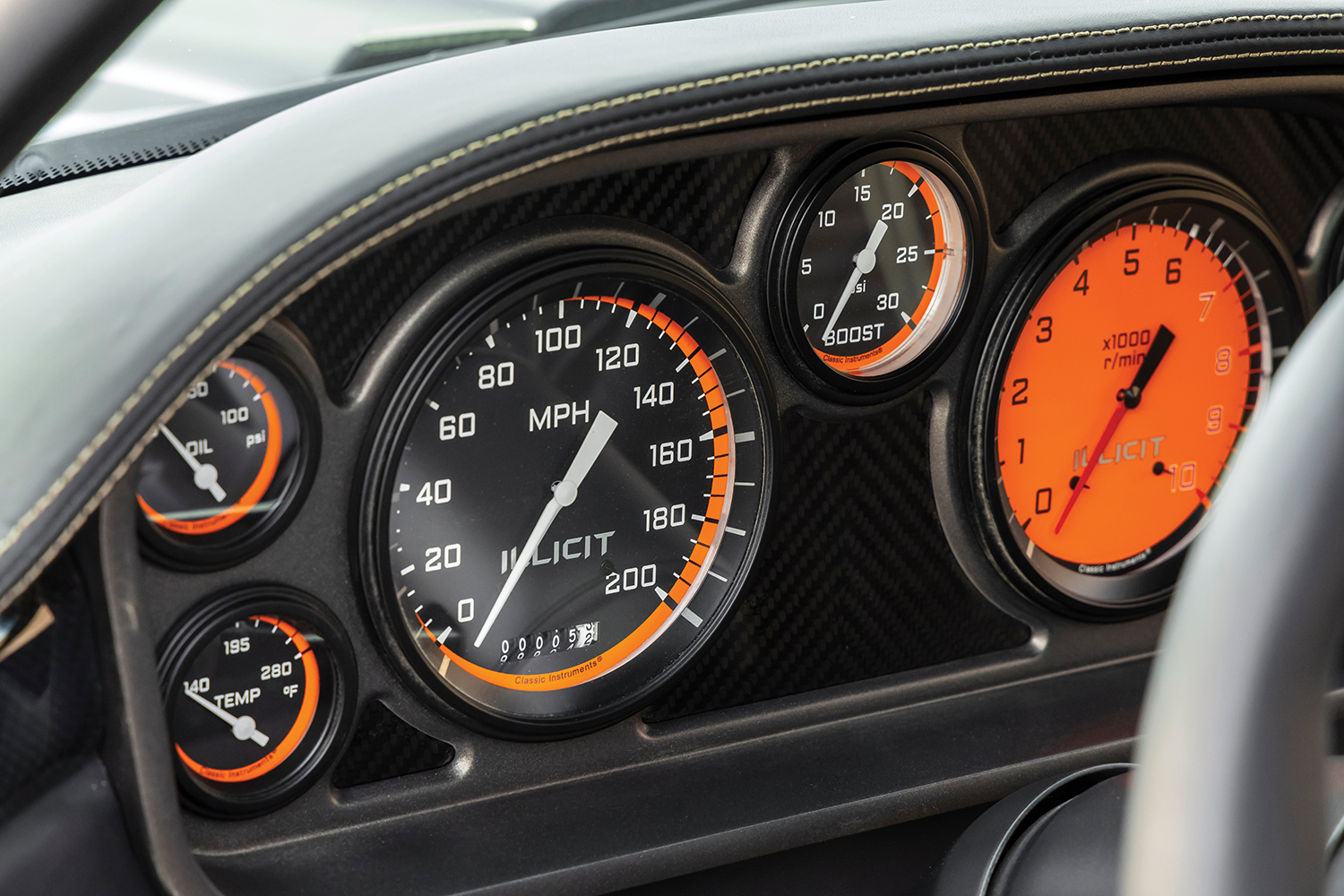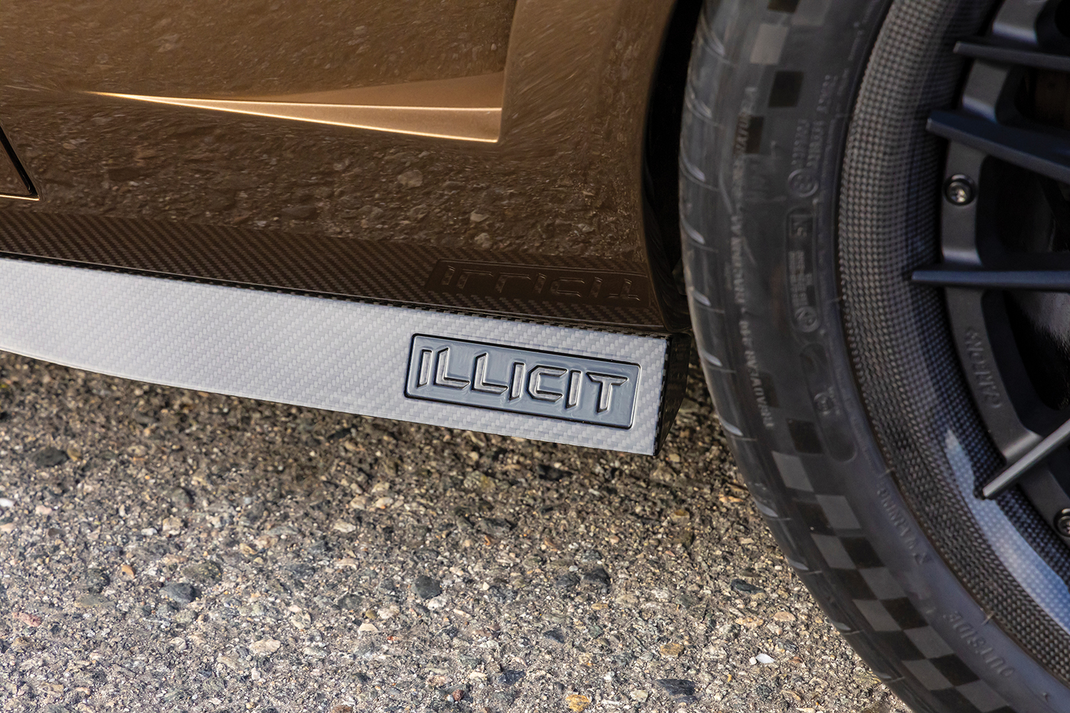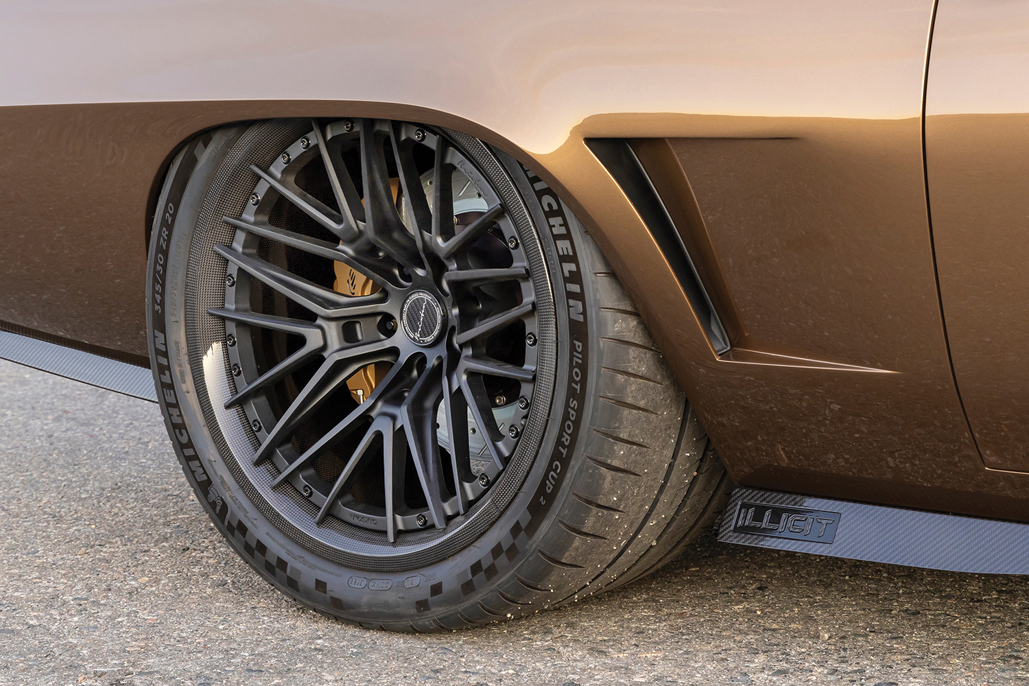 “Illicit” is defined as “something forbidden by law, rules, or customs.” It also describes activities or behaviors that are illegal or disapproved on a social level. JR and Celeste Villarreal’s incredible 1969 Camaro carries the moniker Illicit, but it’s a car we approve of on every level.002 Front view of gold 1969 Chevy Camaro showcasing aggressive stance and custom wheelsSo how did this incredible Camaro come to be? Well, it started when JR was on the hunt for a first-gen Camaro. He was torn between buying a fully completed car or starting with a solid base to build from scratch. “I heard about a 1969 Camaro for sale in San Diego [California] that was listed in good condition, so decided to drive down to check out. It appeared to be in decent shape,” JR recalls. “The body was shiny, looked straight, and the 350 engine sounded strong. Unfortunately, it was all an illusion. After purchasing it I discovered it had major rust issues and had filler throughout the body. I was shocked that I just dropped $35K on a pile of rust.”003 Side angle of a sleek 1969 Chevy Camaro in gold with a black hood set against desert rock formationsJR learned about Jesus Lopez at Lopez Performance in San Bernardino, California, and was impressed with the quality of cars that had come out of his shop. He decided to take his ailing Camaro to Lopez and his crew to breathe new life into his vintage Camaro. Lopez Performance specializes in more than just restorations—they’re known for building high-end, award-winning hot rods and muscle cars. JR was all in.004 Rear view of 1969 Chevy Camaro featuring a modern taillight design and wide rear tiresLopez called in Sean Smith to help design a Camaro that would involve unique features to make JR’s Camaro stand out from the plethora of all other 1969 F-bodies on the planet. Not an easy task, but this isn’t Smith’s first rodeo. His designs are known for transforming ordinary muscle cars into one-of-a-kind masterpieces, and in this case, still able to retain the 1969 Camaro’s attractive factory vibe. JR approved of Smith’s artistic approach, allowing Lopez and his crew to completely revamp the car inside and out.019 Carbon fiber hood with heat extraction vents on a 1969 CamaroSmith’s design included accenting the Camaro’s original features by incorporating custom carbon-fiber aerodynamic components, including splitters, rocker panels, a hood, and decklid. Before those elements became part of the build, Daniel Aguilar, lead fabricator at Lopez Performance, cut off the damaged panels and incorporated fresh metal to accommodate the numerous custom nuances. Lopez Performance’s Miguel Barajas and Aaron Martinez took over from there and prepped the body to perfection prior to spraying the shell with a custom mix of Glasurit pigment aptly named Solar Flare Bronze.016 Carbon fiber rear spoiler on a 1969 Camaro blending modern design with classic stylingEnsuring the car carried just the right stance and performance handling, a Speedtech ExtReme subframe rides up front and employes JRi double-adjustable coilover shocks paired with their torque arm rear suspension out back, also dampened by JRi shocks.018 Rear wheel and side vent detail on a 1969 Camaro with Michelin Pilot Sport Cup 2 tiresBaer six-piston calipers and 14-inch rotors are utilized on all four corners while a Wilwood 15/16-inch master cylinder and Wilwood proportioning valve allow for excellent stopping power brought on by the Scott’s Hotrods pedal assembly. Accenting the brilliant paintjob are set of Brixton Forged VL4 Carbon + wheels with black centers and carbon-fiber outers wrapped in street-gripping Michelin Pilot Sport rubber. It all helps elevate the F-body to the highest level of driveability combined with exceptional performance.008 Detailed side view of hood struts and custom components under the hood of a 1969 Chevy CamaroWith all the aero upgrades, high-performance brakes, and suspension in place, JR knew a powerful engine was essential. After a brief discussion with Lopez, they decided on a Dart LSX 427ci engine. Prior to installation, Aguilar fabricated custom one-off panels for the engine bay creating a stunning showcase for the potent powerplant.006 Whipple supercharged engine in the custom 1969 Chevy Camaro's cleanly detailed engine bayThompson Motorsports in Nevada, Texas, handled the machining while Lopez Performance took on the assembly process. They topped it with a Whipple 2.9L supercharger and let the ensemble breathe through a set of Ultimate Headers headers, custom 3-inch exhaust, and JBA mufflers. The system produces an aggressive sound that matches the Camaro’s visual personality.010 Interior view of 1969 Chevy Camaro featuring modern dashboard custom center console and brown leather upholsteryA Bowler Performance–prepped TREMEC T-56 transmission, paired with a Tilton twin-disc clutch offers smooth gear shifts in a bulletproof package. A Currie 9-inch rearend stuffed with Eaton Truetrac posi, 3.73 gears, and 31-spline axles offer exceptional strength excellent power-to-the-ground performance.011 Custom gauge cluster in 1969 Camaro with Illicit branding featuring speedometer boost and tachometerThe interior showcases a stunning blend of luxury and racing performance, designed by Sean Smith and brought to life by Lopez Performance and Gabe’s Custom Interiors. Lopez crafted a custom dash with an aluminum insert, complemented by a set of Classic Instruments gauges. Gabe’s followed through with Truffle Brown and black leather upholstery throughout the custom door panels, dash, center console, and floors. A pair of Recaro Sportster seats also received the custom leather treatment from Gabe’s while a Schroth Racing harness is secured to the Detroit Speed rollcage. That stylish steering wheel is a custom creation by Lopez, mounted on an Ididit steering column.013 Close up of modern toggle switches and infotainment system in a 1969 Camaro interiorClima