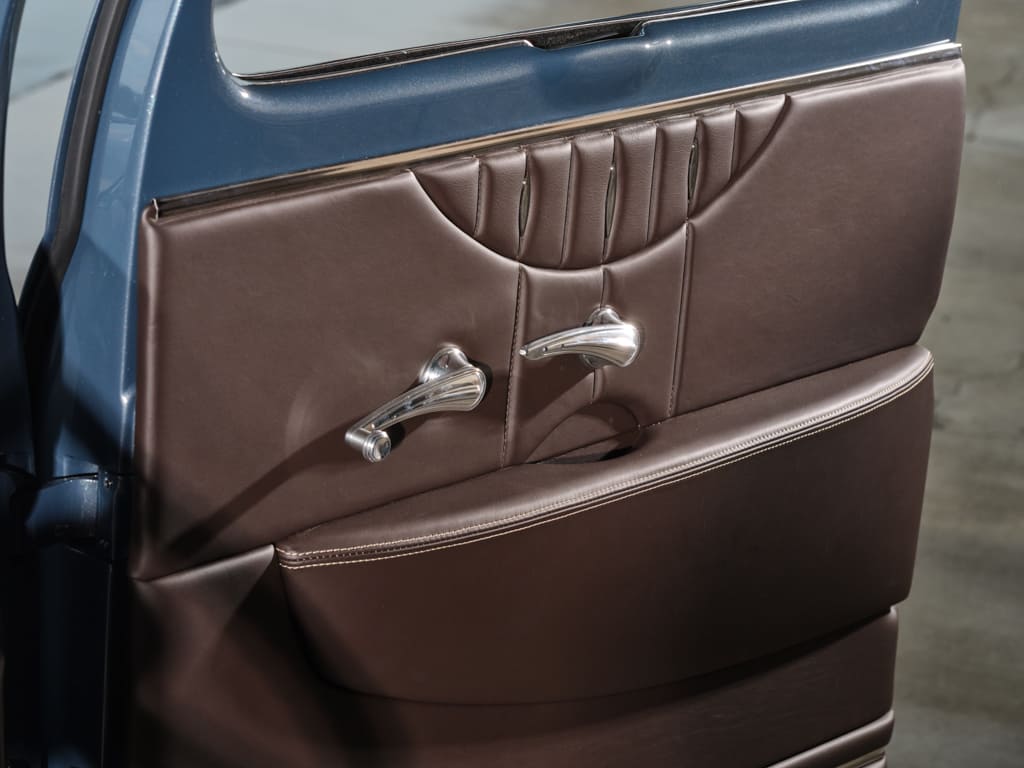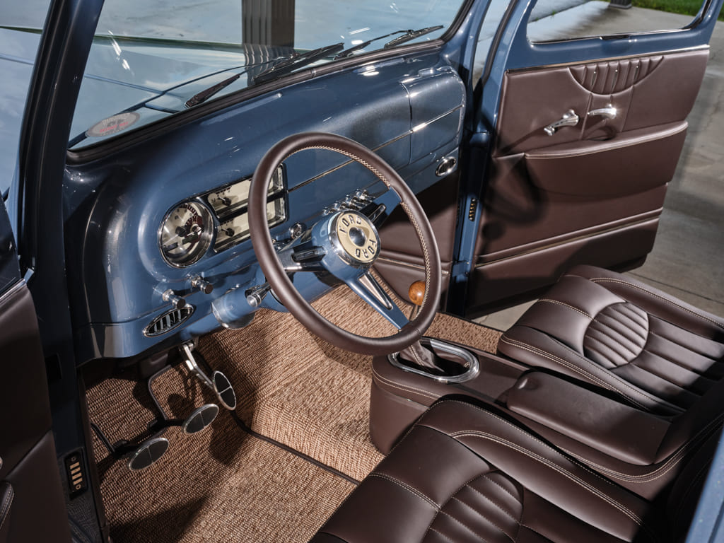 In early 2023, the F-1 headed to the very talented John Miller (Hide Originals), who created the beautiful Relicate Leather interior (complemented by a Curtis Speed wheel, Dakota VHX gauges, and a Bluetooth Kenwood system all surrounded by custom Korek metalwork). April was the last time the two would see the truck until they arrived in Nashville for the Goodguys show. Ryan wanted Saun and Dennis to wait until the truck was completed before seeing it again. When they pressed Ryan for some pictures of the assembly, he’d send a closeup of the wiring, the engine, or the taillight—not at all what they wanted!
