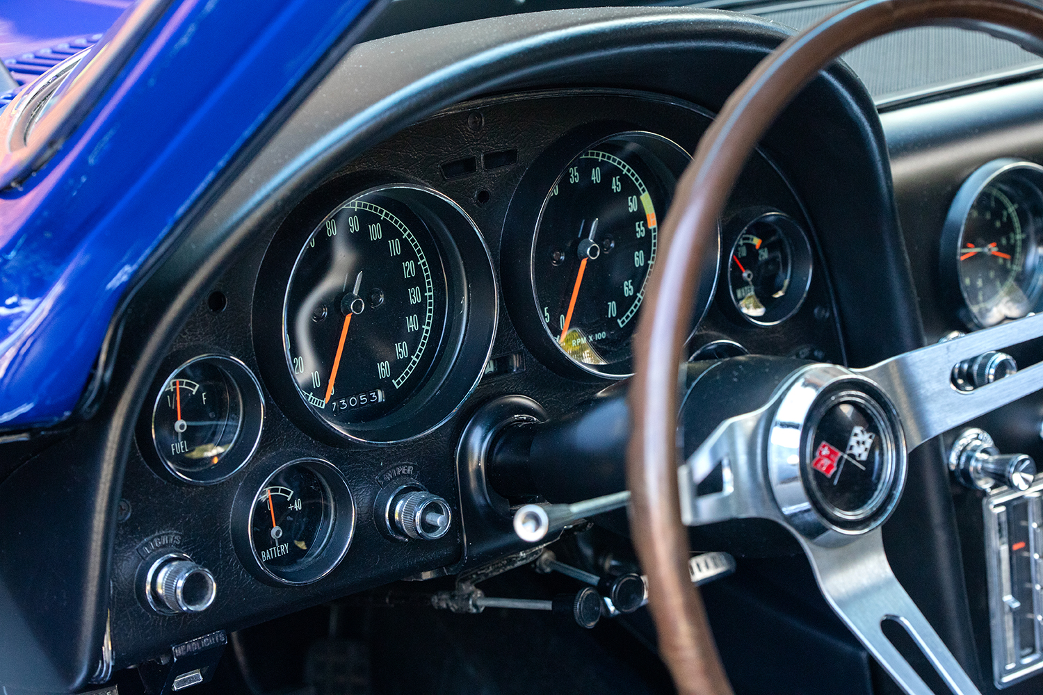 Needing some help taking on the damaged body, Frank called in his former dealership coworker and bodywork guru Chris Morris to form a smooth canvas prior to Frank applying the “Sunoco Blue” pigment and creating a flawless finish. The grille, bumpers, headlights, and taillights were restored to their stock appearance, preserving the car’s classic aesthetic.