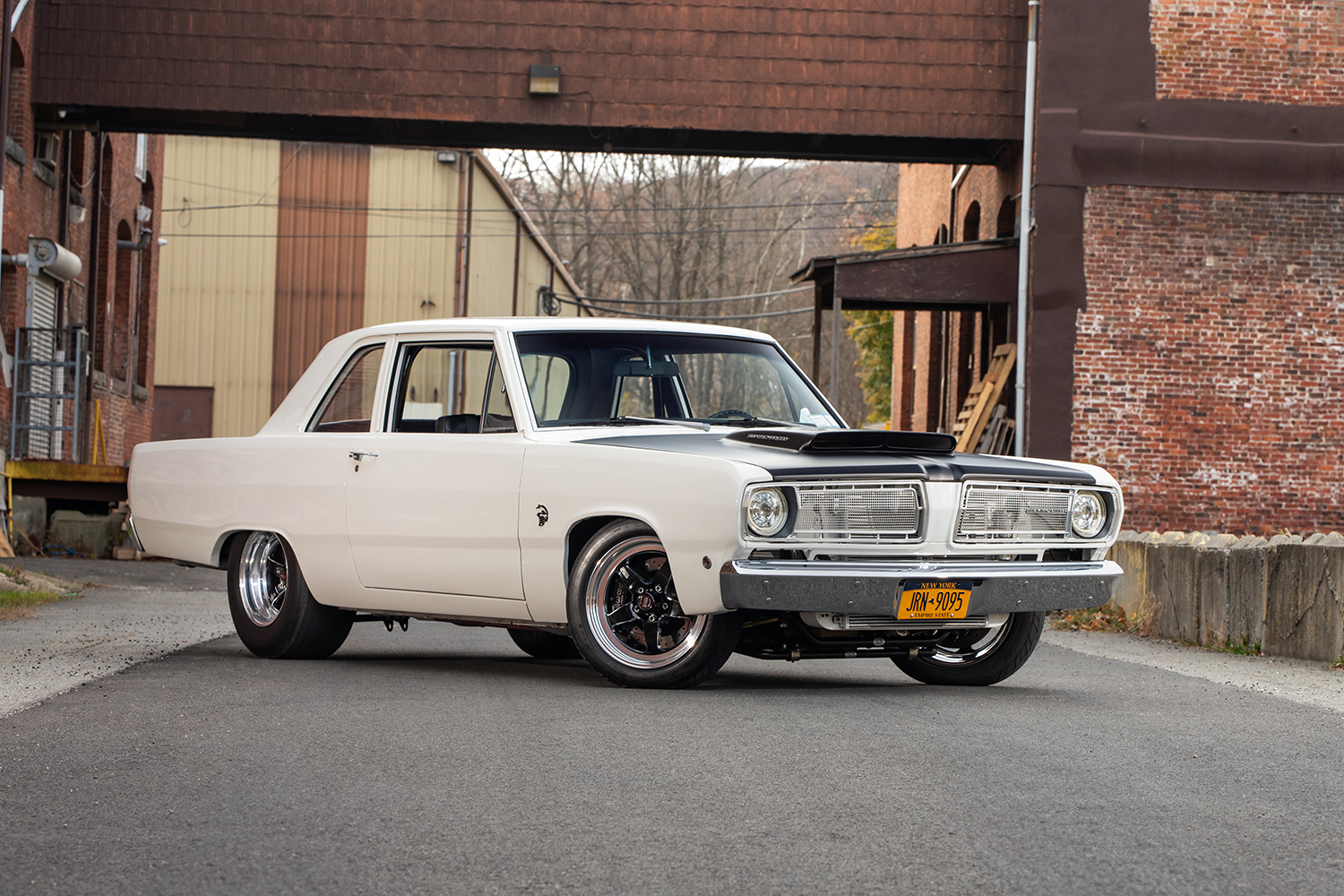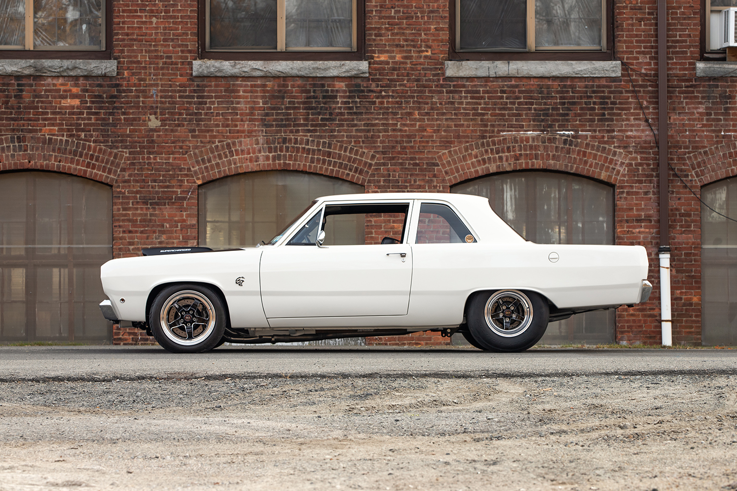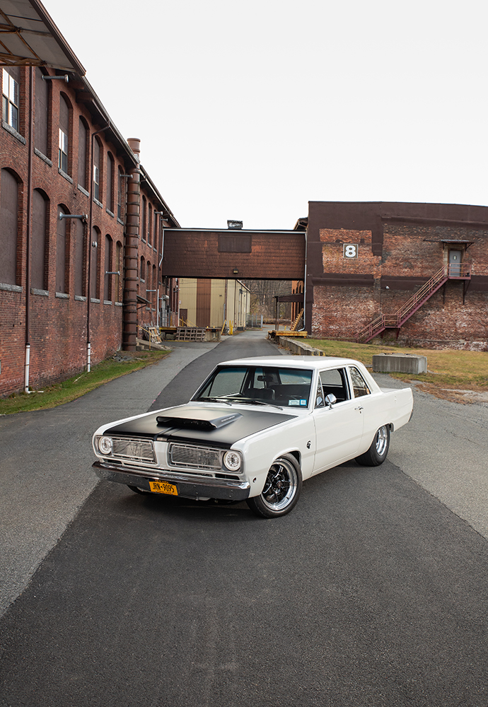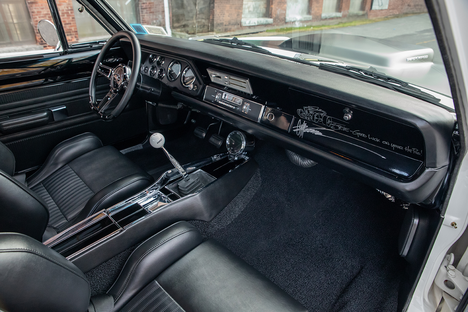 We have all come to know the body as a Mopar A-body, a 1968 Plymouth Valiant, but this one has a staggering amount of power. The quarter-panels are Dart while the side moldings have been removed. A modified firewall and tunnel, a custom steel hood outfitted with a nifty scoop, and 3-inch custom wheeltubs were also installed. The bodywork and the subsequent paint come from the efforts of Steve and his dad, who sprayed on the PPG Concept DCC in White while the hood is painted in black and then covered with PPG Global Matte Clearcoat (D8115).