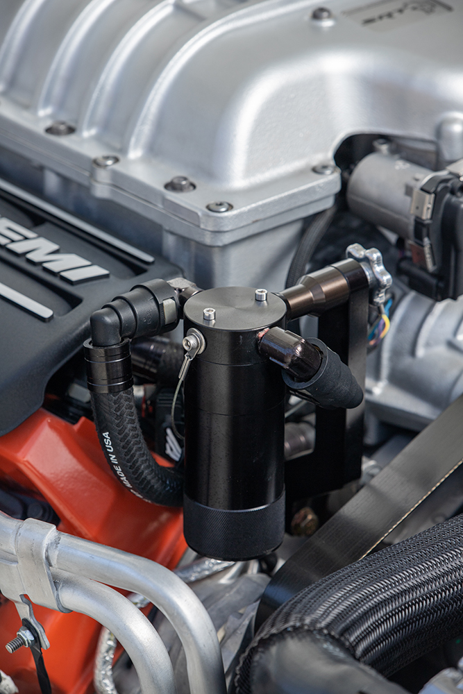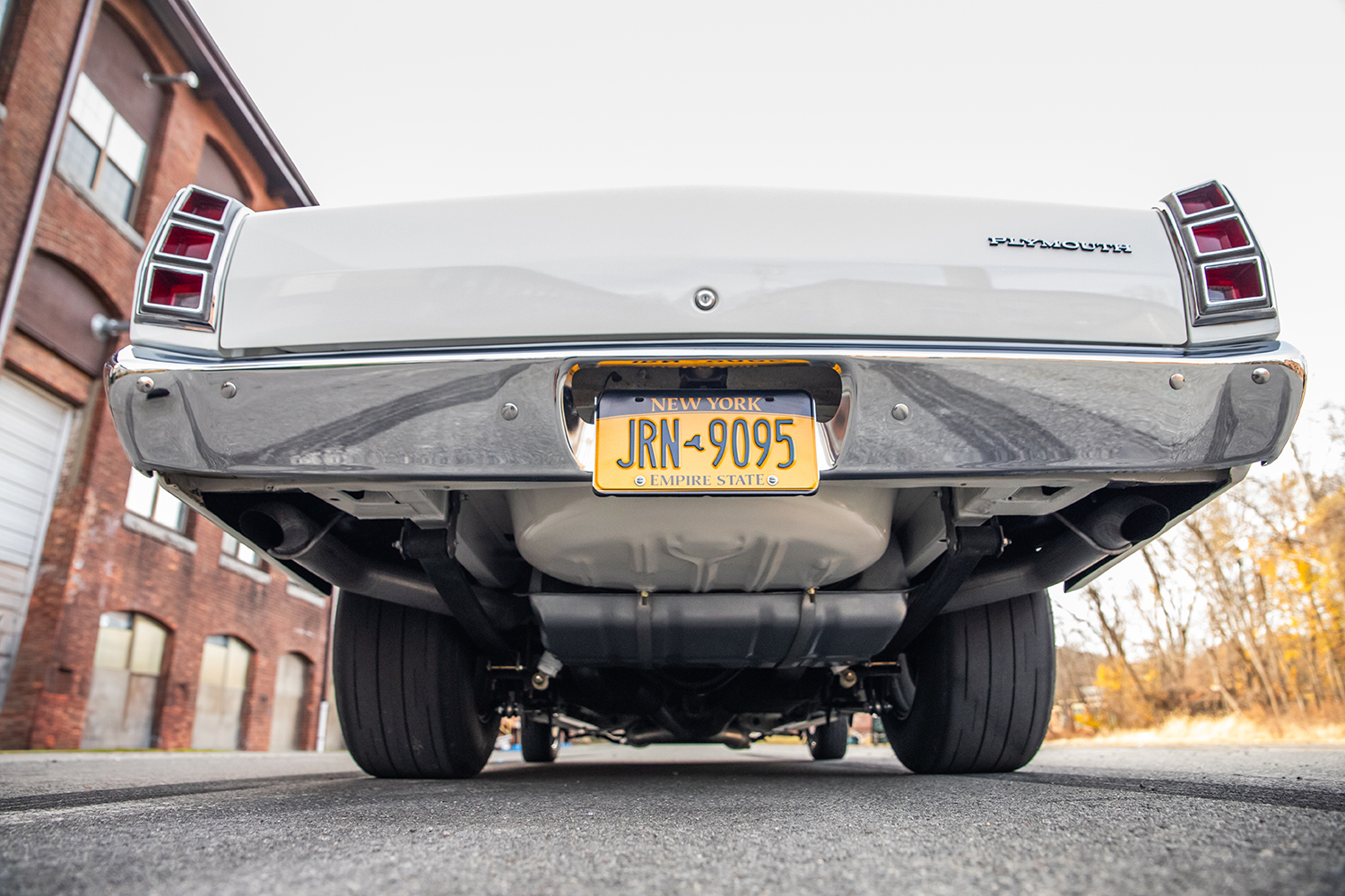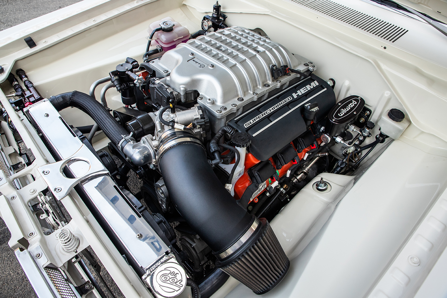 Linked to the Hellcat is a TREMEC T-56 Magnum six-speed transmission with a McLeod Racing RXT 1200 clutch package (twin-disc clutch with ceramic-lined clutch discs, pressure plate, and flywheel) and a Hurst shifter. Coupling the trans to the rearend is an American Powertrain aluminum driveshaft that eventually ends up with a Plymouth Road Runner 8-3/4-inch rearend with 3.91 gears and Moser axles.