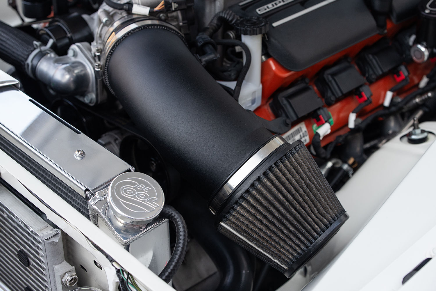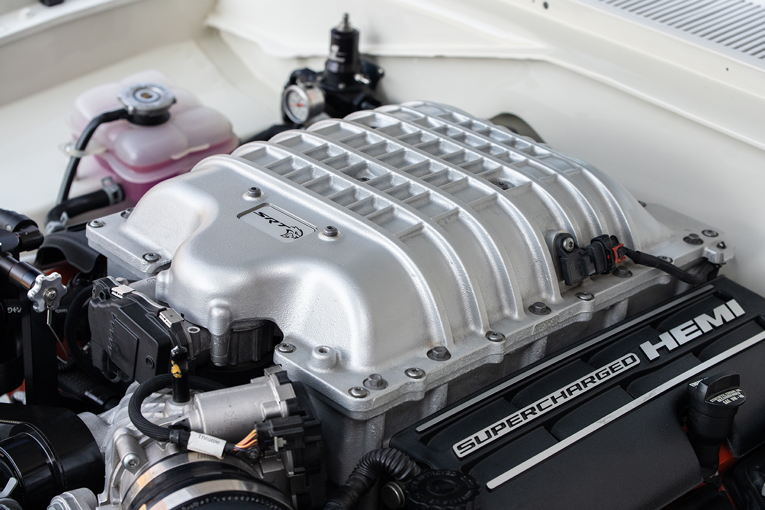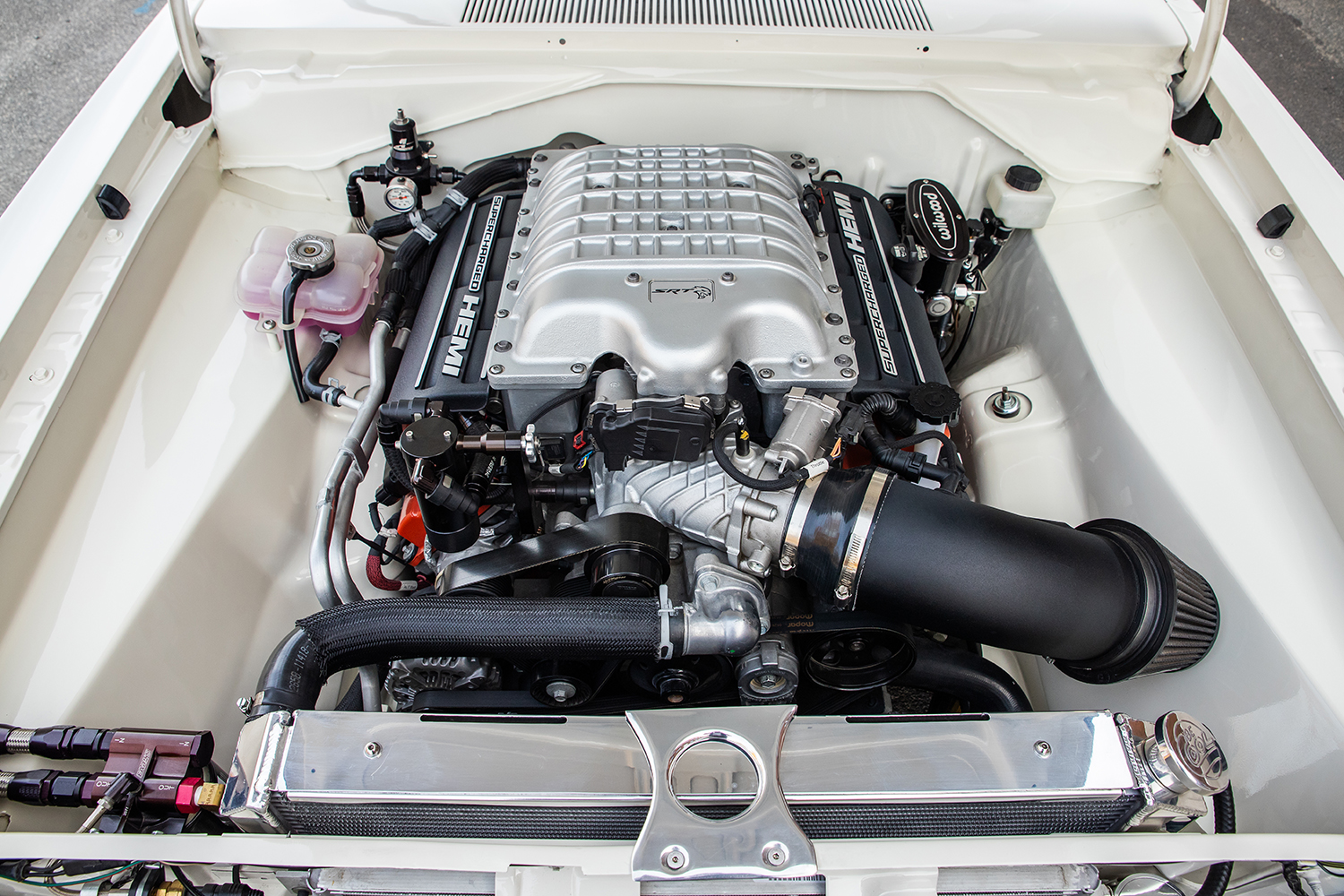 There is no getting around the fact that the Dodge Challenger Hellcat crate engine (PN 68303089AC), all 6.2 supercharged liters, packs all of the prerequisite punch a modern-day hot rod requires. The 2016 Dodge Challenger Hellcat is a supercharged 6.2L Hemi V-8 engine used in the Valiant. The factory compression ratio is 9.5:1, with horsepower ratings between 707-717 at 6,000 rpm. This is achieved using intake valves measuring 2.140 inches and exhaust valves measuring 1.655 inches. The supercharger boost, combined with the compression ratio 9.5:1 gives the Hellcat motor an effective compression ratio of over 14:1. This robust powerplant generates an impressive 707-plus horsepower and 650 lb-ft of torque in its stock form, but with custom exhaust made from TTi Performance Exhaust and Headers in the form of long-tube headers with 2-inch primary pipes, full 3-inch custom exhaust with an X-pipe, and a pair of Flowmaster mufflers help to bump the power up to the current RWHP readings. Other engine accessories include a pair of SPAL electric fans and a trunk-mounted Optima RedTop battery. All the electric and computer engines are factory Hellcat components.