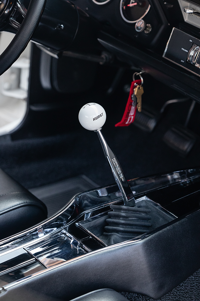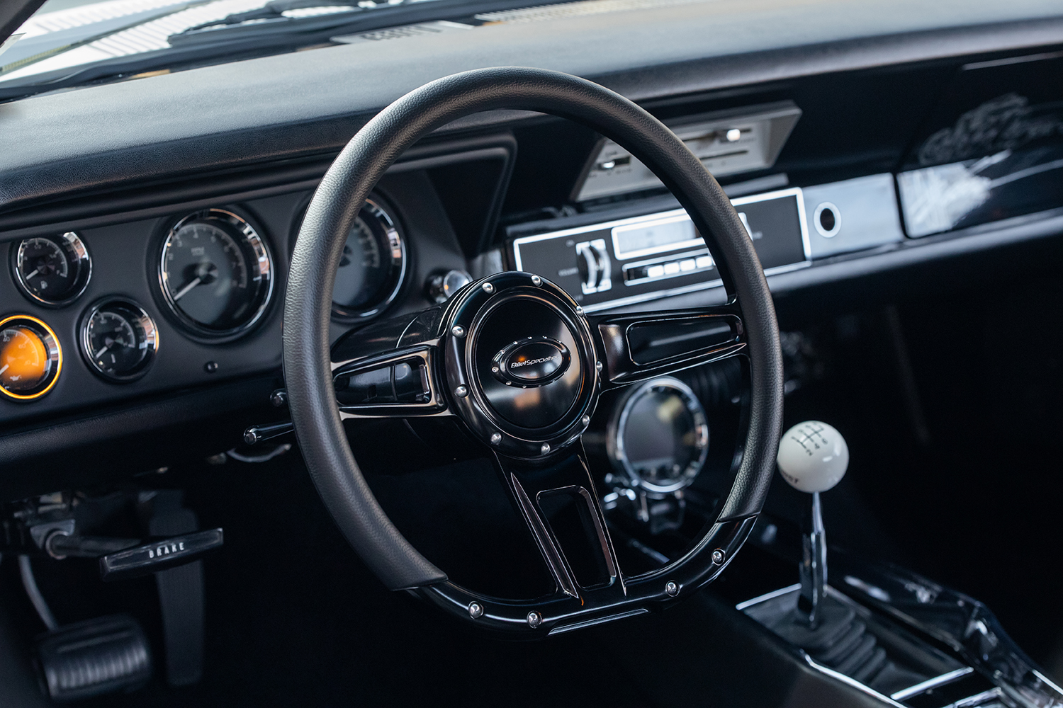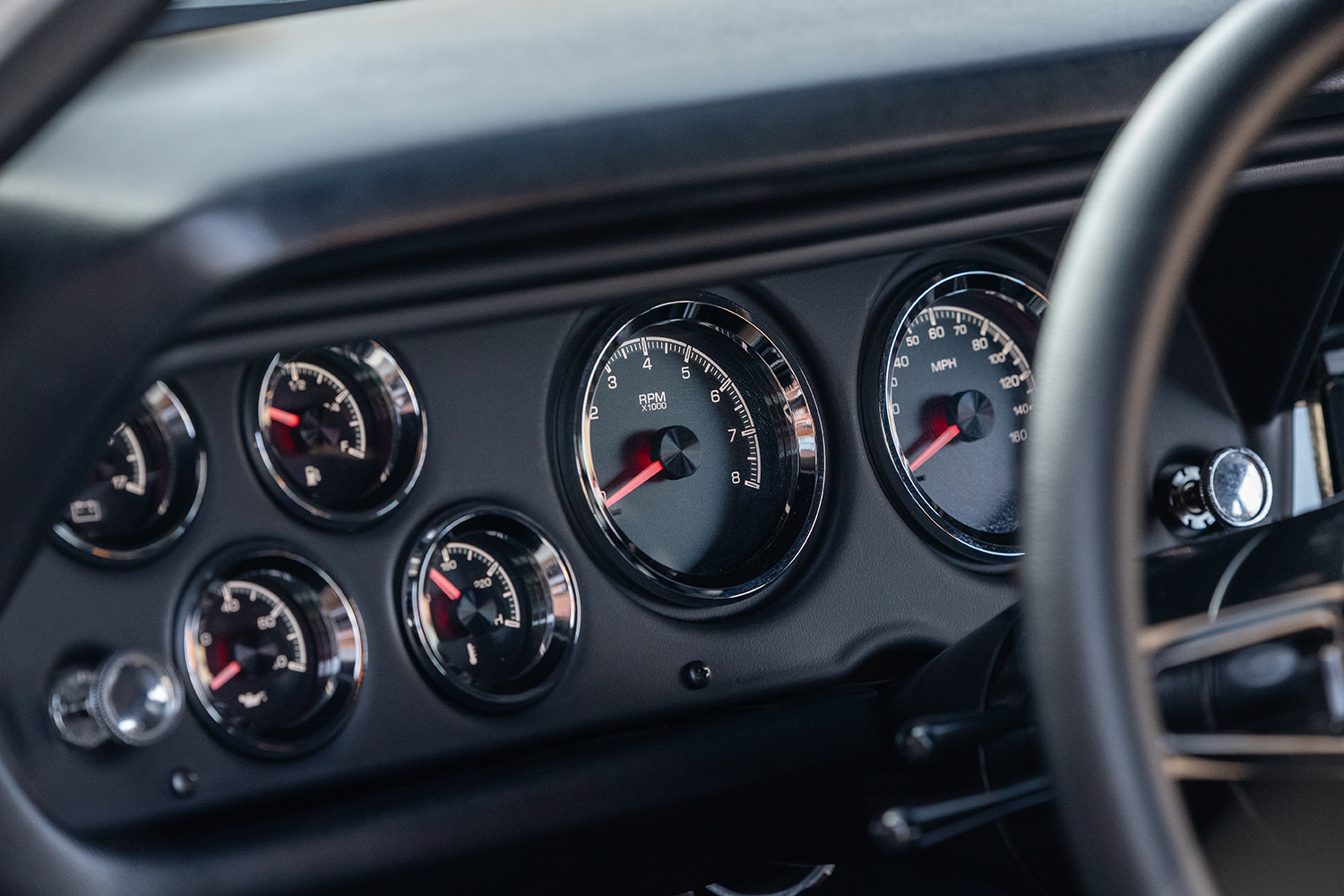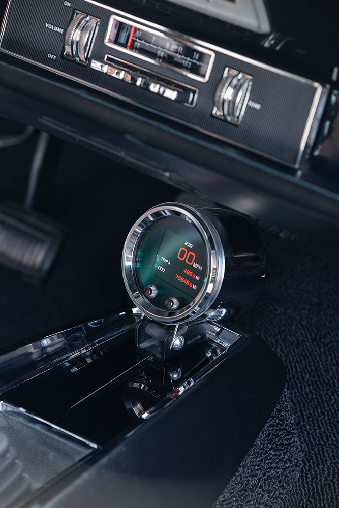 The interior features a stock dash now painted in gloss black. It houses Dakota Digital gauges, a Flaming River steering column, and a Billet Specialties leather-wrapped, slotted, three-spoke D-shape wheel. Other dash appointments include the factory radio and heating and ventilation system. The wiring is a modified system that Steve has stretched into position. The factory center console houses the Hurst shifter and the Dakota Digital multi-purpose round speedometer. (A word on this speedo: Currently showing as a speedometer with an odometer and trip feature, it can be reconfigured, note buttons on the gauge face, as desired. So, if you want a tach that shows oil pressure, quarter-mile, 0-to-60 timer, you can have at it. Very cool.)