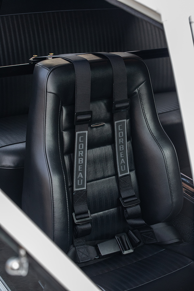 The twin buckets are from the aftermarket. Corbeau buckets are wrapped in vinyl as an original seat might have and feature a four-point restraint system. The rear seat is the factory bench, neatly tucked beneath the single-loop rollbar. All the stitchwork was handled by Miller Place Auto Upholstery (specializing in giving cars their original factory look), which did the seating, the factory headliner, carpeting, and all the panels.