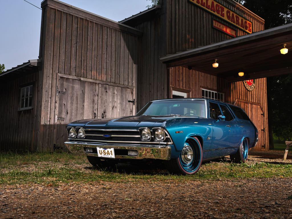02 Low angle shot of '69 Chevelle wagon near village garage