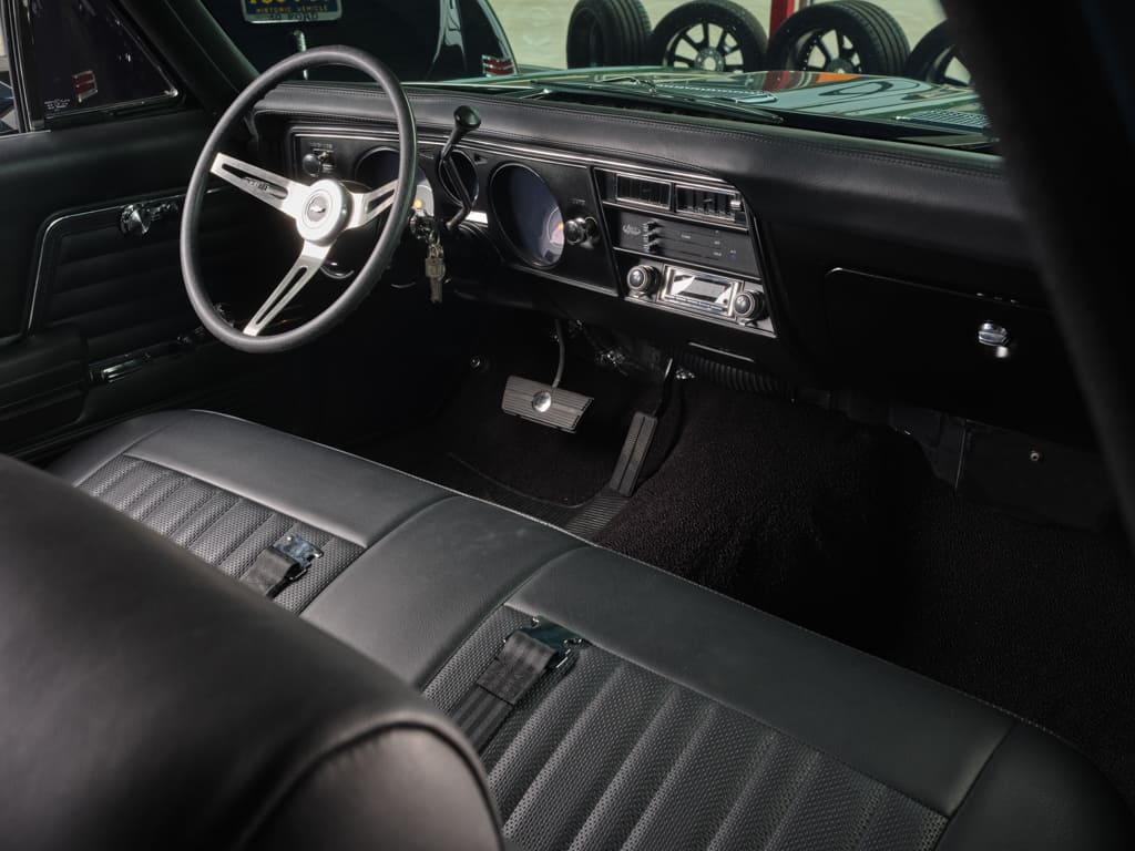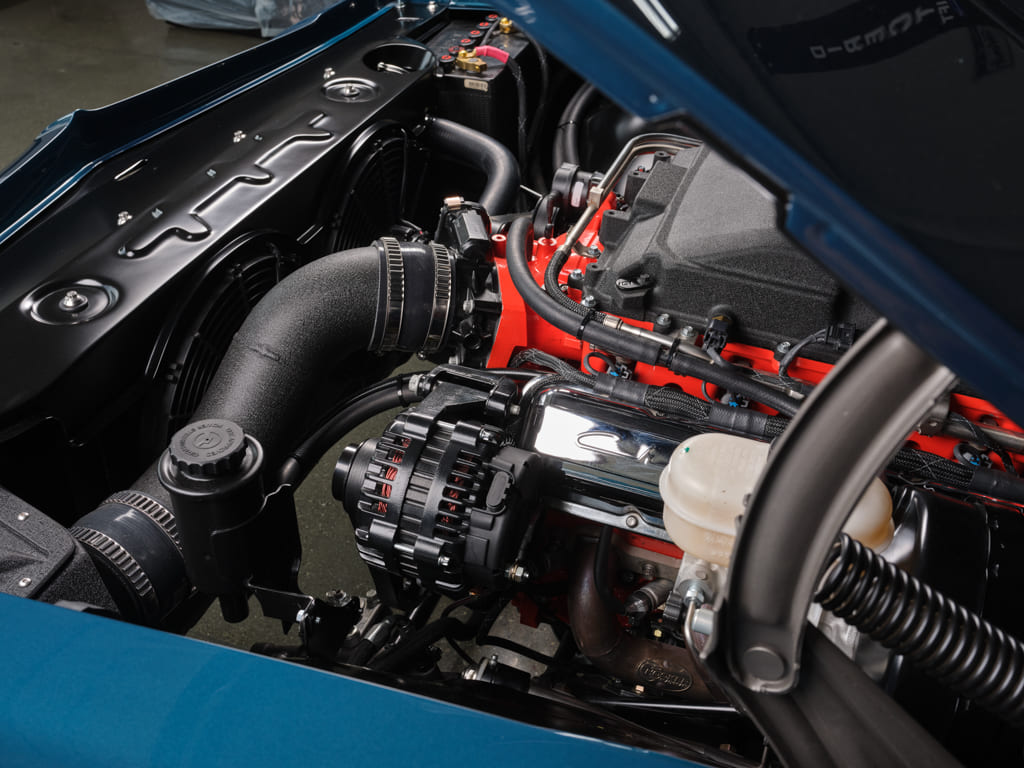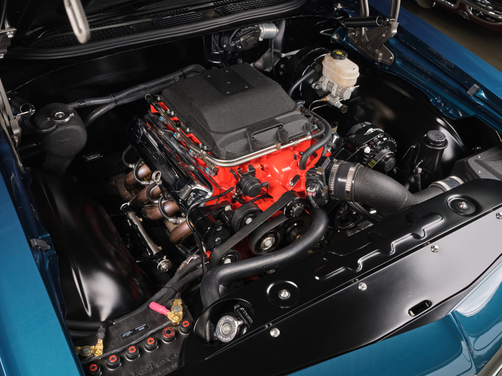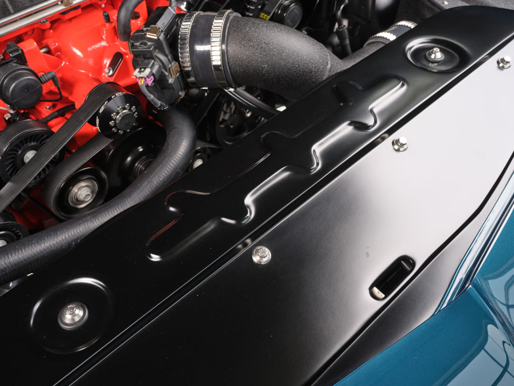 Beyond the Cam Motion supercharger cam, upgraded valvetrain, and underdrive Griptec pully, the engine was basically left in stock configuration. The Dutchboys dressed up the LSA supercharger lid with a powdercoat texture and incorporated an LS Classics chrome valve covers to evoke a small-block aesthetic that complements the car’s late-’60s ambience. For additional Dutchboys style, they created a custom closeout panel and smoothed the firewall.