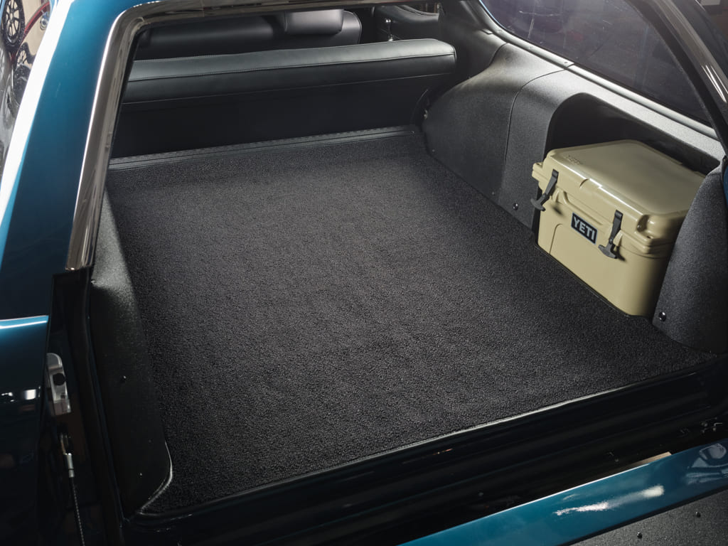Within the driver area, a stock-like ambience is maintained, enhanced with black leather adorning the factory bench seat and door panels. Black loop carpet is laid throughout the extensive floor space. An ingeniously crafted side pocket provides a convenient space for tools, supplies, and, in this case, a Yeti cooler loaded with cool beverages and snacks. The massive real estate offers ample space for luggage or other roadworthy essentials. Up front, the factory dash was treated to Dakota Digital gauges for updated engine monitoring. Additionally, a Classic Car audio head unit occupies the shared space with the Vintage Air control panel, seamlessly blending in with the overall vintage vibe.