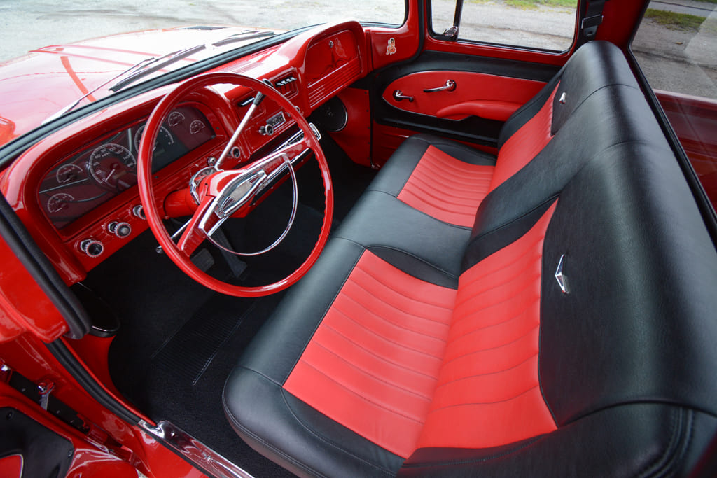 Years of neglect had deteriorated the body, but Todd was hopeful that he could weld in some new sheetmetal and bring it back. He said, “I taught myself to weld on this project and shape and bend metal.” While he had the welder fired up, he replaced the rocker panels and cab corners, and then filled in the fuel filler, stake pockets, and tailgate latches. From there, Jeff McAdoo handled the rest of the bodywork to prepare it for paint. After straightening and aligning the body panels, McAdoo sprayed the truck with Axalta materials, mixed in GM Code 72 Bright Red. Black was used in between the side trim and on the tailgate letters. Then it was the tedious process of reassembly, with all-new glass, trim, and emblems to give it a completely fresh look. New bedwood and stainless strips finished off the exterior.