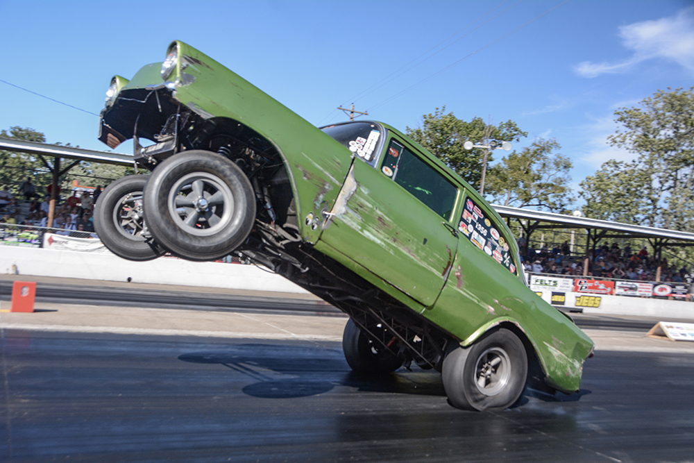 Jeff and Charlotte Hefler’s “Super Fly” ’55 Chevy 210 effortlessly carried the front wheels 100 feet down track, much to the satisfaction of thousands of fans in the covered grandstands.