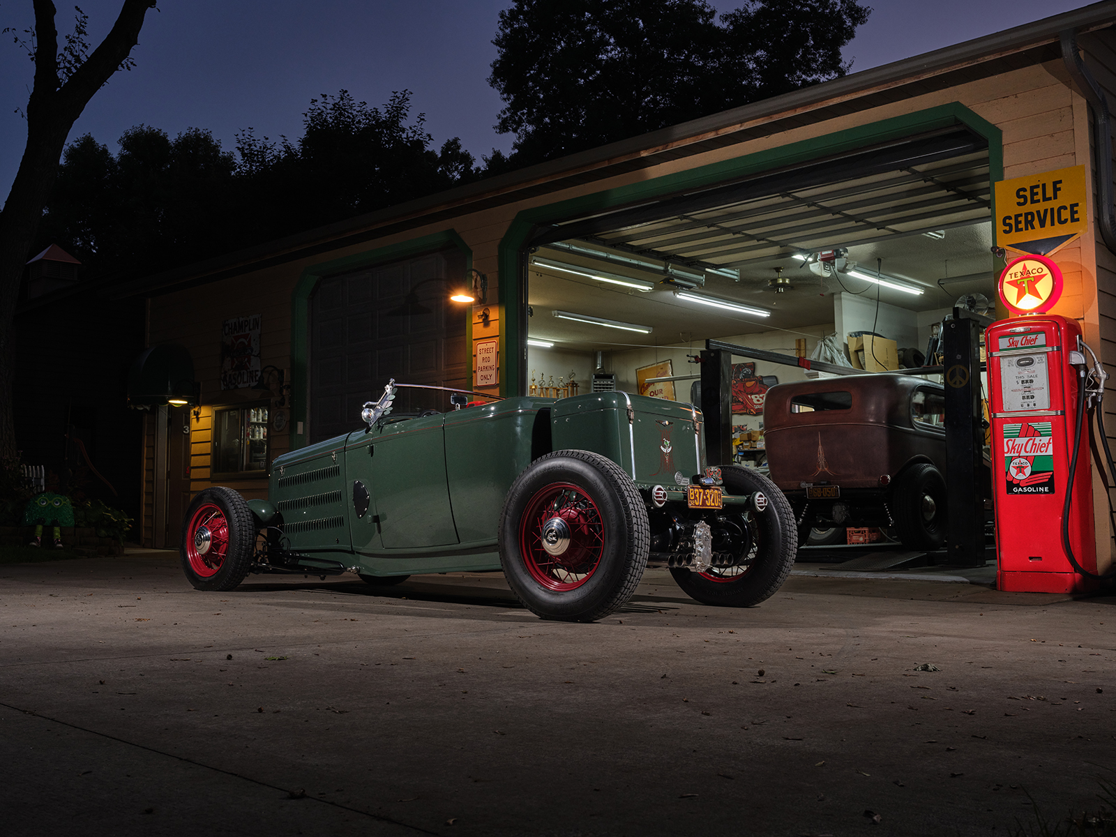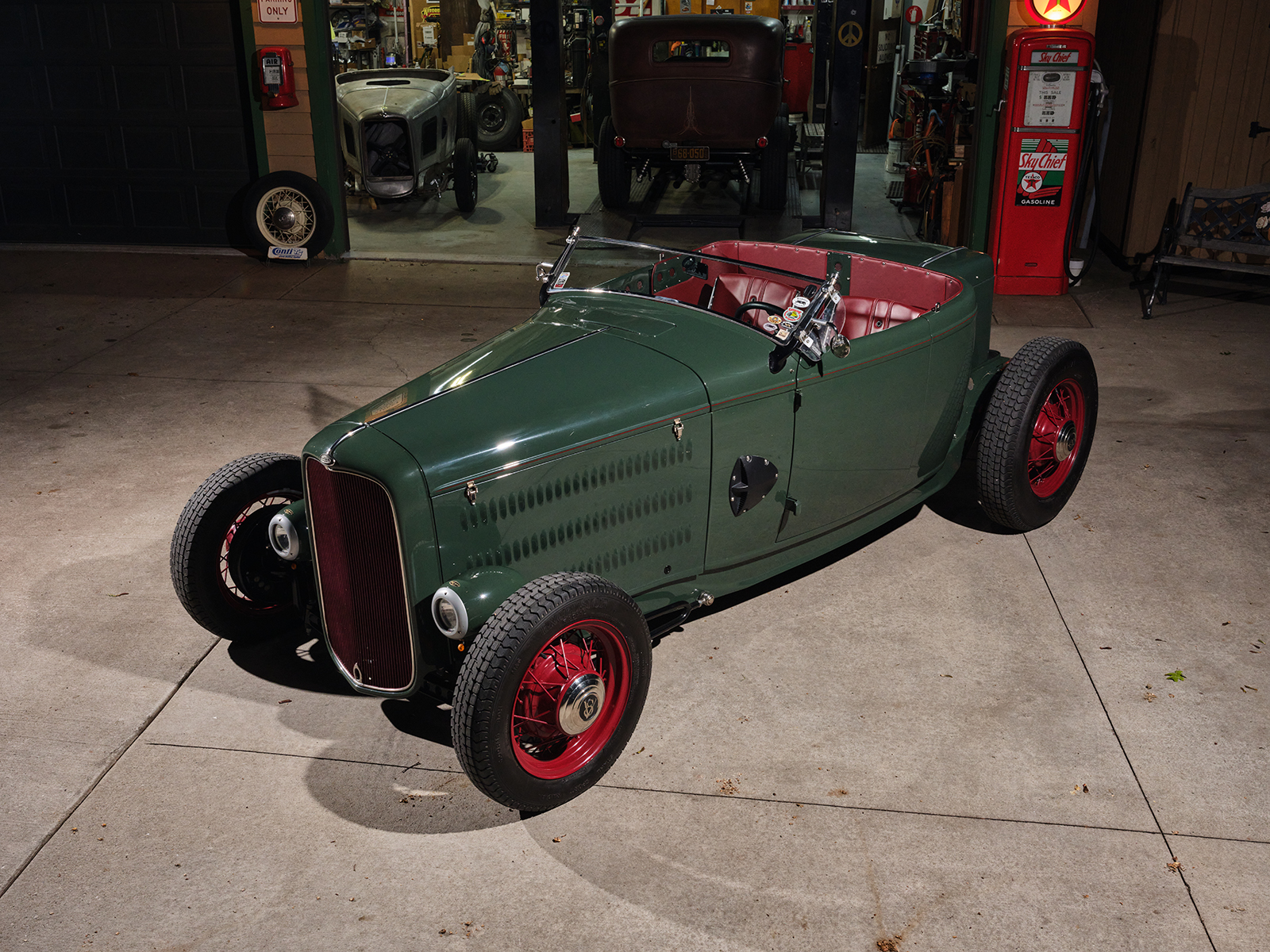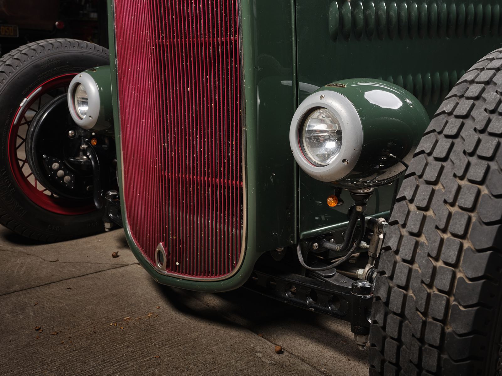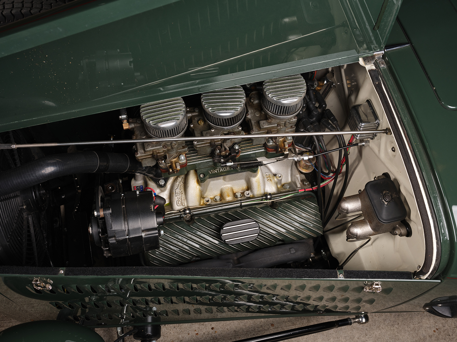 The powertrain for this old-timey-appearing hot rod is an iron small-block 355ci Chevy. It runs an Edelbrock Performer EPS single four intake with an adapter, allowing the Vintage Speed Rochester Tri-power setup to feed the fuel.