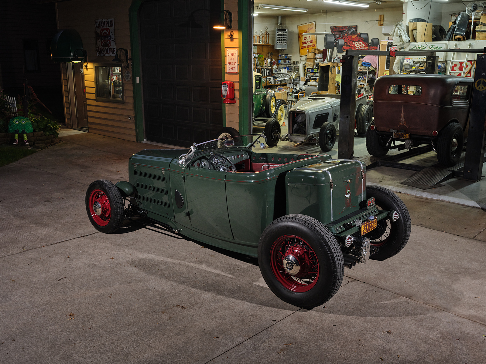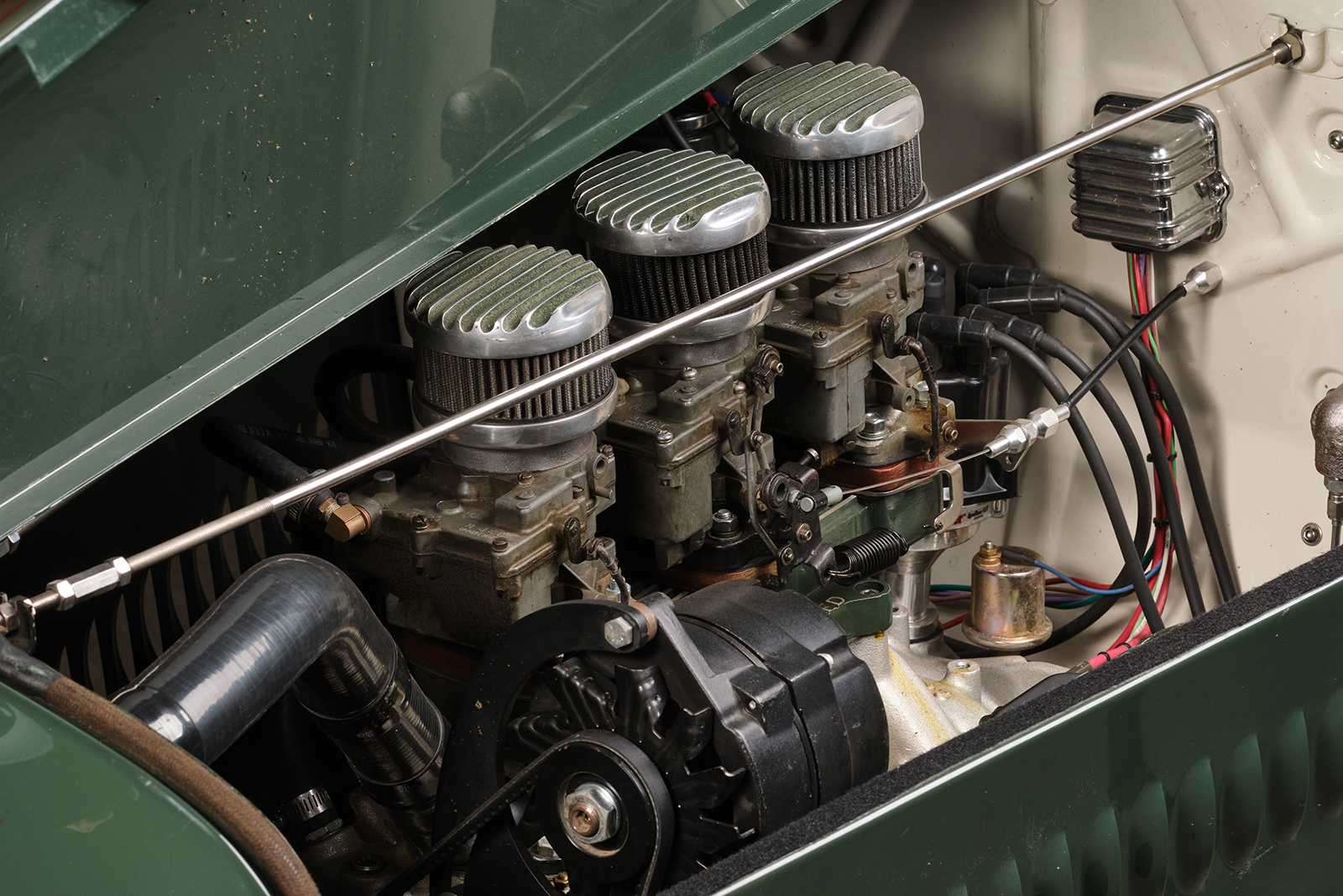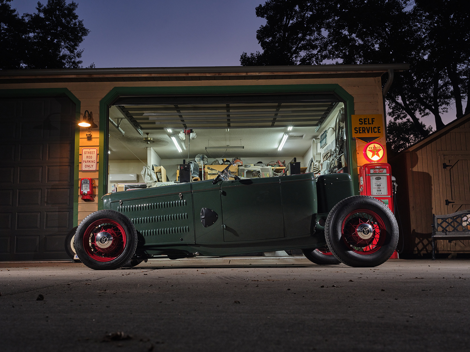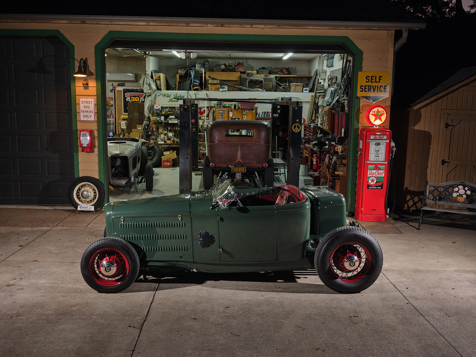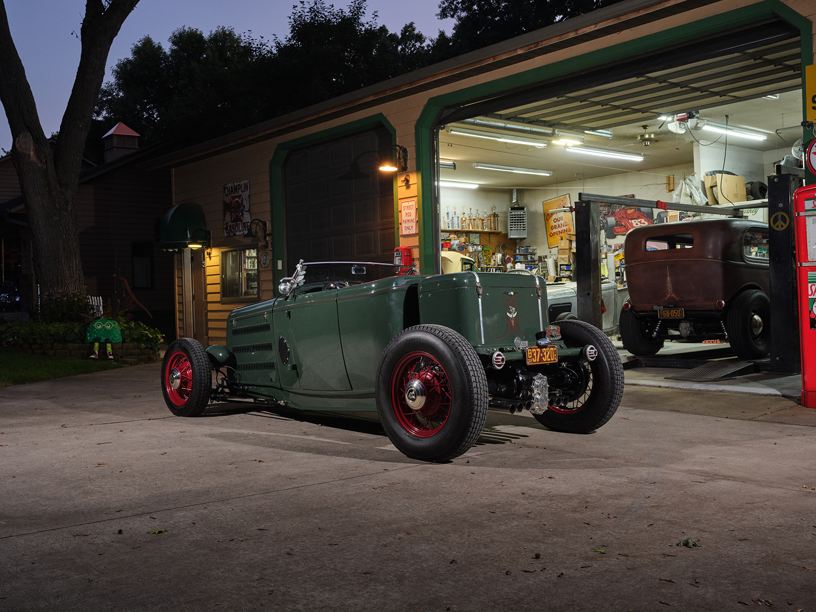 The powertrain for this old-timey-appearing hot rod is an iron small-block 355ci Chevy. It runs an Edelbrock Performer EPS single four intake with an adapter, allowing the Vintage Speed Rochester Tri-power setup to feed the fuel.