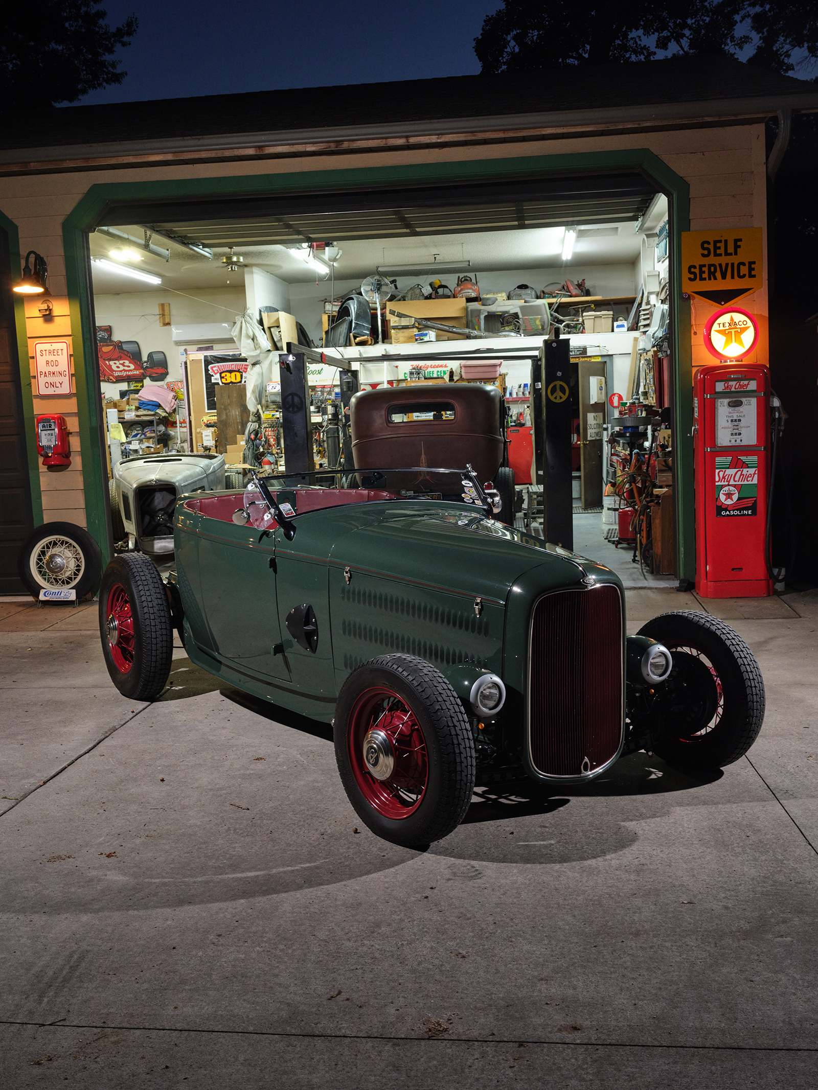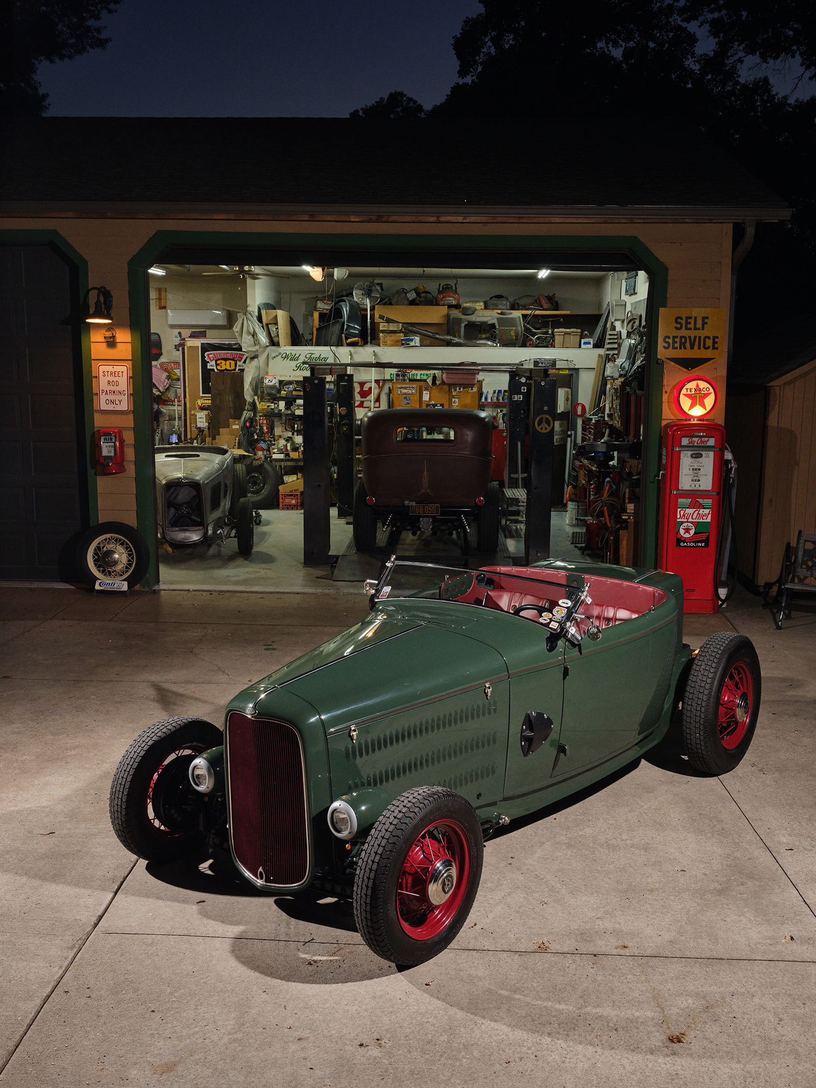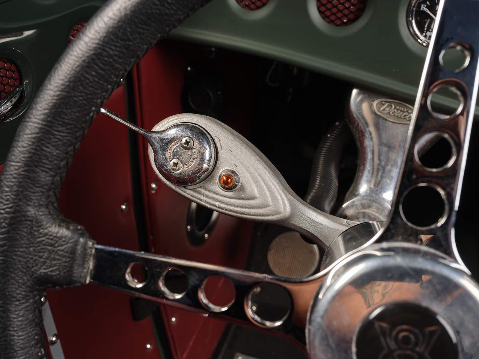 The project began at Cornhusker Rod & Custom where the chassis was built based on American Stamping Deuce framerails that were boxed, pinched in front, and stepped and bobbed in the rear. The chassis features a SO-CAL Speed Shop 5-inch drop-and-drilled I-beam axle with a transversely mounted leaf spring utilizing early Ford spindles and reproduction early Ford lever action shocks. The street rod steering standby is the Vega box with a Speedway Motors quick-release feature steering column and a LimeWorks drilled four-spoke steering wheel. Attached to the Speedway column is a vintage Yankee 960 turn signal mechanism rewired to work in today’s climate.
