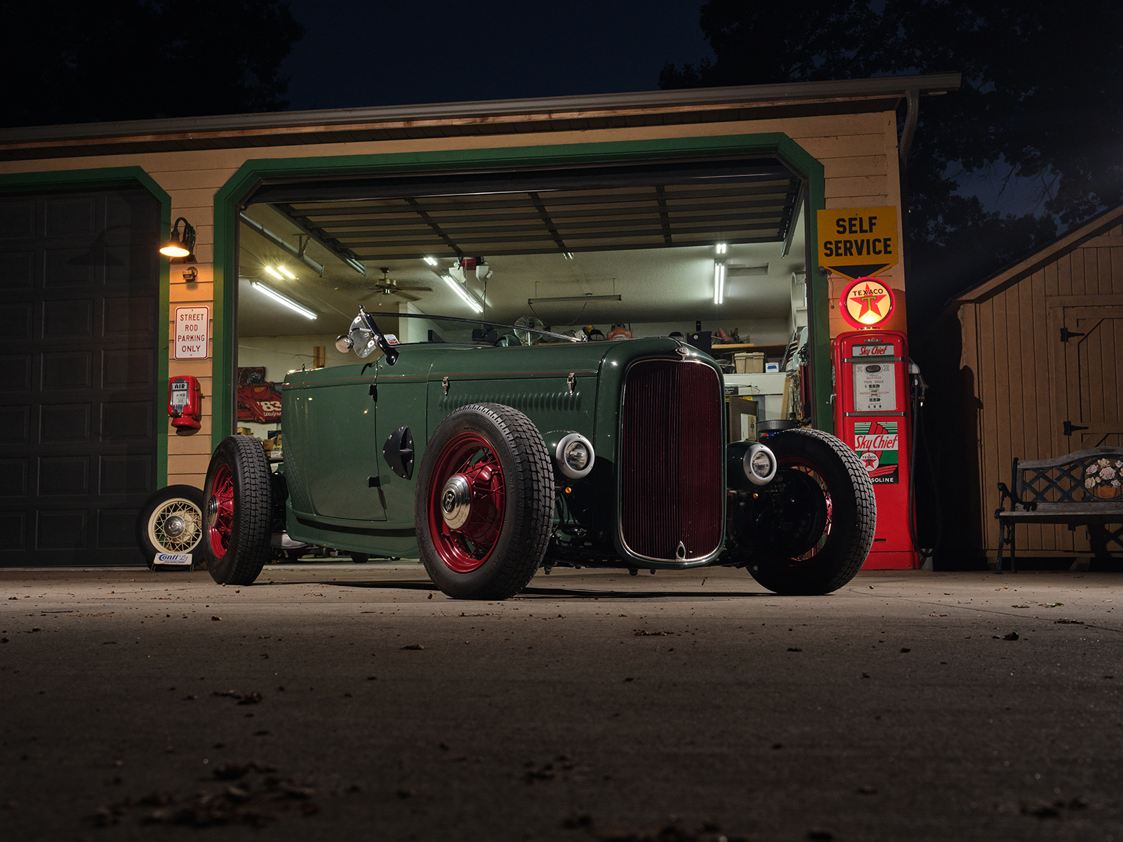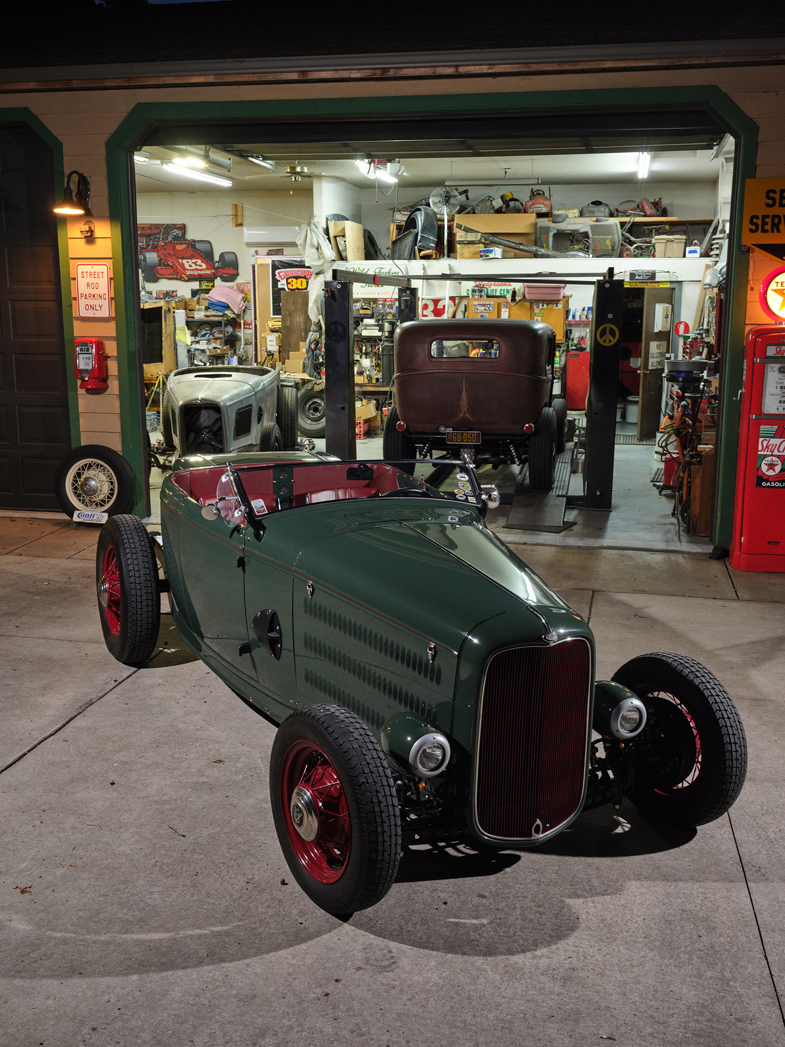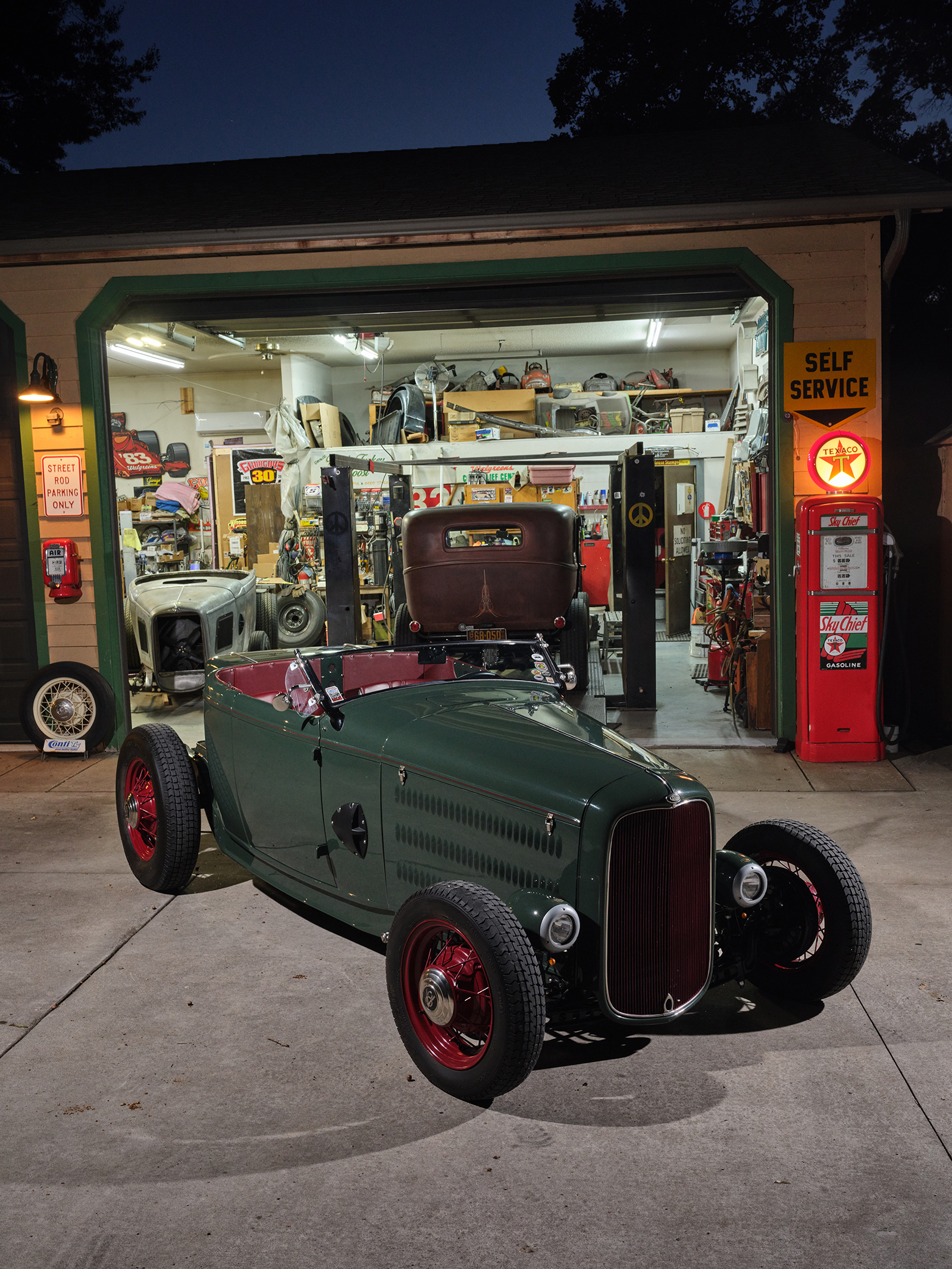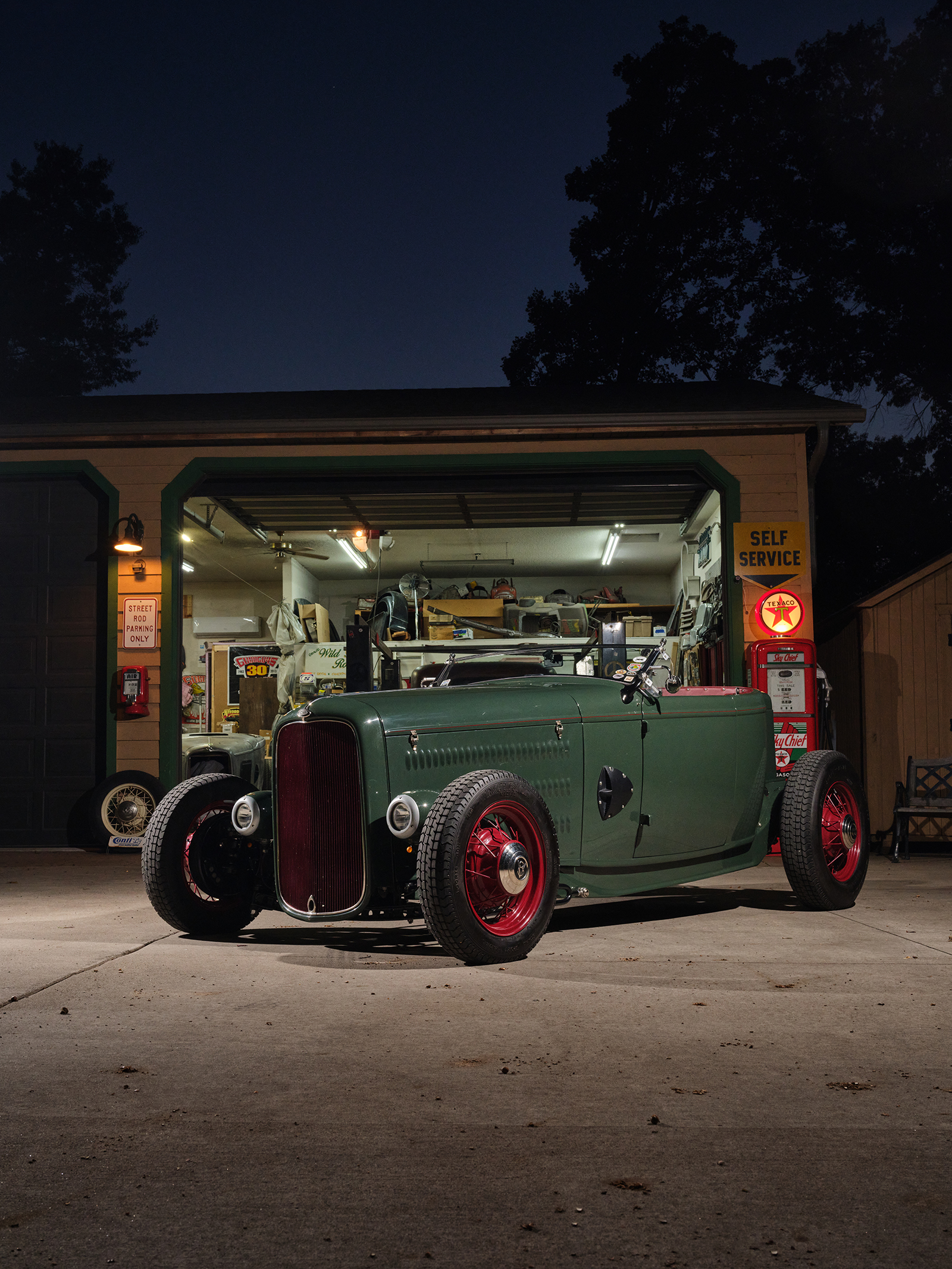 The project began at Cornhusker Rod & Custom where the chassis was built based on American Stamping Deuce framerails that were boxed, pinched in front, and stepped and bobbed in the rear. The chassis features a SO-CAL Speed Shop 5-inch drop-and-drilled I-beam axle with a transversely mounted leaf spring utilizing early Ford spindles and reproduction early Ford lever action shocks. The street rod steering standby is the Vega box with a Speedway Motors quick-release feature steering column and a LimeWorks drilled four-spoke steering wheel. Attached to the Speedway column is a vintage Yankee 960 turn signal mechanism rewired to work in today’s climate.