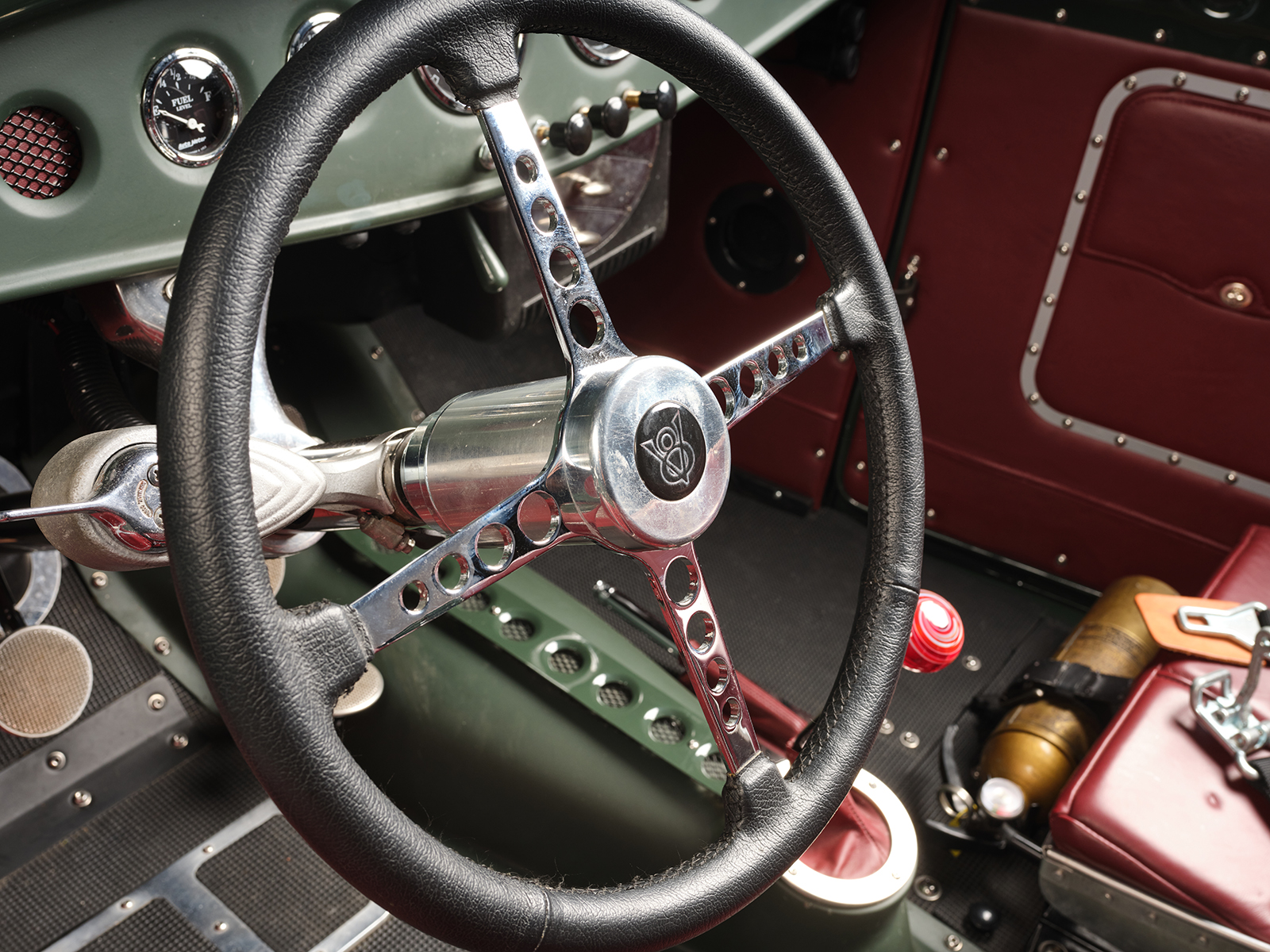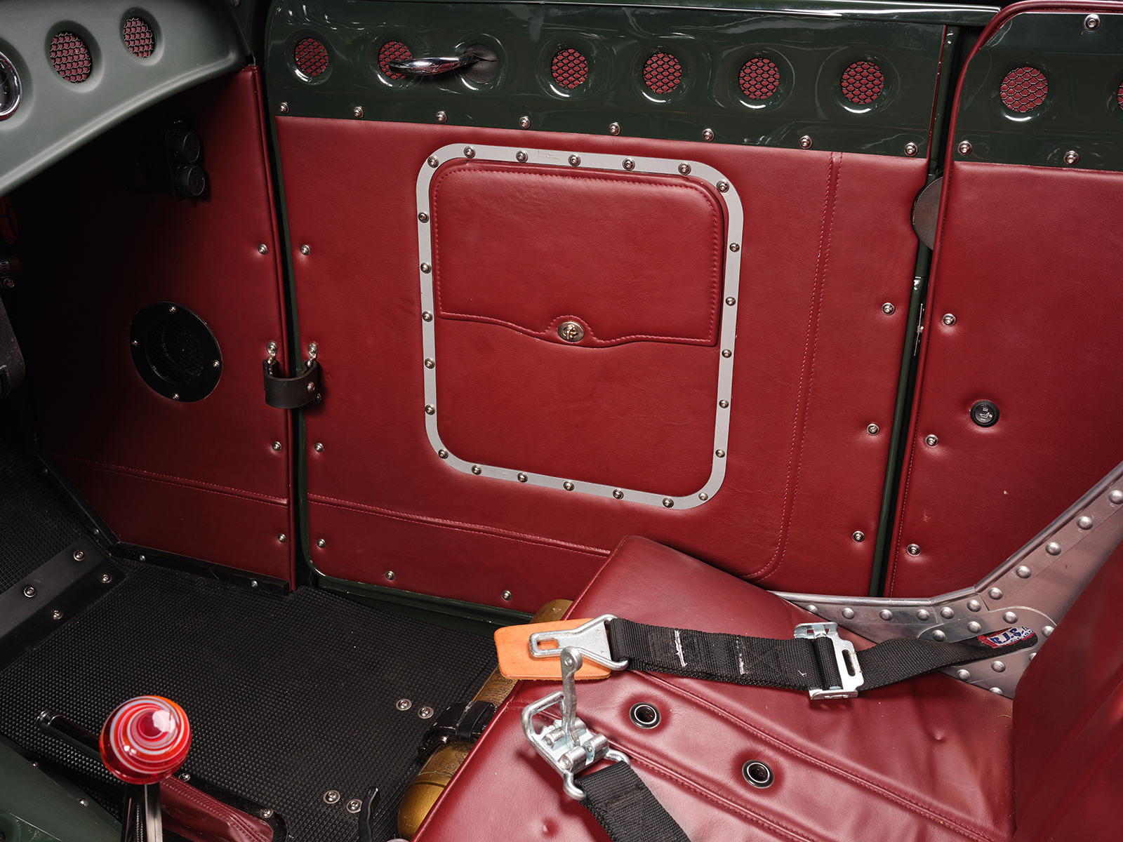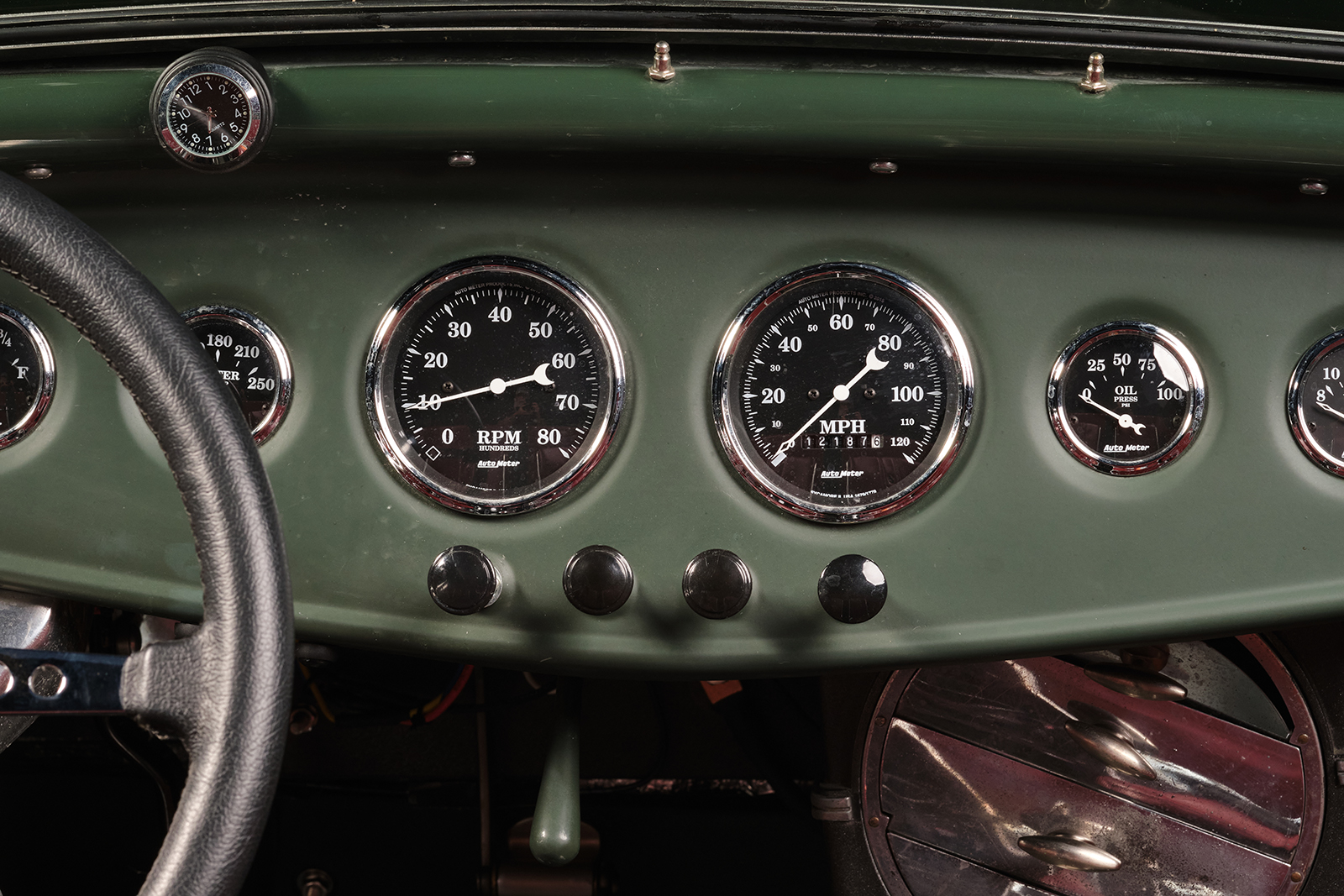 Inside, the decidedly race car–inspired interior has a steel dash with dimpled (soft rolled) gauge holes. There are also accessory holes with a screen and red leather backing. The red leather matches the seating material positioned by Sauk Rapids Upholstery over the Paul Wright aluminum bomber-style pair of buckets. The “carpeting” is positioned with rubber mats, making cleaning up an easy chore. No vacuum; get the garden hose out. The individual instrument holes are filled with Auto Meter gauges, including an 8-grand tach and 120 speedometer. There is also an analog watch face mounted to the dash just above the water temperature gauge above the steering wheel to fill in the time of day or night that Dale has an enjoyable time driving his ride. All the necessary wiring comes from a Wiremaster Power Panel II and a deluxe wiring kit from Affordable Street Rods was wired into place by Dale.