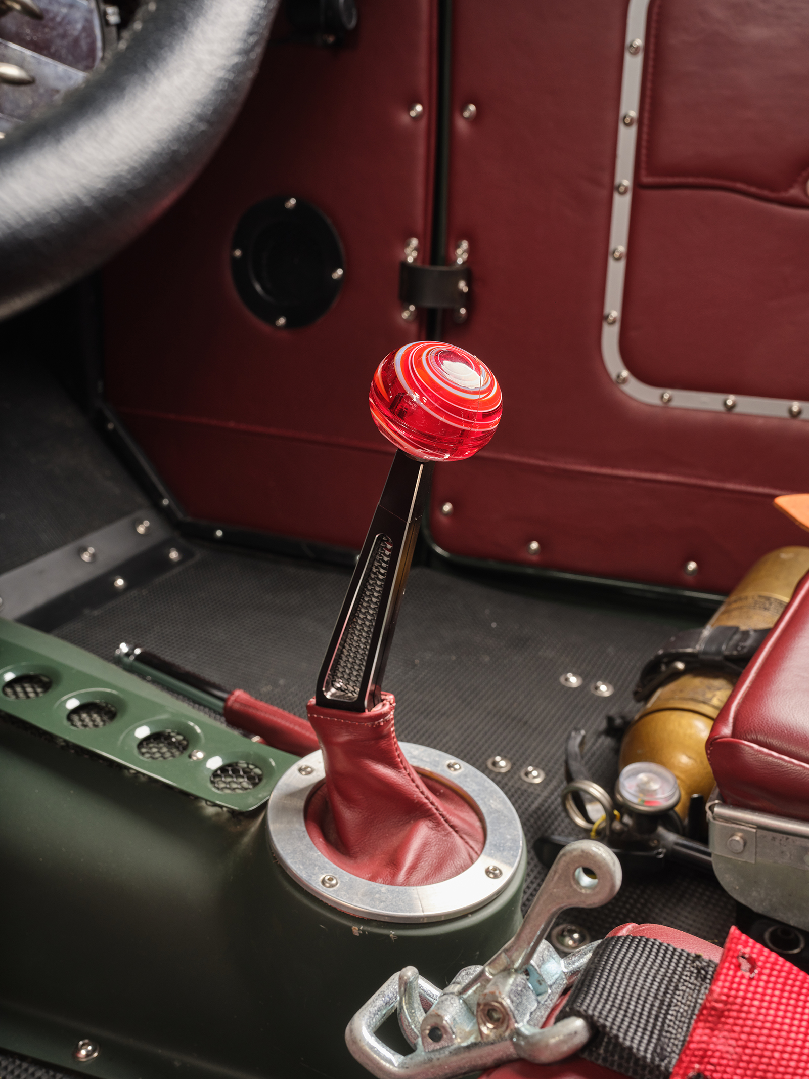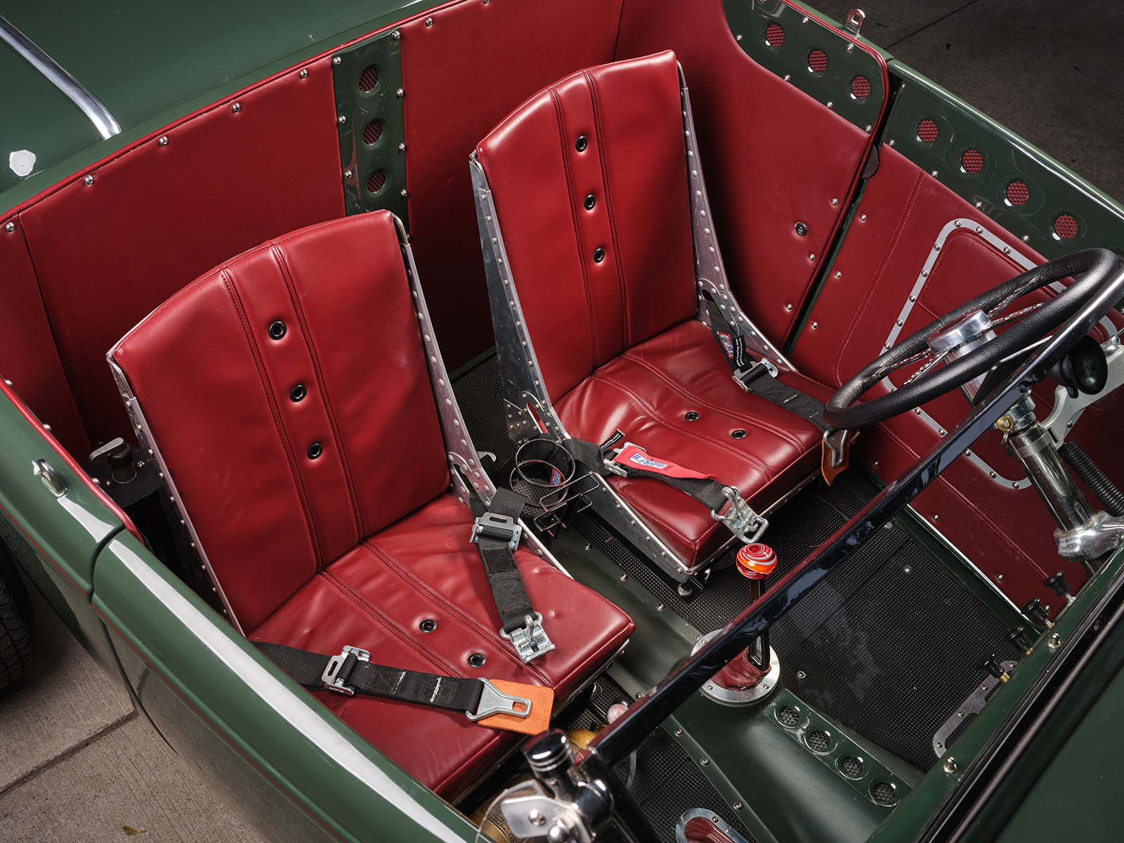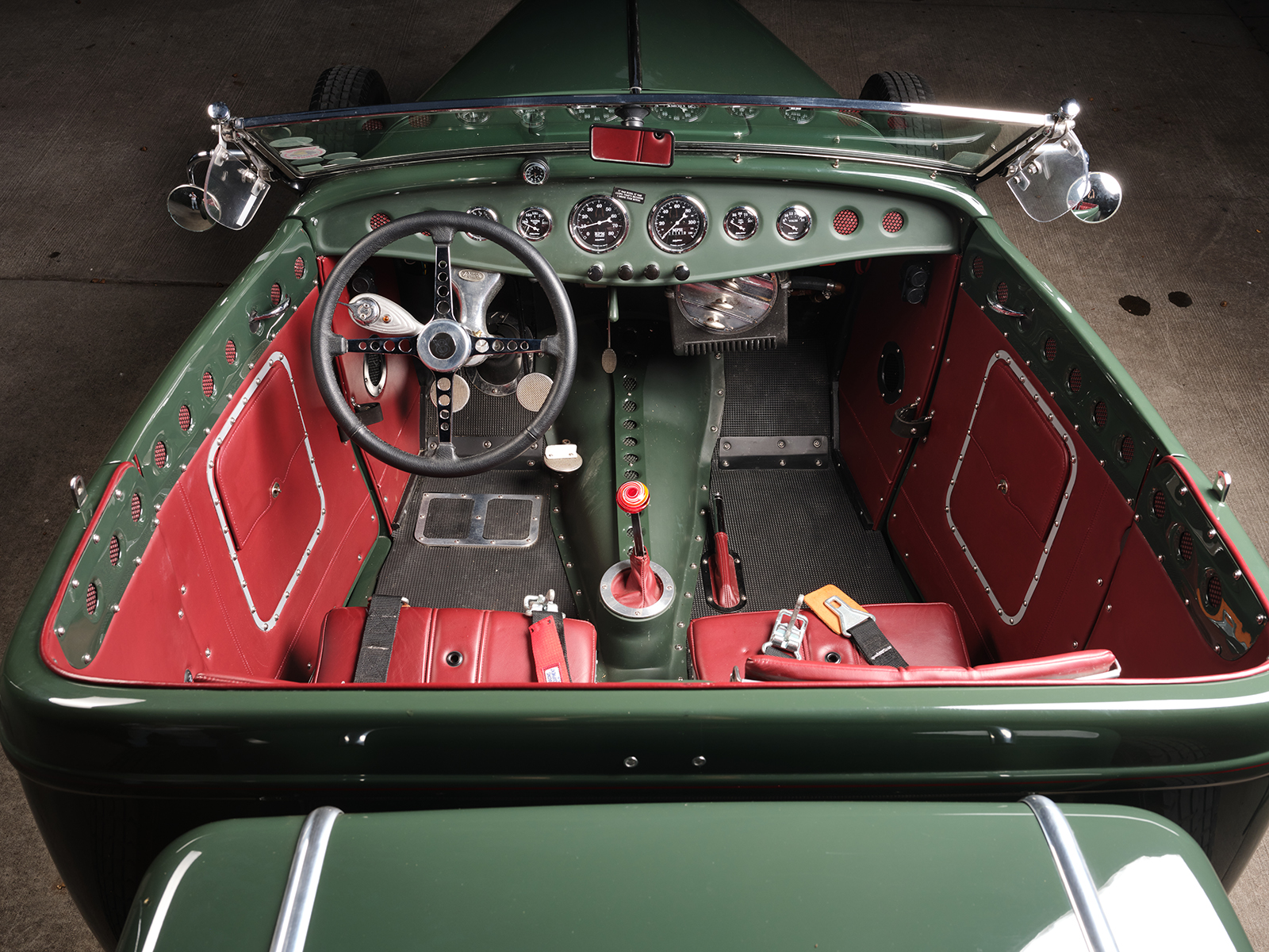 Inside, the decidedly race car–inspired interior has a steel dash with dimpled (soft rolled) gauge holes. There are also accessory holes with a screen and red leather backing. The red leather matches the seating material positioned by Sauk Rapids Upholstery over the Paul Wright aluminum bomber-style pair of buckets. The “carpeting” is positioned with rubber mats, making cleaning up an easy chore. No vacuum; get the garden hose out. The individual instrument holes are filled with Auto Meter gauges, including an 8-grand tach and 120 speedometer. There is also an analog watch face mounted to the dash just above the water temperature gauge above the steering wheel to fill in the time of day or night that Dale has an enjoyable time driving his ride. All the necessary wiring comes from a Wiremaster Power Panel II and a deluxe wiring kit from Affordable Street Rods was wired into place by Dale.