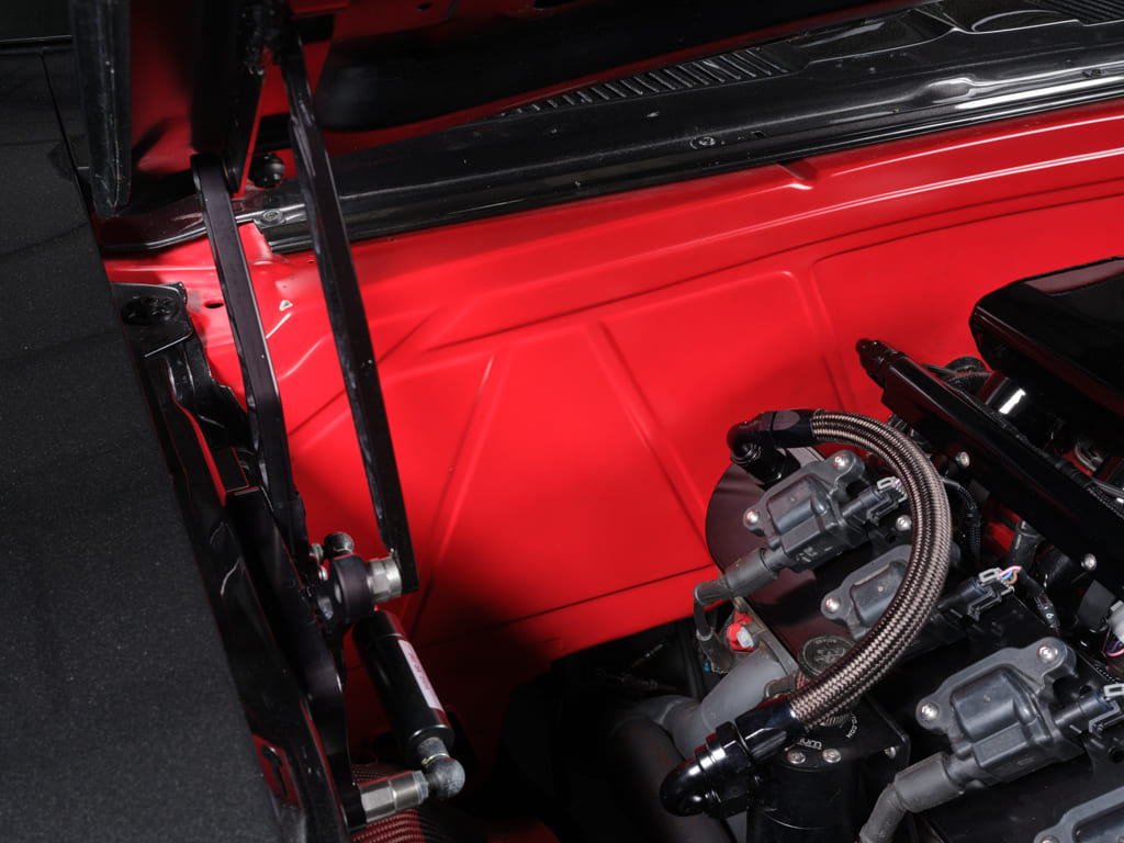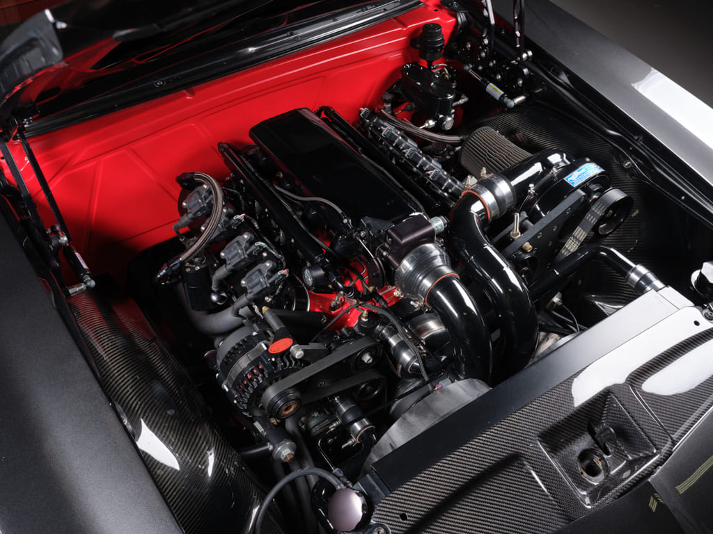 Ancillaries: Ringbrothers hood hinges, Spal dual electric fans, Afco aluminum radiator, 140-amp Powermaster alternator, Motion Raceworks valve covers, MSD wires, Fragola fittings and hoses, custom intercooling piping by Octane and Iron, Rick’s Tanks fuel tank with ZL1 pump, VaporWorx fuel system, Anvil Auto carbon-fiber inner fenders and header panel