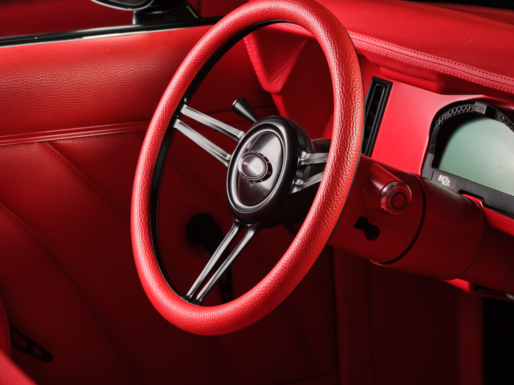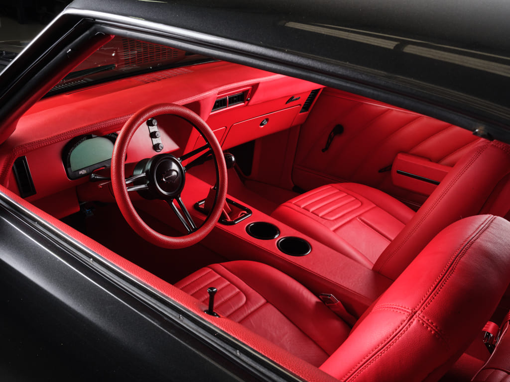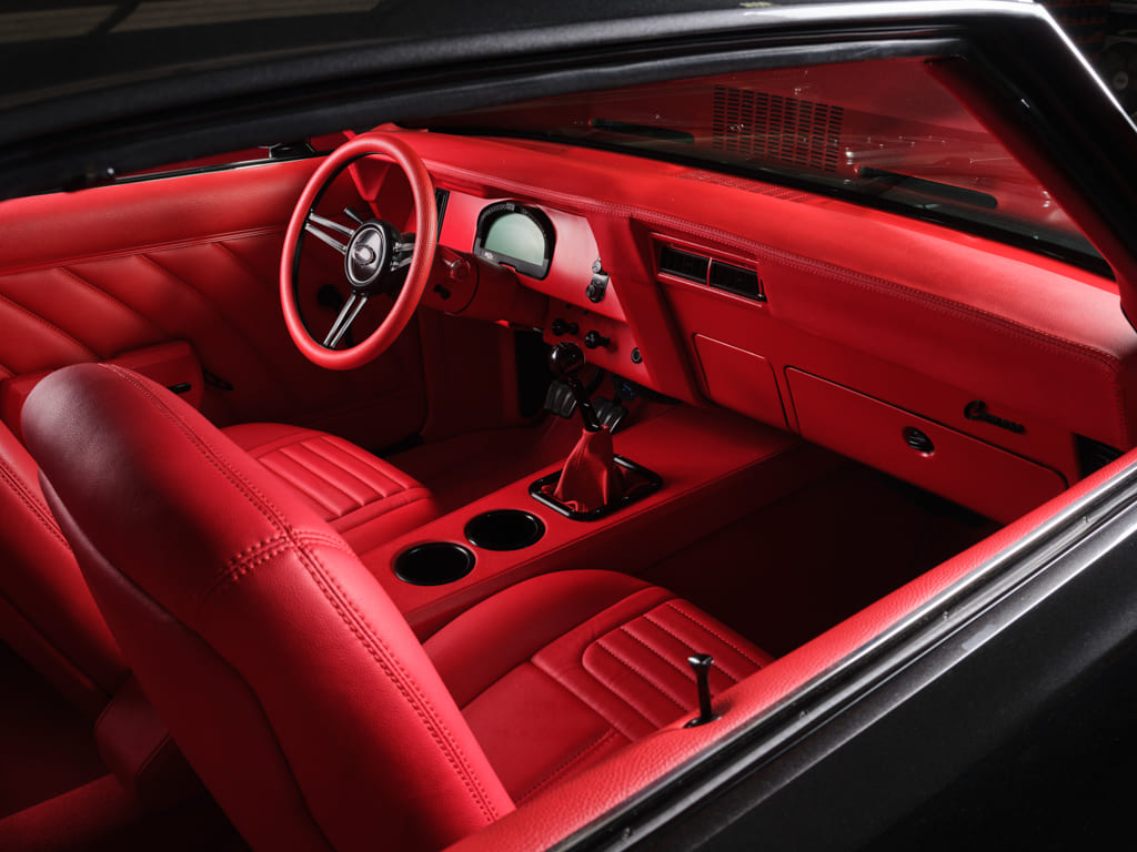 Sublime Heights in Houston took on the interior and treated it to a sea of red Ultraleather that covers the modified factory seats, custom door panels, dash, and custom center console for an outstanding visual treatment. A Racepak IQ3 data system and Vintage Air control panel are housed in a Detroit Speed dash insert also painted red to jive with the whole ensemble. Factory red loop carpet ties it all together for a cohesive performance-inspired cockpit.