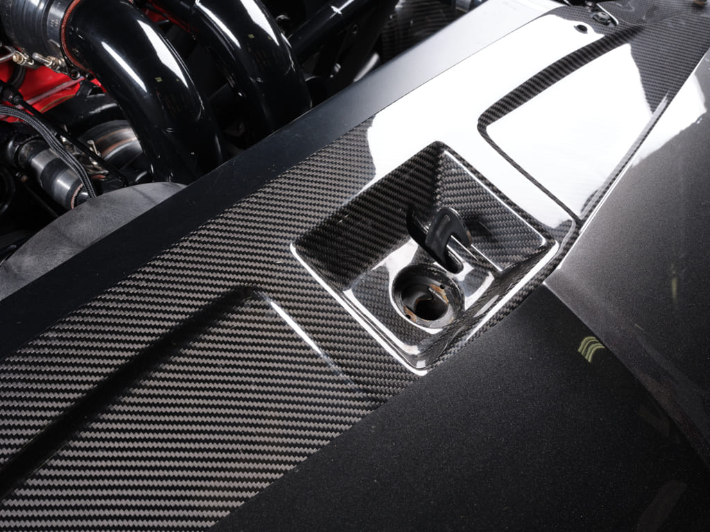 The Octane crew outfitted the engine in an all-black setting, including a Holley Sniper intake, Motion Raceworks valve covers, ProCharger drive system, Fragola fittings, and custom plumbing, then surrounded it in carbon-fiber inner fenders and header panel, creating the appropriate architecture for such a shamelessly menacing powerplant.
