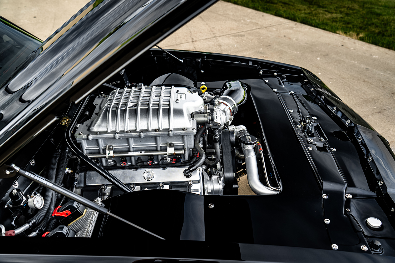 The Mopar 6.2L Hellcat V-8 utilizes all this performance-tuned suspension and now transfers 814 rwhp and 773 lb-ft of torque to the rear wheels. The Hellcat now features a custom 5-inch aluminum air intake tube, CNC-ported aluminum heads, custom billet valve covers, and stock ignition. Other power-boosting accessories include the larger lower pulley on the supercharged V-8, 1,300cc injectors, and tuned for E85 gasoline. The OEM Hellcat radiator and a Fluidyne intercooler handle the cooling chores. The exhaust system begins with Schwartz Performance–fabricated stainless steel 1-7/8-inch headers dropping into 3-inch tubes running back to a pair of MagnaFlow mufflers with Stainless Bros. resonators. The Mopar 8HP90 automatic is coupled to the Hellcat and uses a factory Hellcat shifter.
