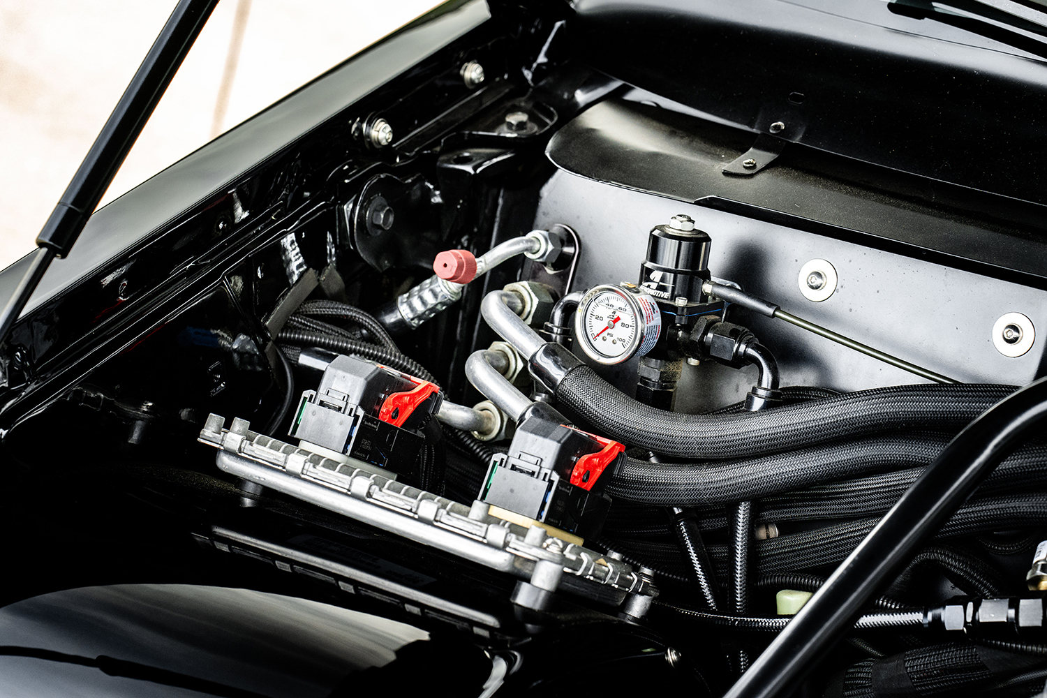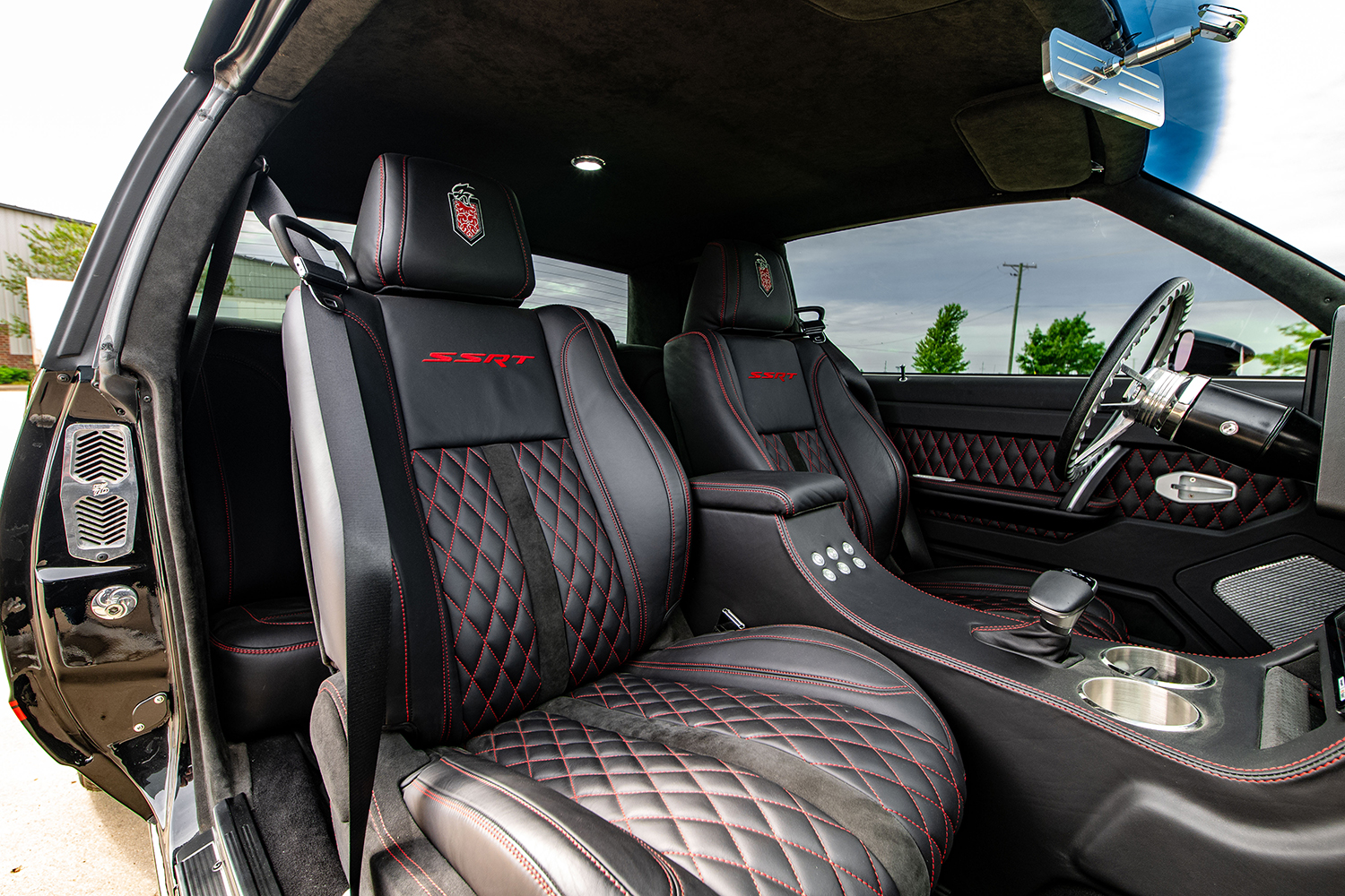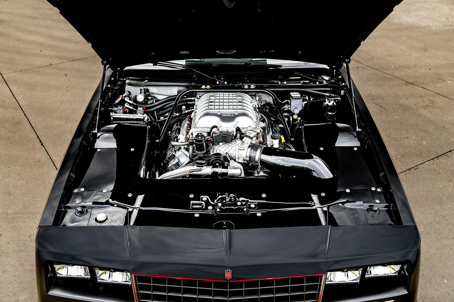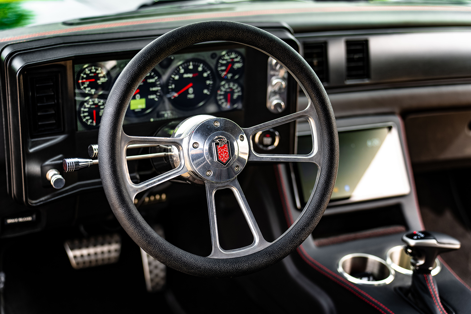 The body is effectively a stock G-body 1985 Monte Carlo with all the body- and paintwork in Diamond Black from the Dodge palette of colors, performed at Schwartz Performance. The interior still uses the factory Monte Carlo dash, now outfitted with a Holley 12.3-inch Pro-Dash and the Vintage Air A/C controls. This aftermarket instrument panel is customizable with various gauge and indicator screens that can be programmed to display any parameter you need from a Holley EFI system. You can also tune the engine without hooking up to a laptop, making this dash-instrument system highly useful. An American Autowire universal wiring harness is used with a custom engine harness to provide the obligatory electrics. Also employed is the Flaming River tilt column with a Billet Specialties steering wheel with the Hellcat logo on the horn button. The seating and center console are more Hellcat interior accessories. The black leather with the red stitching in the “Red Key” treatment is another homage to the Hellcat identity skillfully stitched by Cassin Customizing.