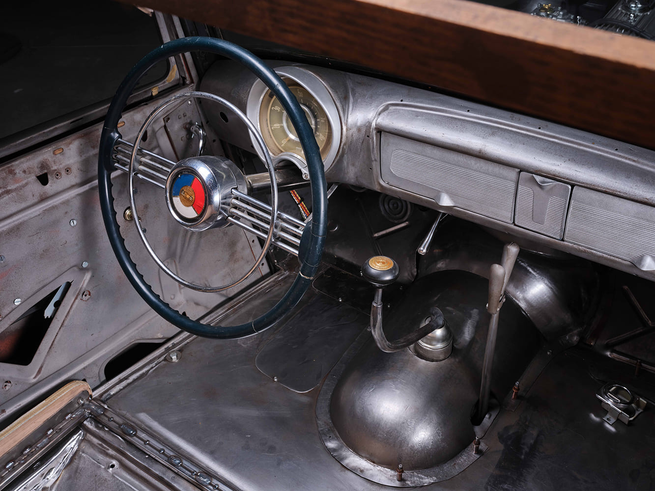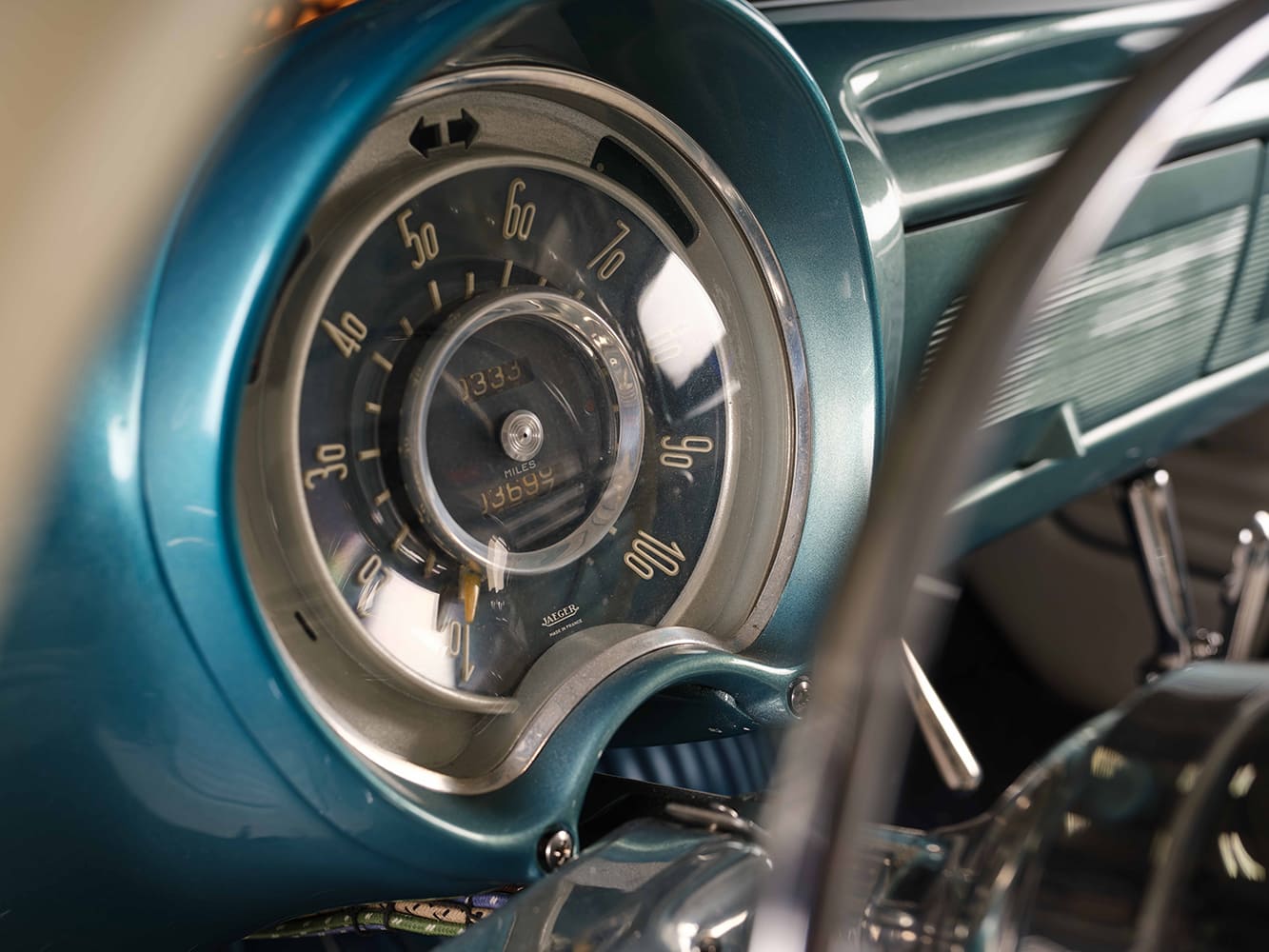 Inside the cut-down cabin, “Mikey Seats” Lippincott created a lush interior that looks as if it could have rolled right out of 1962. “I wanted thin pleats, and I wanted tufts,” Walls says. “I wanted an era-specific, Eddie Martinez–style interior, and I pretty much let Mikey loose on it.” The result is a trim tour de force, layering pearl white and dark blue vinyl with vintage Mercury cloth, all stitched into overstuffed tufts and skinny pleats traversing every surface. A modified 1958 Simca dash was coated in beautiful candy pearl, and a 1952 Buick wheel recast by Steering Wheel Kris tops a chrome LimeWorks column.