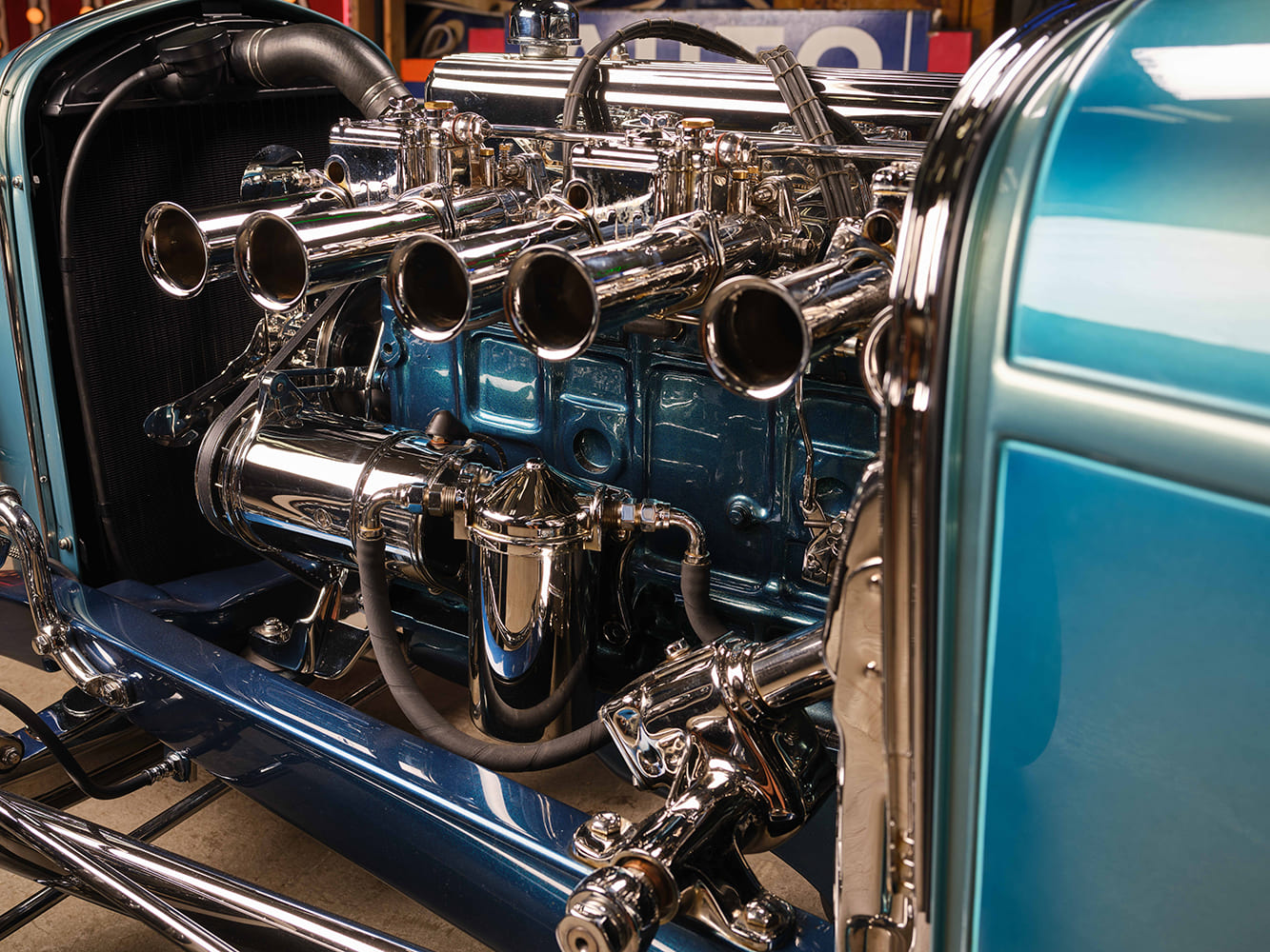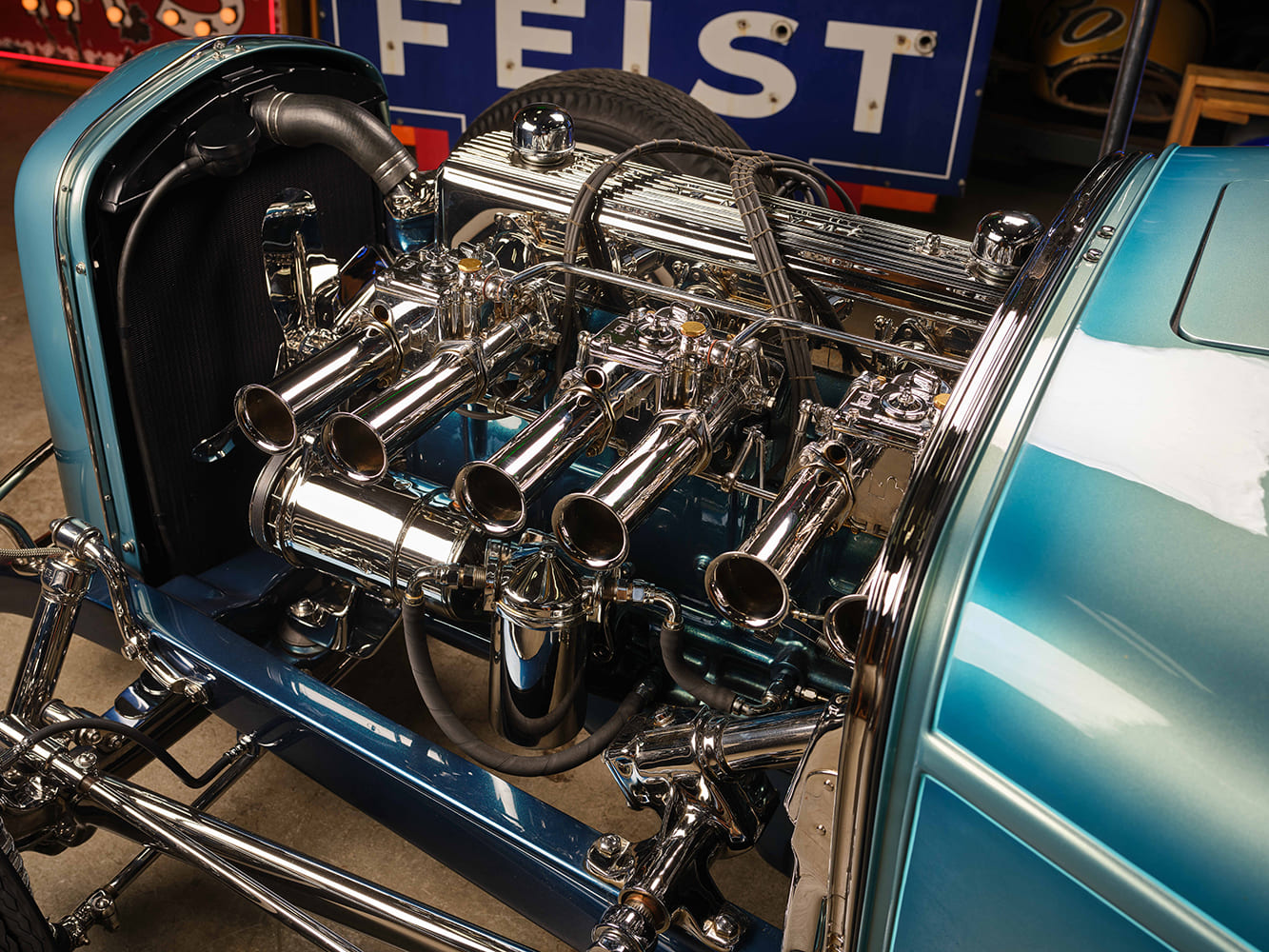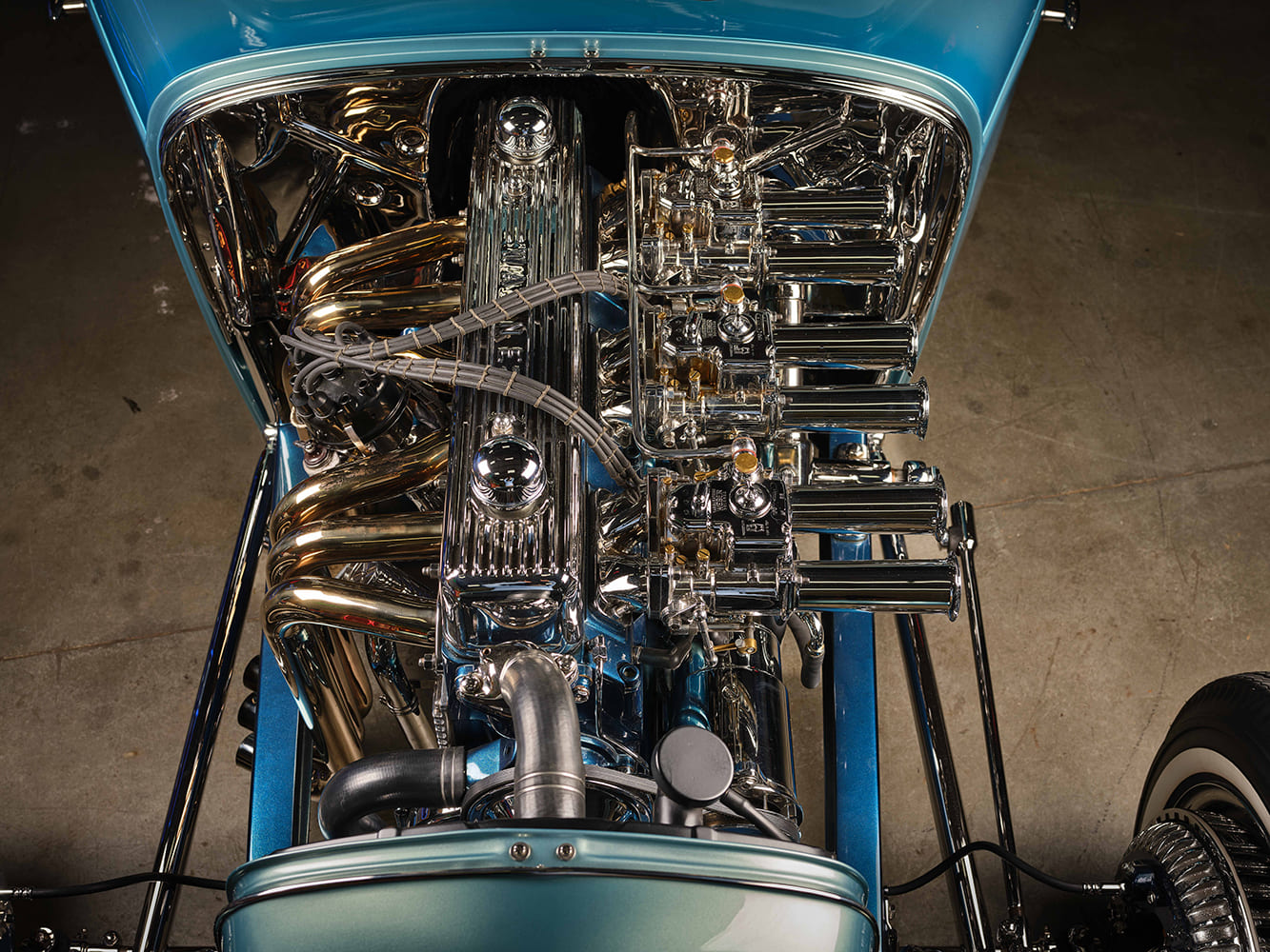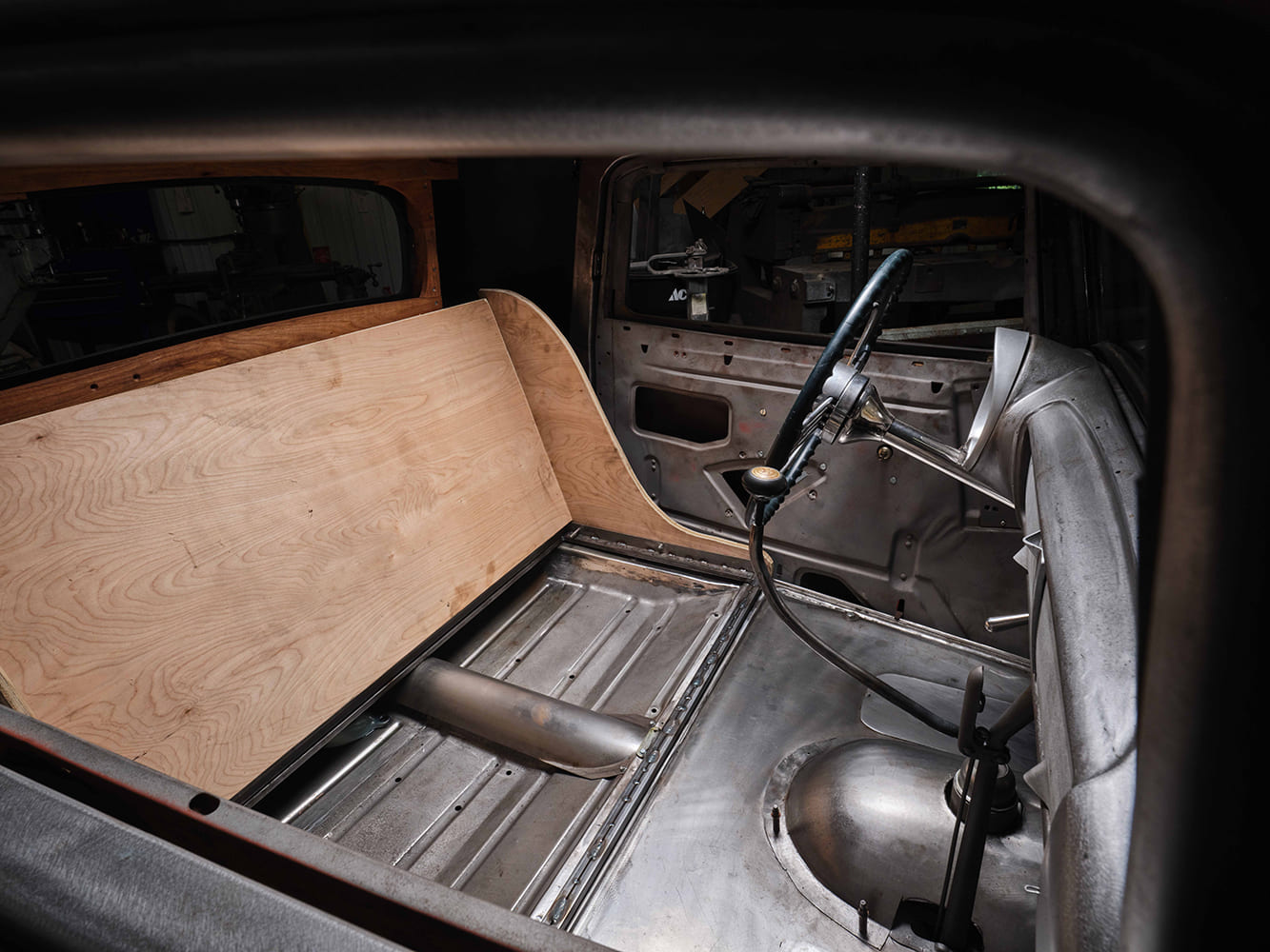 Many know Cody by his Delaware shop, Traditional MetalCraft, but this car predates that business, as he’s been collecting parts for it since 2005. “I knew it was going to have a Chevy inline with a Wayne 12-port,” he says. “And that took a good 10-year search before I finally found one on eBay in 2015.” The original steel body turned up in a Sacramento barn. Though the floor was gone it appeared to have been channeled, with the roof and cowl vent filled and abbreviated fenders molded to the body. But it was solid, and most importantly, the roof was un-chopped.