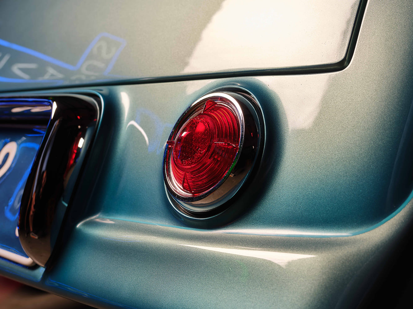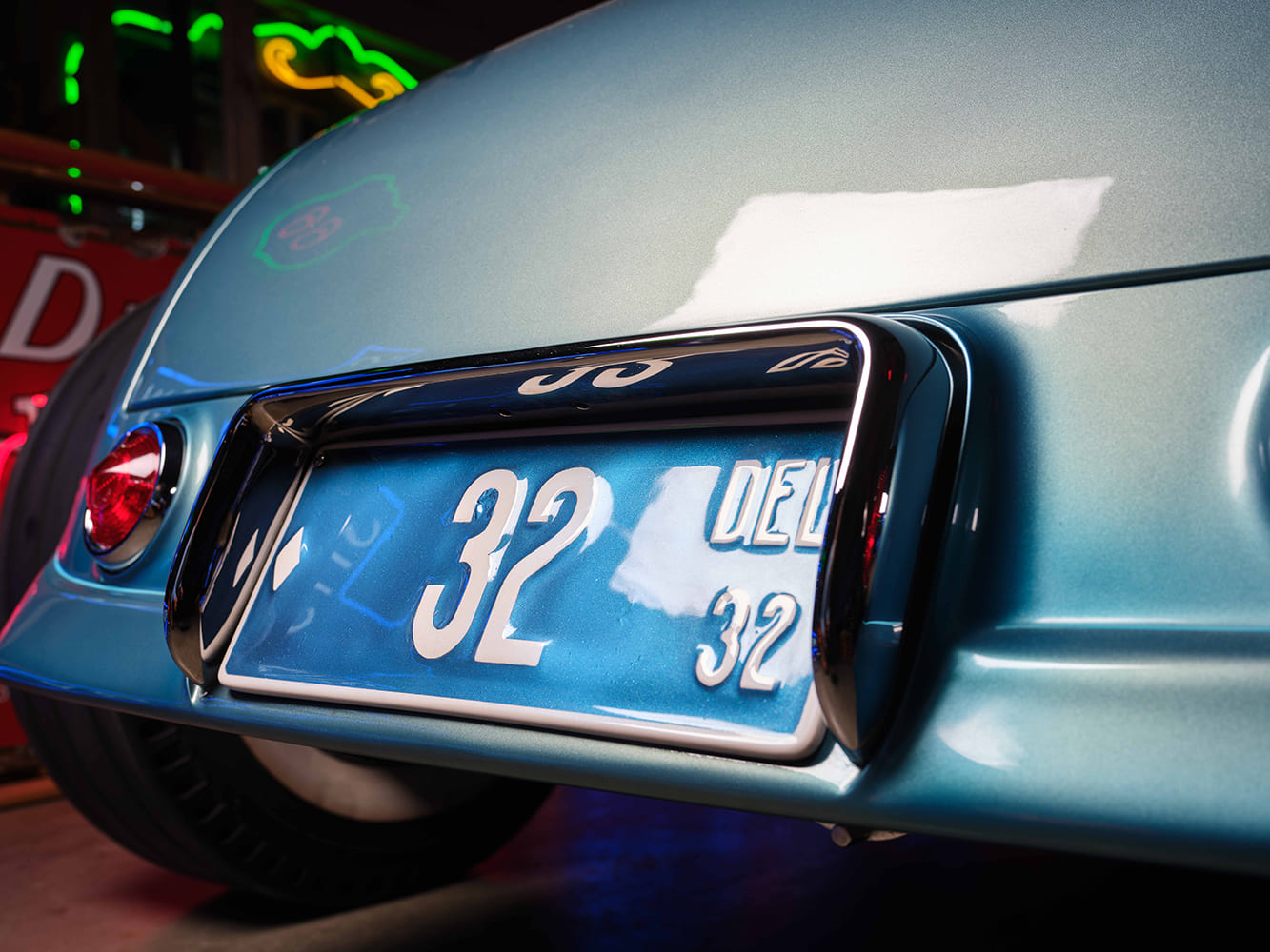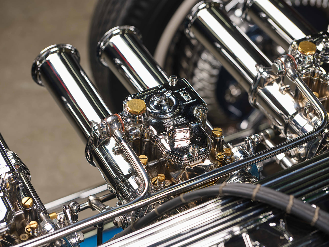 Another rare piece of speed equipment is the early Spalding dual-point, dual-coil distributor, which combines a Chevy base with a Nash “Twin 6” cap and rotor. It’s fed by a modified Powermaster PowerGen alternator, which, along with the American Autowire cloth-covered wires, keeps things looking traditional. The engine is assembled with ARP hardware and topped with three Weber DCOE 42s from a 1957 Maserati atop a custom York Speed Equipment intake. Exhaust travels through a beautiful set of Cody’s handmade headers, which cascade down the engine and under the framerail. Copious brightwork is courtesy of Jon Wright’s CustomChrome Plating.