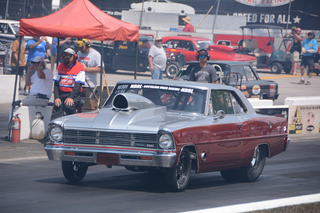 Hundreds of drag cars pack into the pits, with a huge range of classes. Nostalgia Top Fuel dragsters, Nostalgia Funny Cars, and AA/Fuel Altereds are the stars of the show, but hundreds of other cars keep the track hot for all three days of the event. Other classes include Hot Rod, Pro Comp, Pro Gas, and a series of heads-up index classes. Some of the themed classes are the Geezer Gassers, Nostalgia Super Stock, Nostalgia Pro Stock, and the Straight Axle Mafia group. Of all 14 classes, one of the most entertaining was Modified Production, a class for cars with a manual transmission—and these cars were flying! There were also Exhibition cars, including Boyd Howe and Mike Bilina in their wheelstanding Tri-Five Chevys. Throughout all the classes, there was a high percentage of Chevrolet entries, or at least Chevrolet horsepower in the case of the dragsters and altered roadsters in the heads-up index classes.