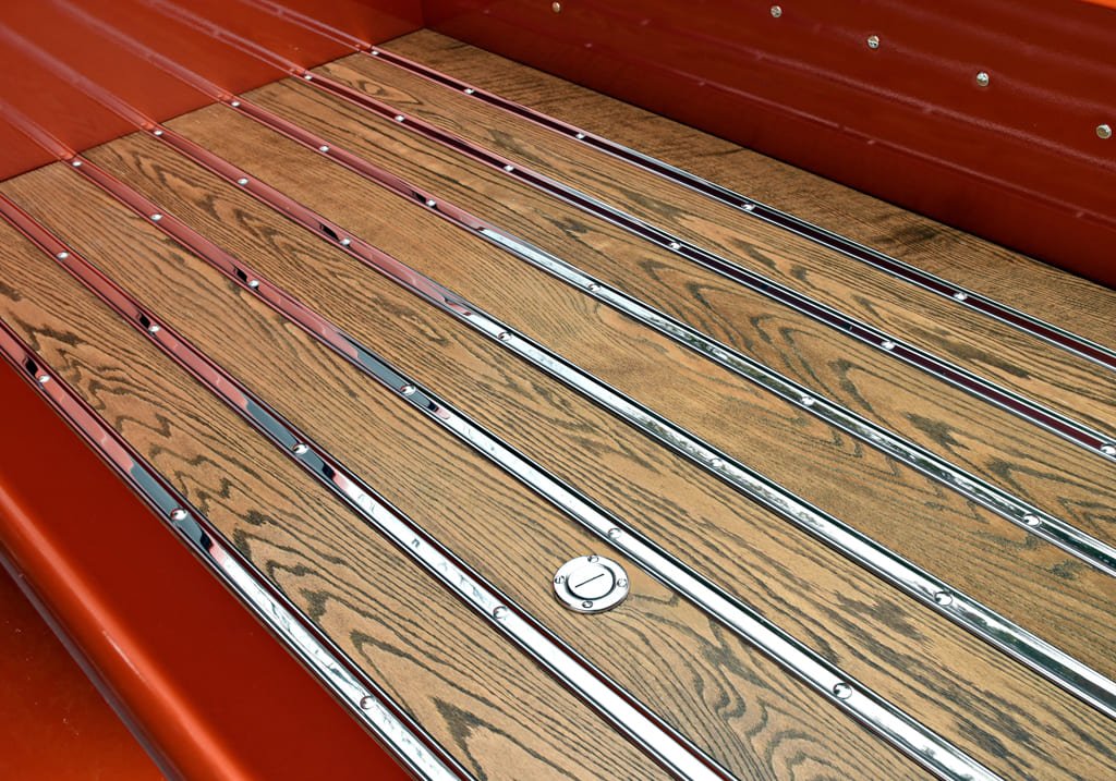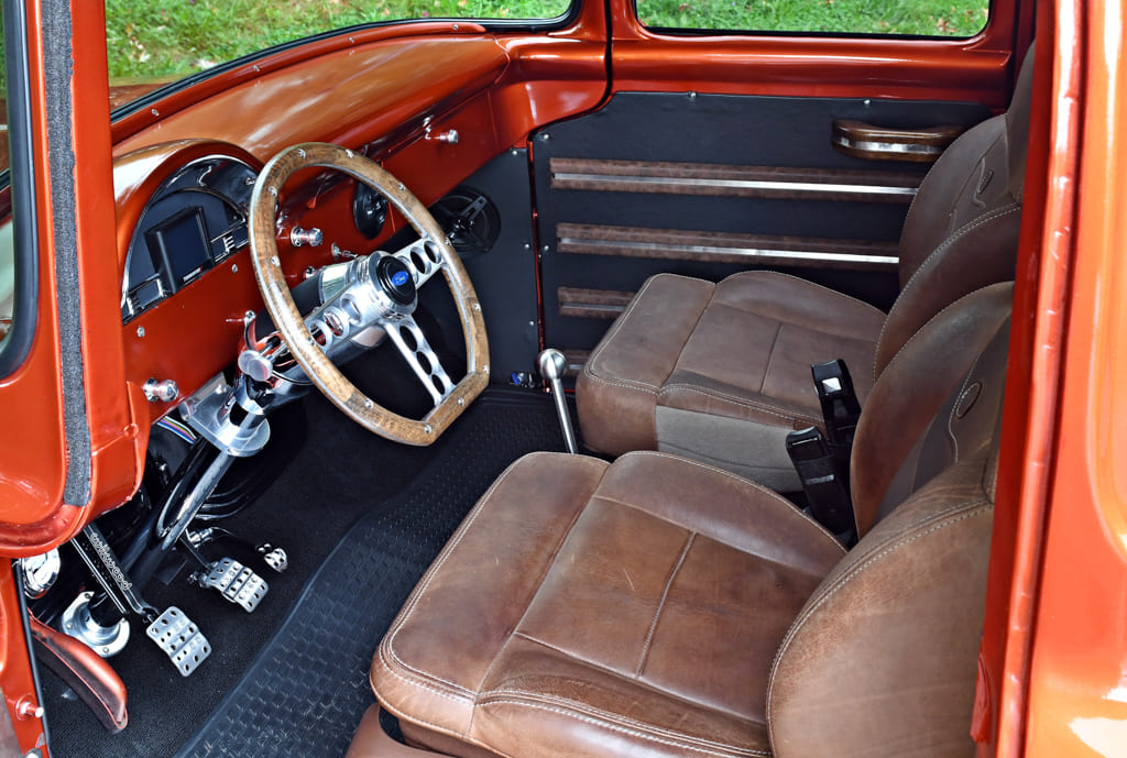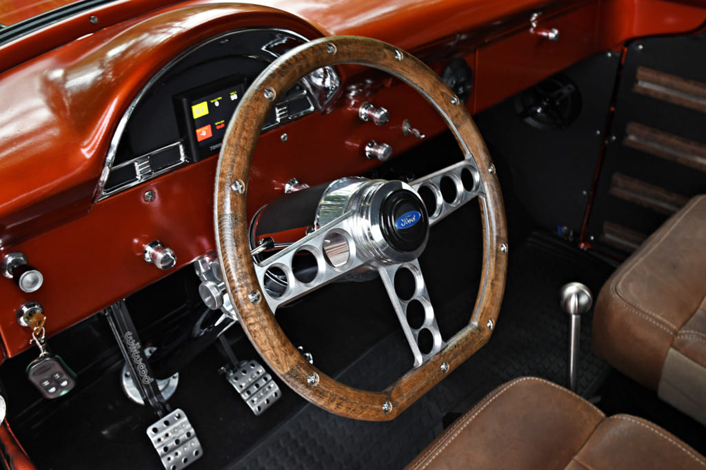 To finish off the build, Kyle moved to the interior. “I scored a pair of buckets from an ’08 King Ranch. Next, I installed a Holley 3.5-inch LED dash to keep track of the vitals. The door panels are pieces that I also made from scratch. I designed and fabricated the oak and aluminum steering wheel, which twists a modern ididit column. I think the wheel is pretty impressive, if I do say so myself.” Adding to the overall appeal of the truck, Kyle laid out a wood bed made of red-stained dark walnut, accentuated with chrome spacer strips.