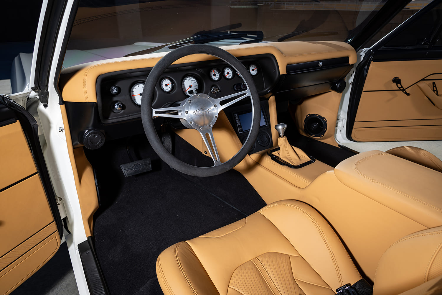 Next, Rob turned his attention to powering the Chevelle with a modern engine and transmission combo. What he landed on was a 2018 GM LS3 and 4L70E. A custom set of RJ Fabrication headers were attached to the car’s new powerplant, along with a dual exhaust system that was channeled through the frame and paired with Flowmaster 40-Series mufflers. A Ron Davis aluminum radiator and SPAL fan keeps the LS3 cool, and a Vintage Air Front Runner accessory drive system dresses up the engine while allowing it to perform at peak operation. Once the dust settled, the horsepower count of the LS3 hovered right around 525 with 489 lb-ft of torque—quite a bit more muscle than Troy was used to, but was ready to embrace.