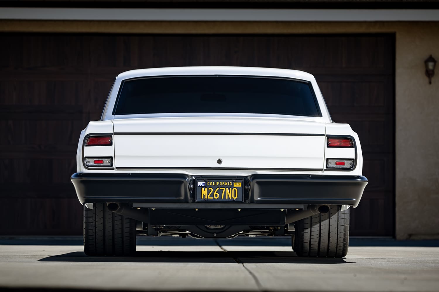 To help keep the progress rolling, the crew at RJ Fabrication replaced the quarter-panels, hand made new taillight housings, raised the floor 3 inches, and expertly fabricated custom wheeltubs. Then, ASEN Auto, also in Hesperia, teamed up with Lindsay to handle the bodywork and paint portion of the build. Once those one-off touches were complete, the crew at ASEN sprayed a custom shade of white Valspar paint with Phantom Pearl and finished the car off with new Dapper Lighting headlight housings for a modern spin on an OEM appearance.