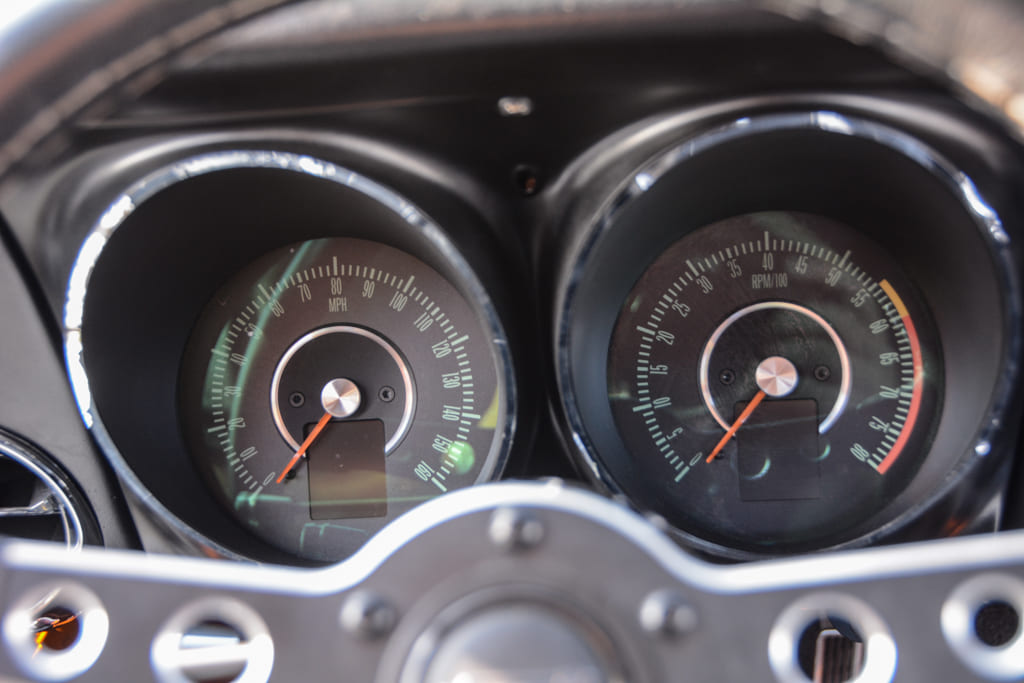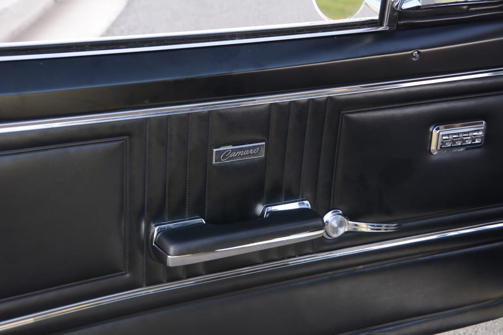 011 Interior view of the 1967 Camaro featuring black seats and dashboard
