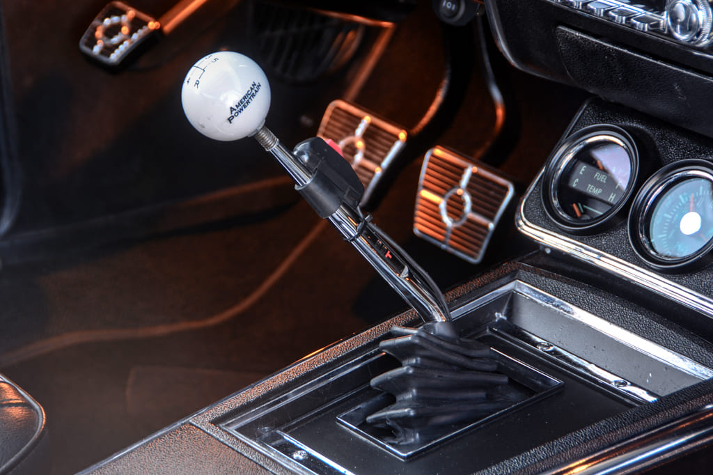 Although C.L. wanted the car to be tame enough for street driving, he didn’t forget his drag racing roots. Stephen had purchased a turnkey ’68 Camaro drag car and wanted to make some changes, so the 496ci big-block came out of the drag car and made its way into the street car. Even though it has 12.0:1 compression with a ground-pounding Comp solid roller camshaft, C.L. has no hesitation in driving it on the street. The car runs cool thanks to a Griffin aluminum radiator and electric fan setup, and it even has Vintage Air A/C to keep cool on the hot summer days. He dressed the big-block in satin black and chrome and detailed the engine bay nicely with a smoothed firewall. The car’s intense fun factor comes from the TREMEC TKO five-speed transmission, which takes C.L. back to his early days of banging gears on the street and dragstrip.