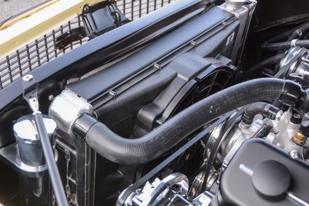 The body and paint were in surprisingly good shape, considering the age, so he gave it some detail work, and freshened the interior. While he had it apart, he installed new tinted glass and added Dynamat to the floors and doors to keep the cockpit comfortable. He also installed power windows, Dakota Digital gauges, an ididit tilt steering column, and an MPI steering wheel.