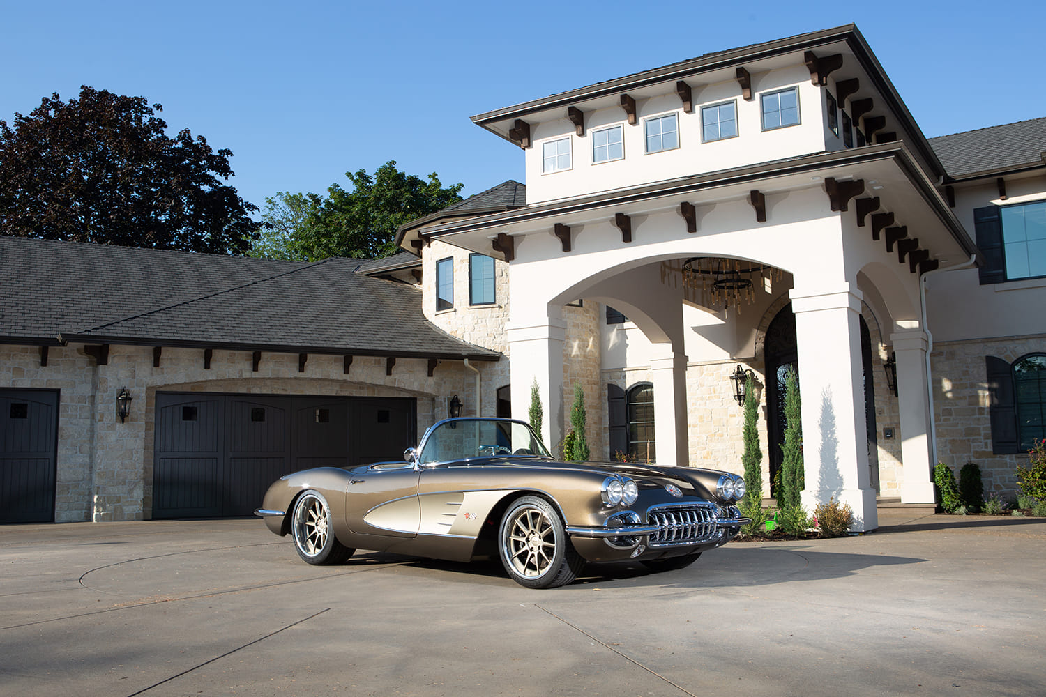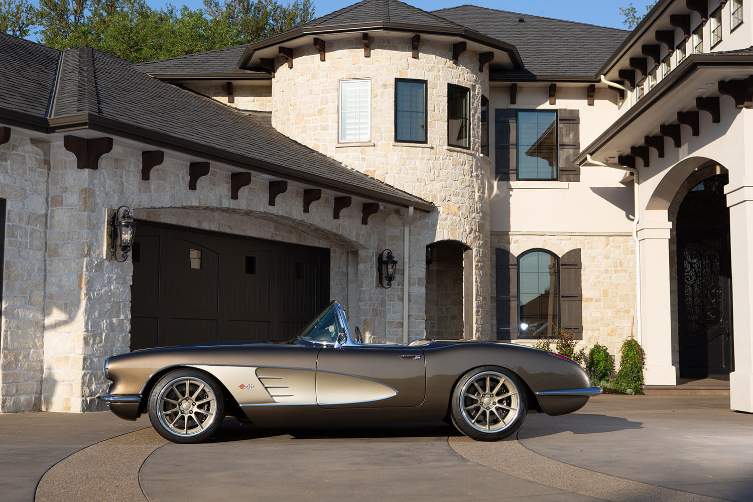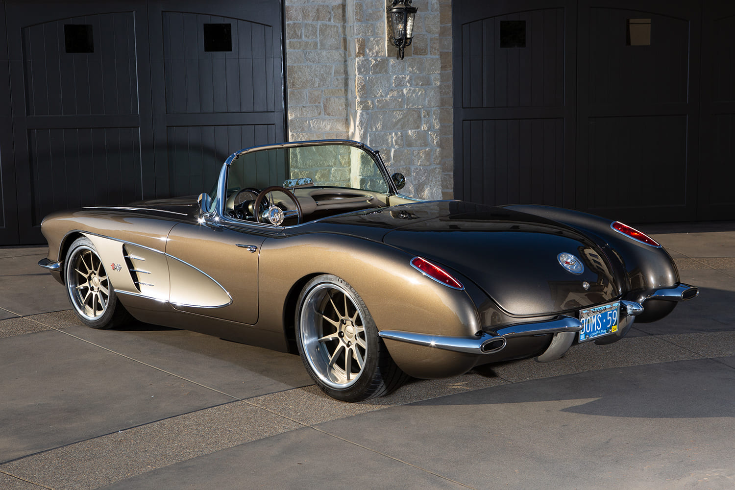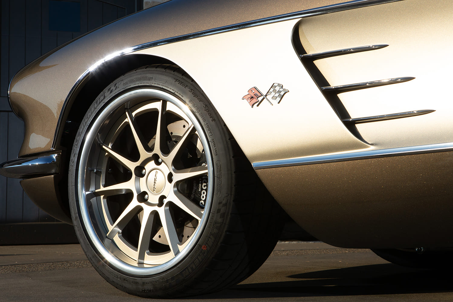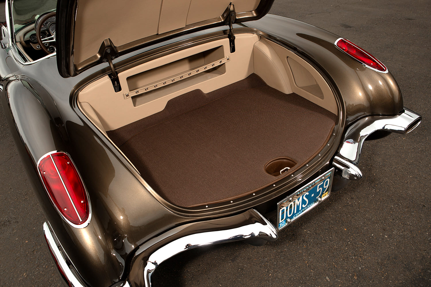 The MetalWorks crew repaired the less-than-perfect prior attempts of bodyworking by meticulously prepping the shell and refining the body lines to perfection before laying down a brilliant coating of Sikkens Zeus Bronze and Champagne Metallic, merging the car with classic style and modern aesthetics. The car retains stock bumpers, grille, and signature Corvette curves, combined with a gas door taillight for a custom touch. It’s the classic 1959 Corvette you know that now stops, steers, and screams like a high-performance, modern-day hot rod.