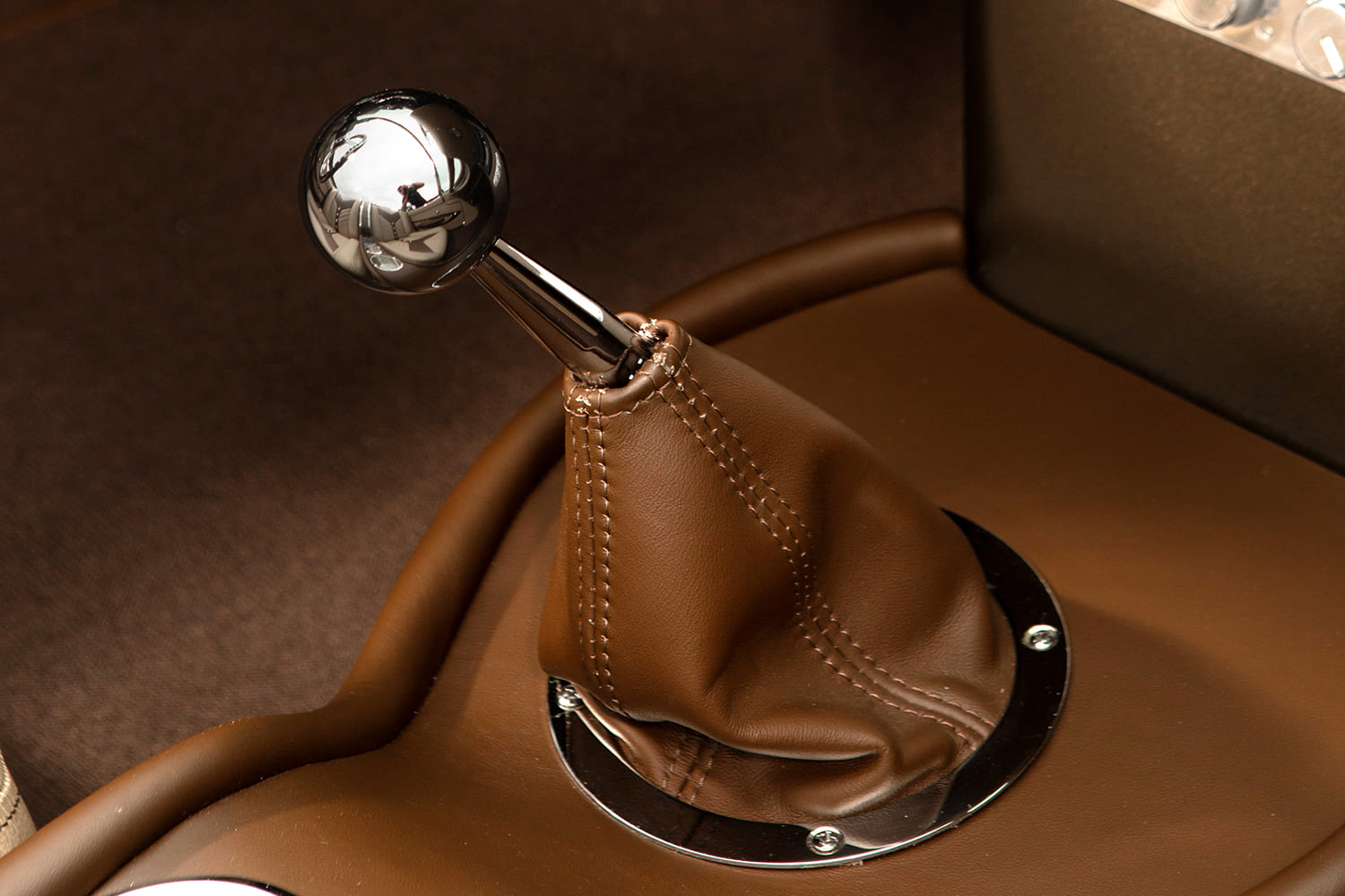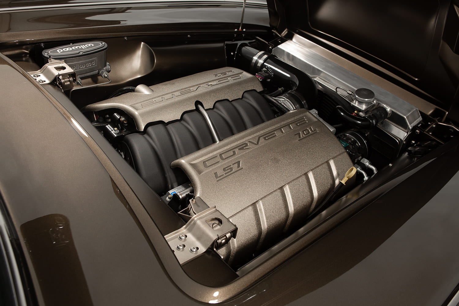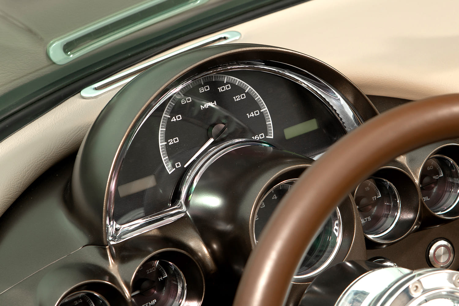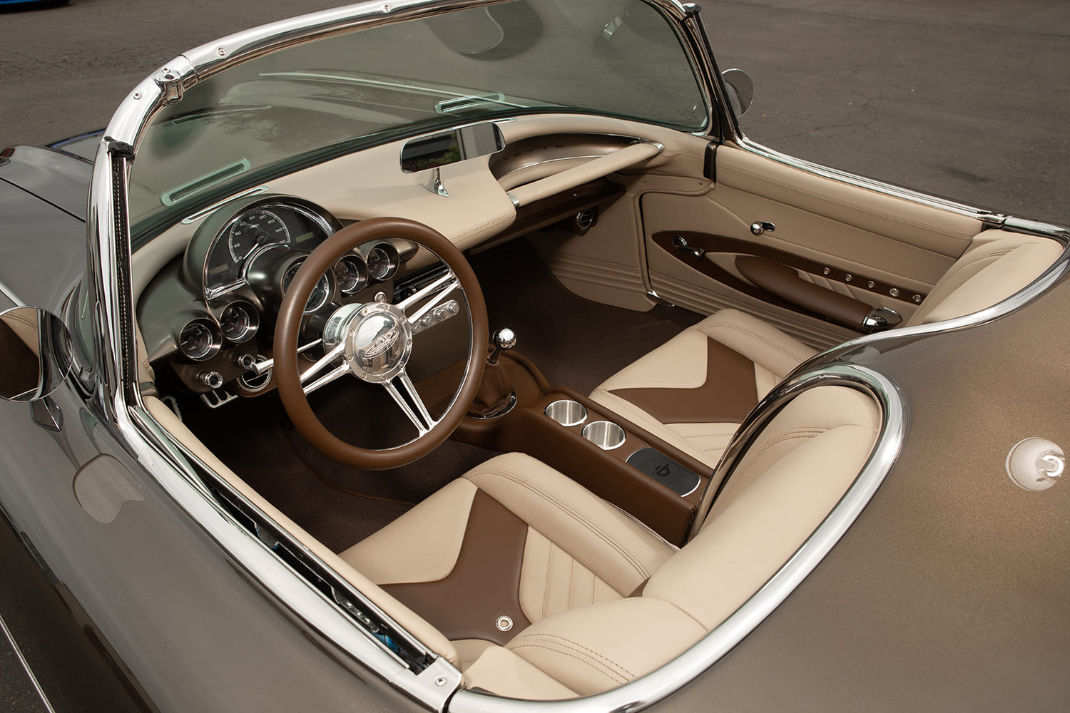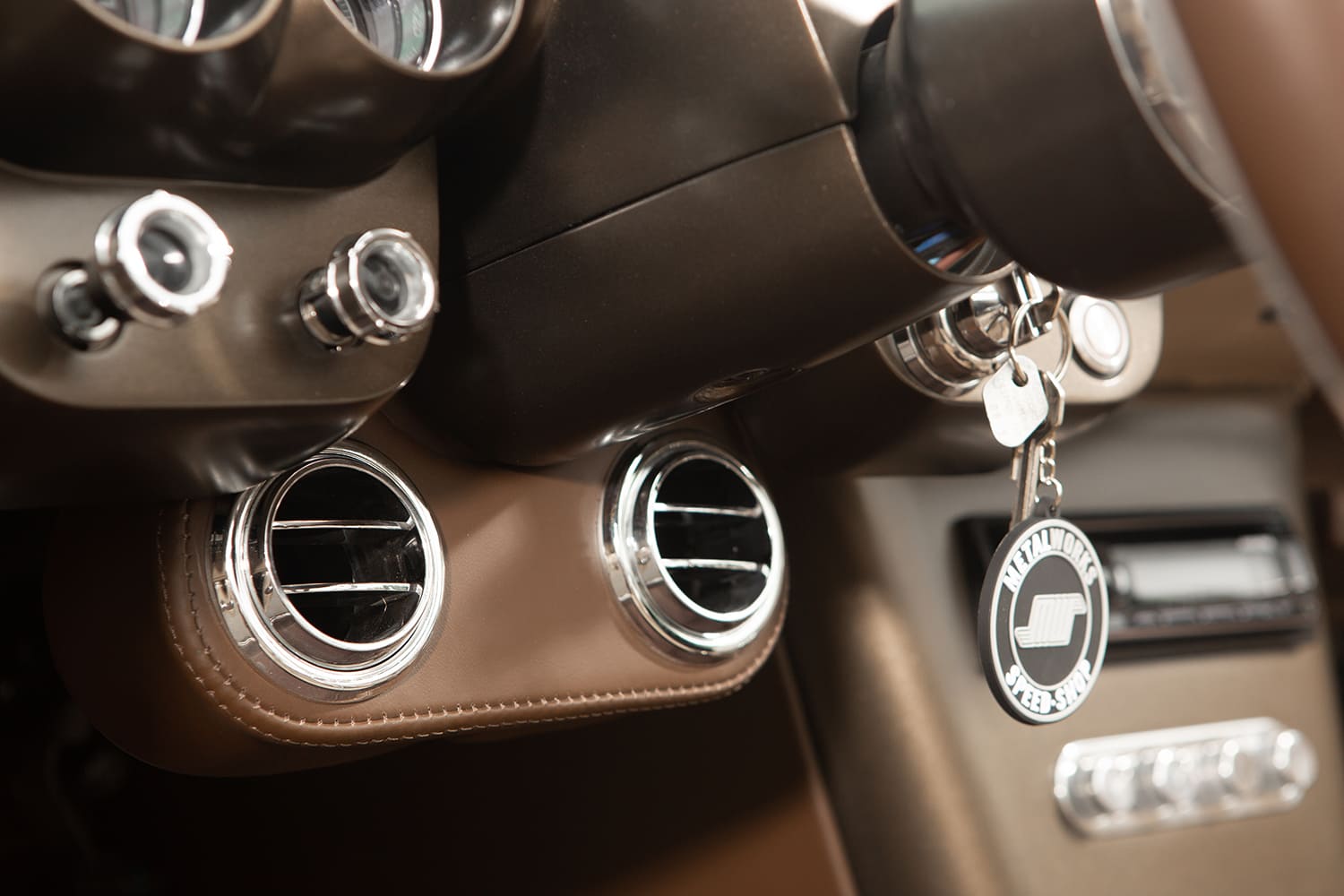Inside, the car is just as meticulously thought out. Coach Industries leather in mocha with chocolate highlights cover custom door panels, a tailored console, and modified stock seats. Daytona weave carpet adds a vintage touch, while Jon Lind Interiors of Springfield, Oregon, handled installation with show-quality craftsmanship. A Budnik steering wheel, custom shifter, and Dakota Digital instrumentation provide the perfect blend of modern tech and classic vibe.